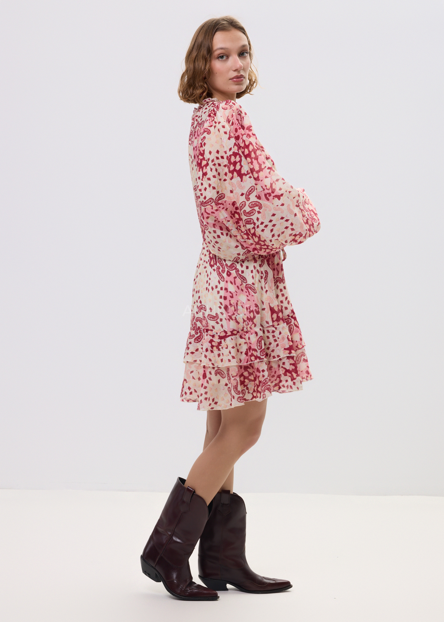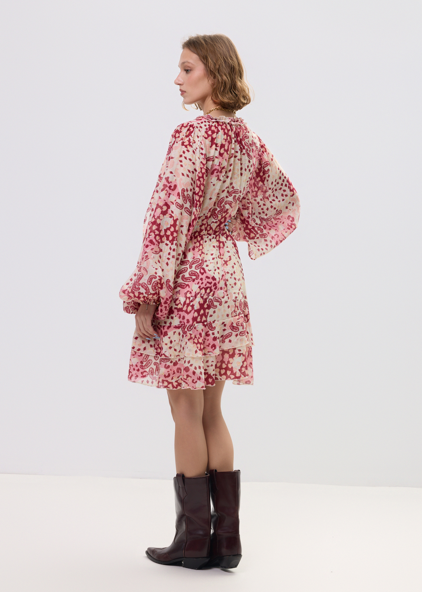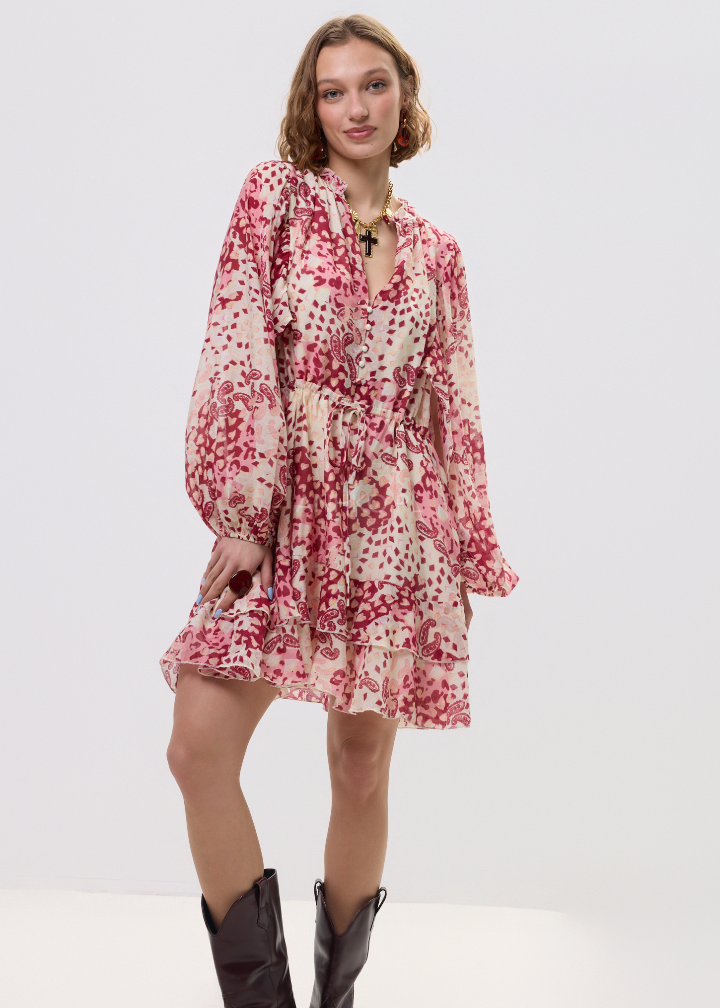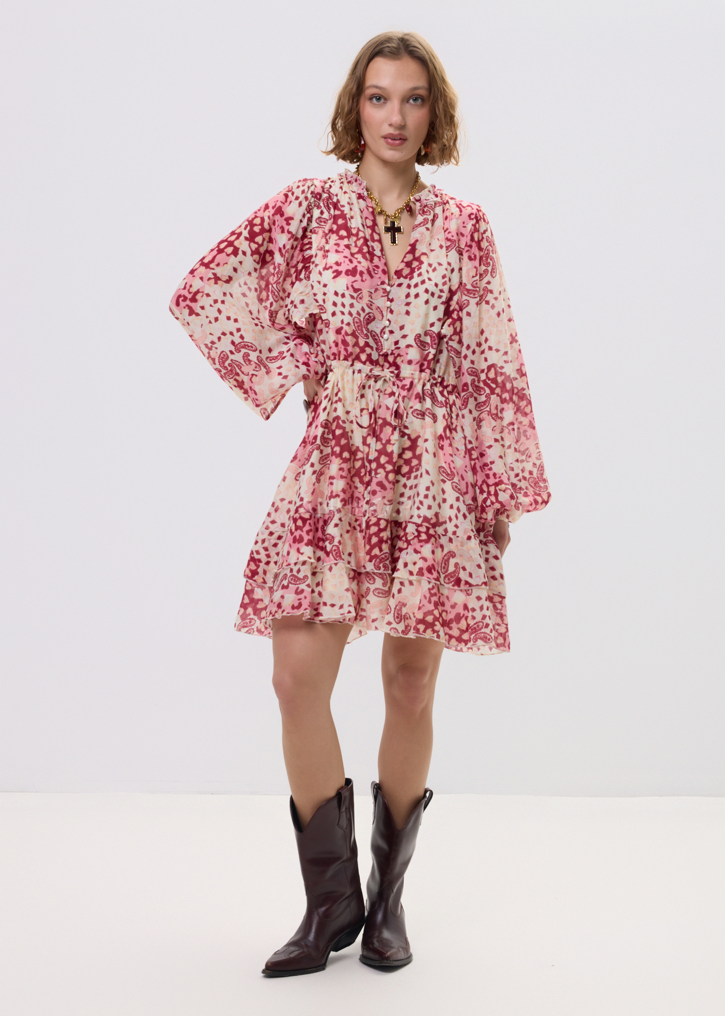 Ta sukienka mini o zwiewnym fasonie miękko układa się na sylwetce, tworząc efekt lekkości i swobody ruchu. Luźna forma w połączeniu z odcięciem pod biustem oraz wiązaniem w talii pozwala subtelnie podkreślić proporcje, zachowując pełen komfort noszenia. Dekolt V optycznie wydłuża szyję, a patchworkowy print przyciąga uwagę i buduje charakter stylizacji.