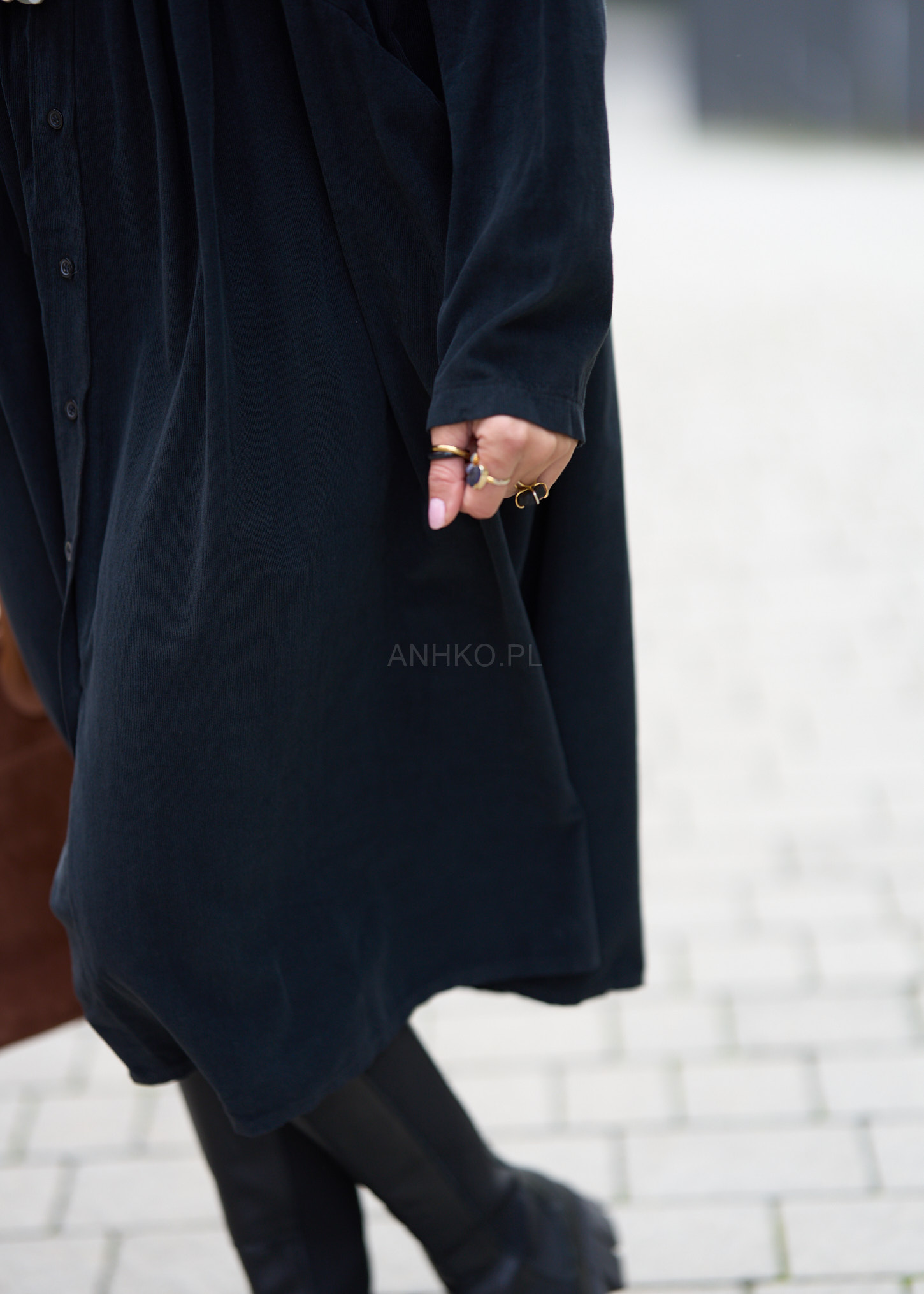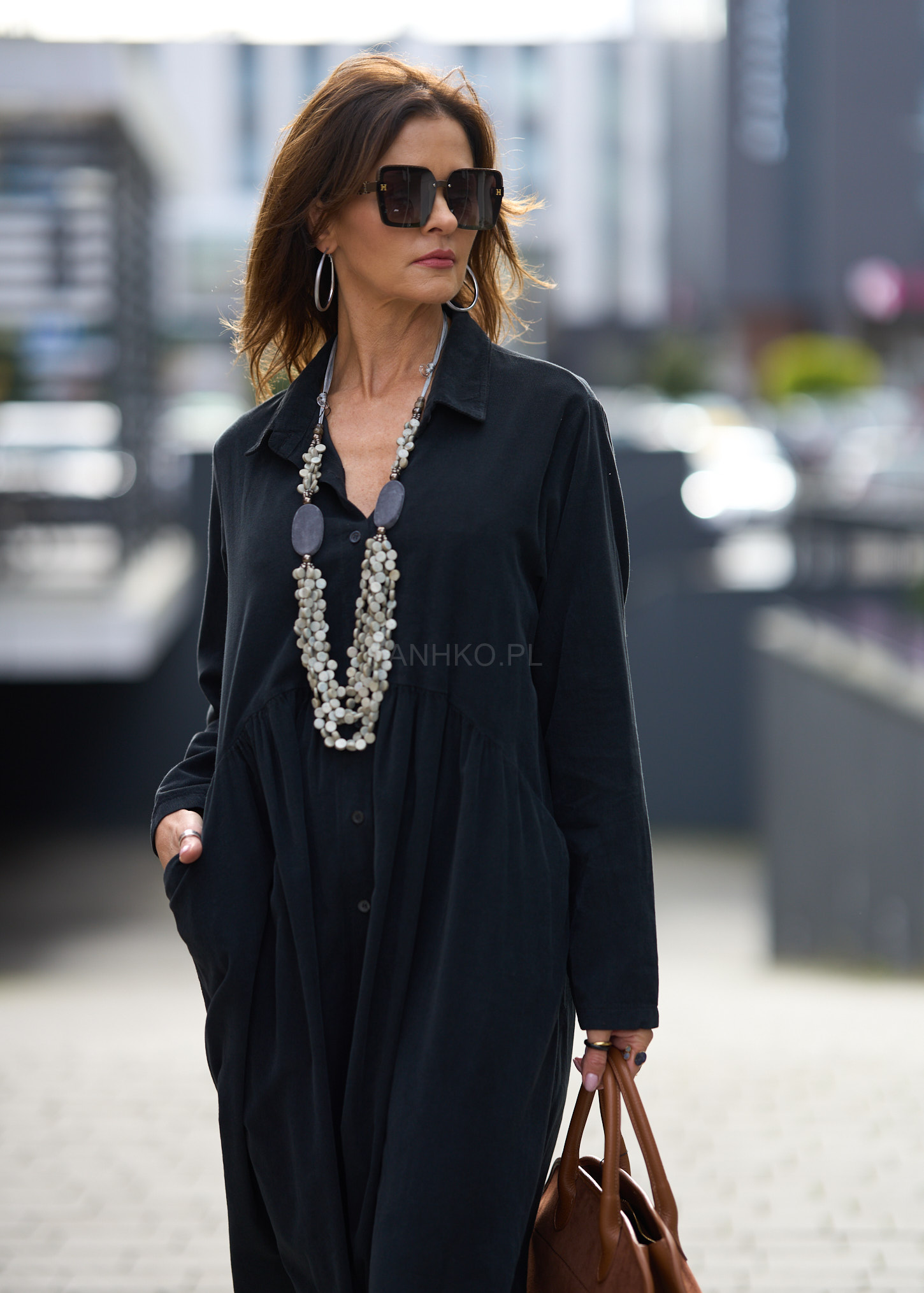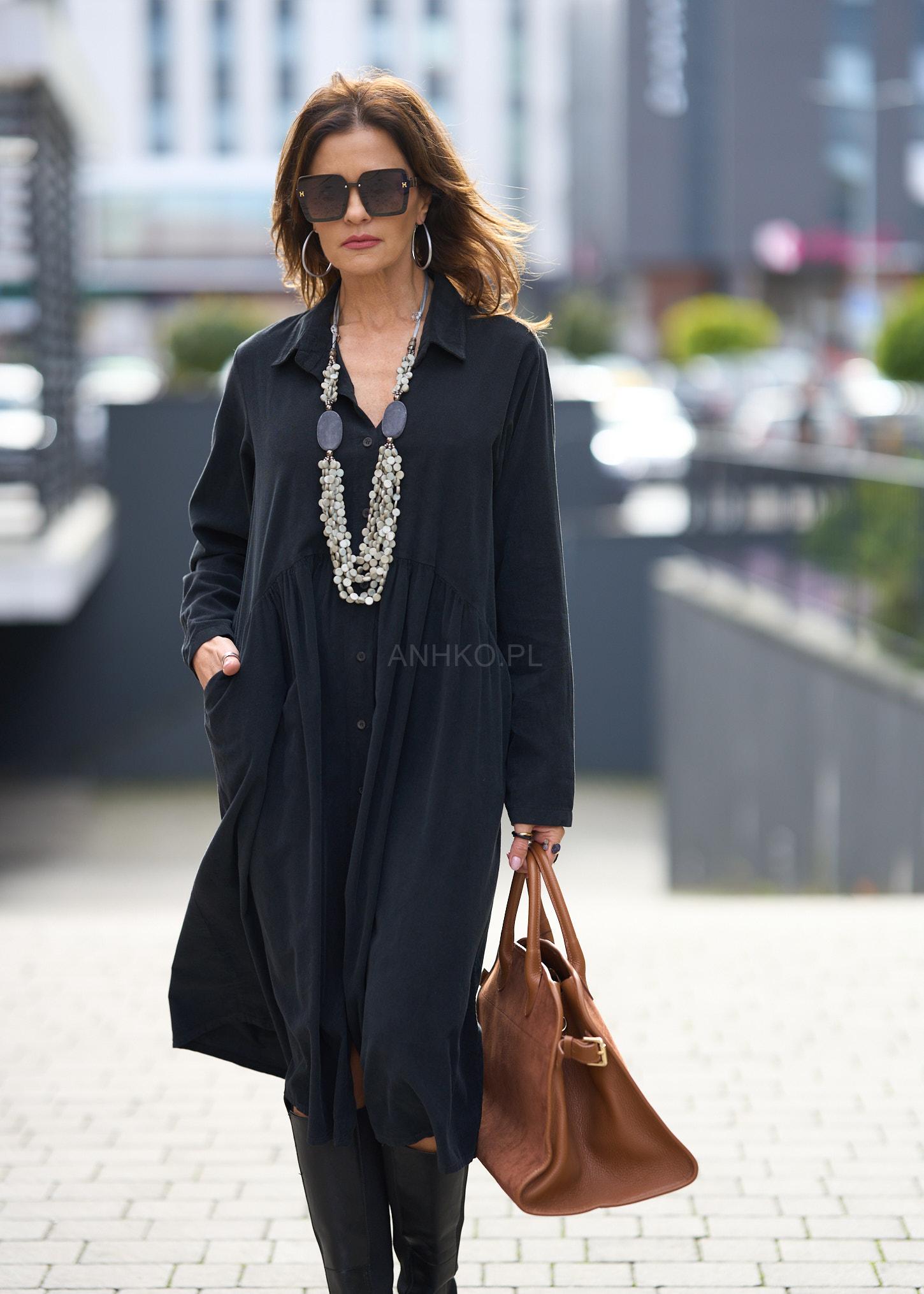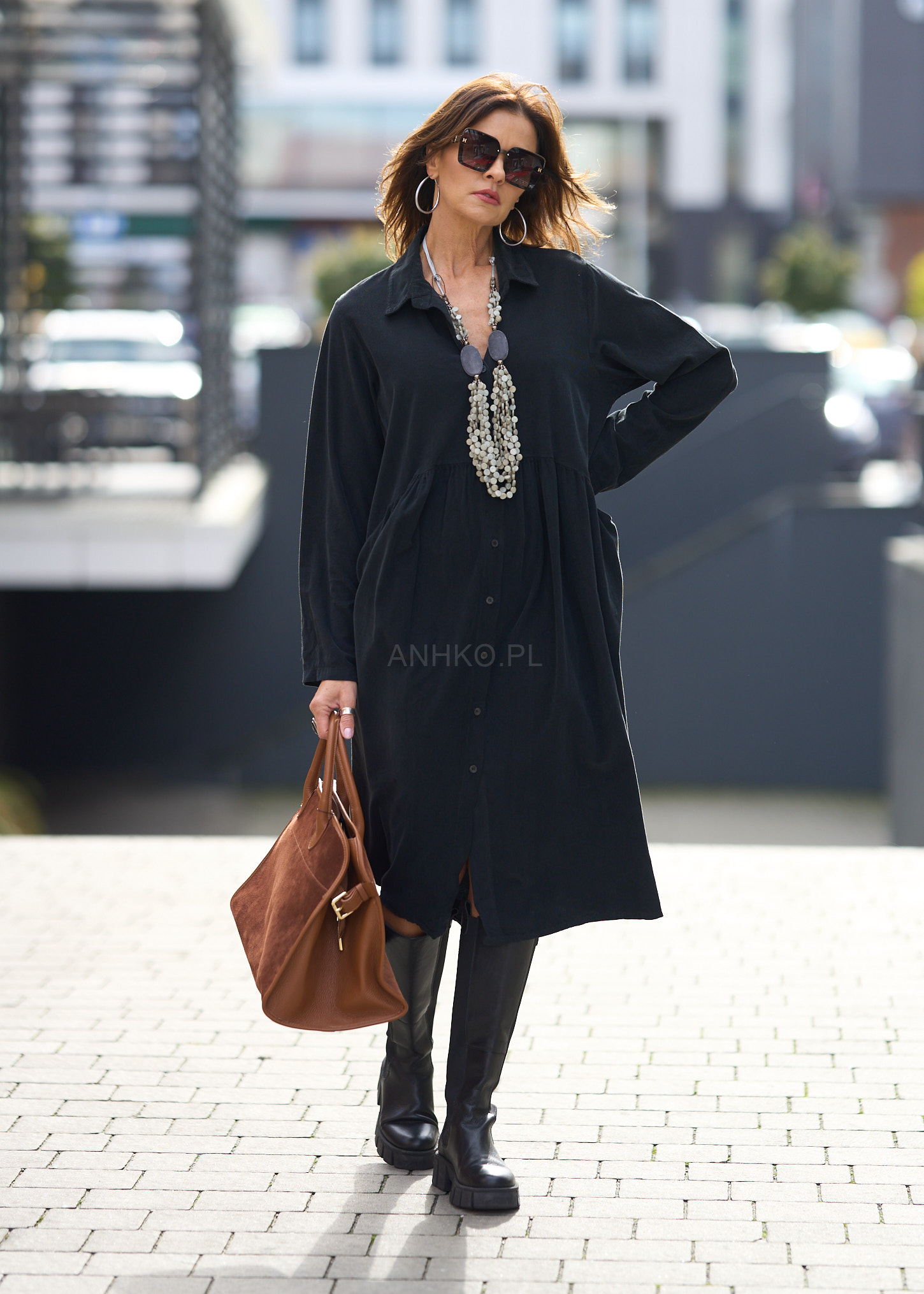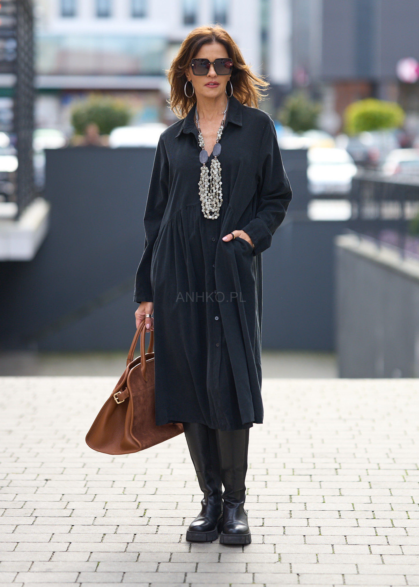 To wyjątkowy model o luźnym, koszulowym kroju wykonany z miękkiego, prążkowanego sztruksu. Zapięcie na guziki na całej długości nadaje jej lekko vintage’owy charakter, a kieszenie po bokach zwiększają komfort noszenia. Model świetnie układa się na sylwetce, zapewniając wygodę i swobodę ruchów. Sprawdzi się zarówno w codziennych stylizacjach z trampkami lub botkami, jak i w bardziej eleganckim wydaniu – z rajstopami i klasycznymi butami. Doskonała propozycja na jesień i zimę, która łączy w sobie prostotę i ponadczasową formę.
