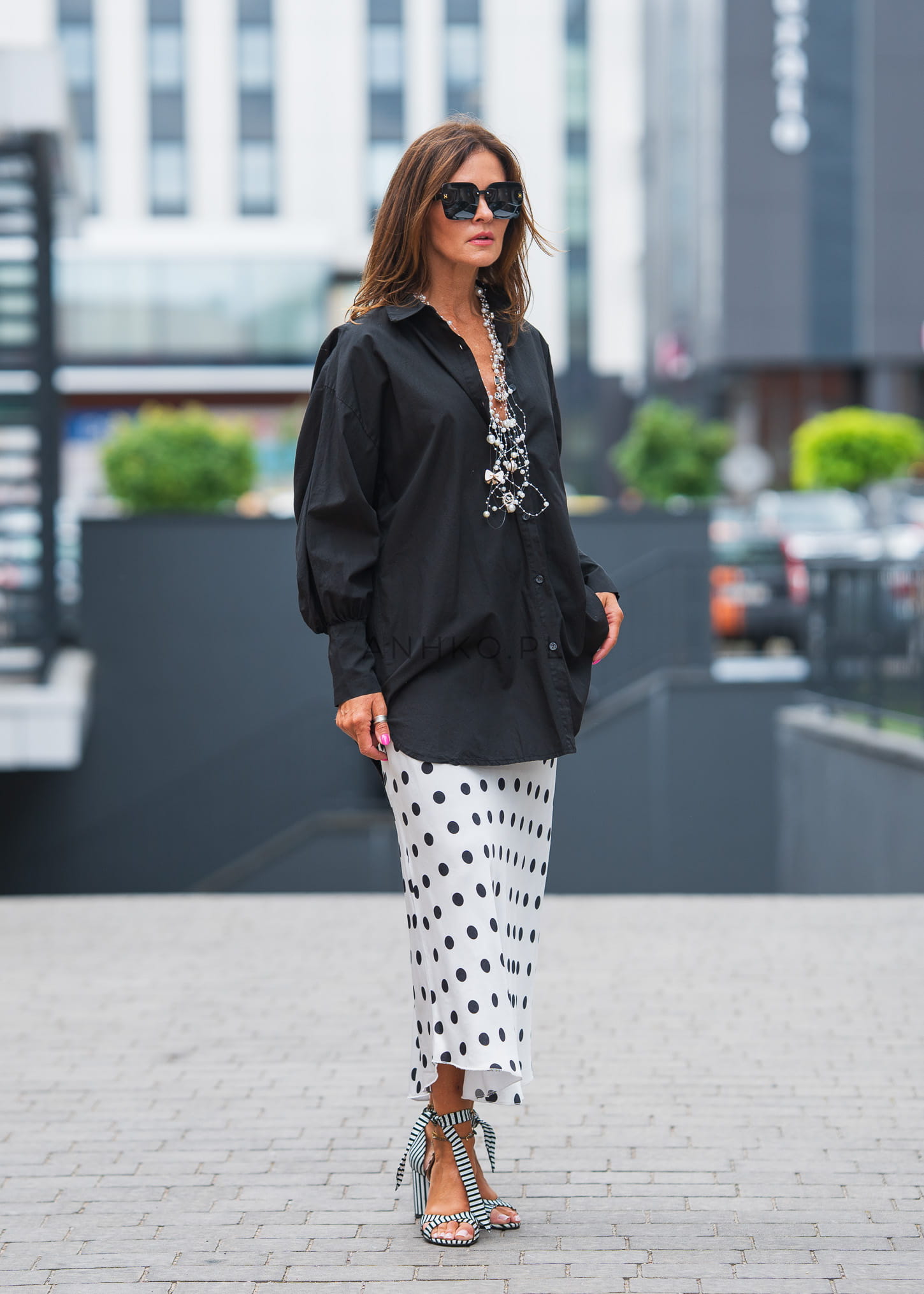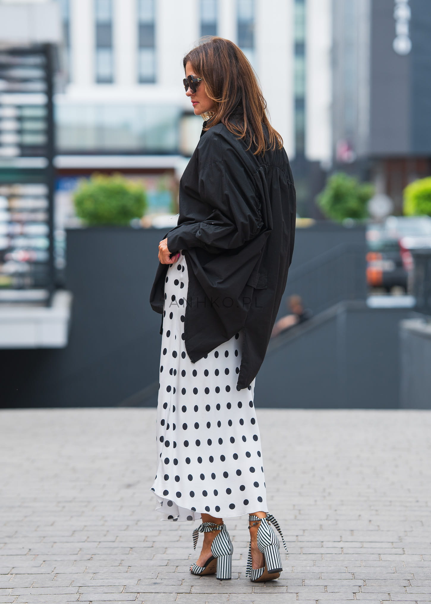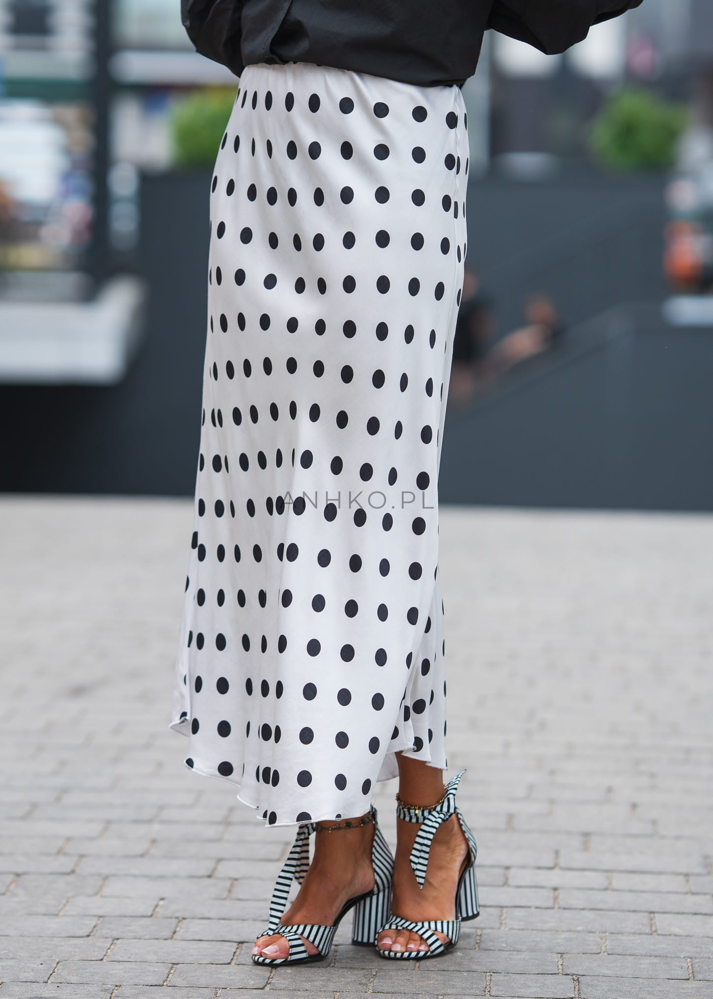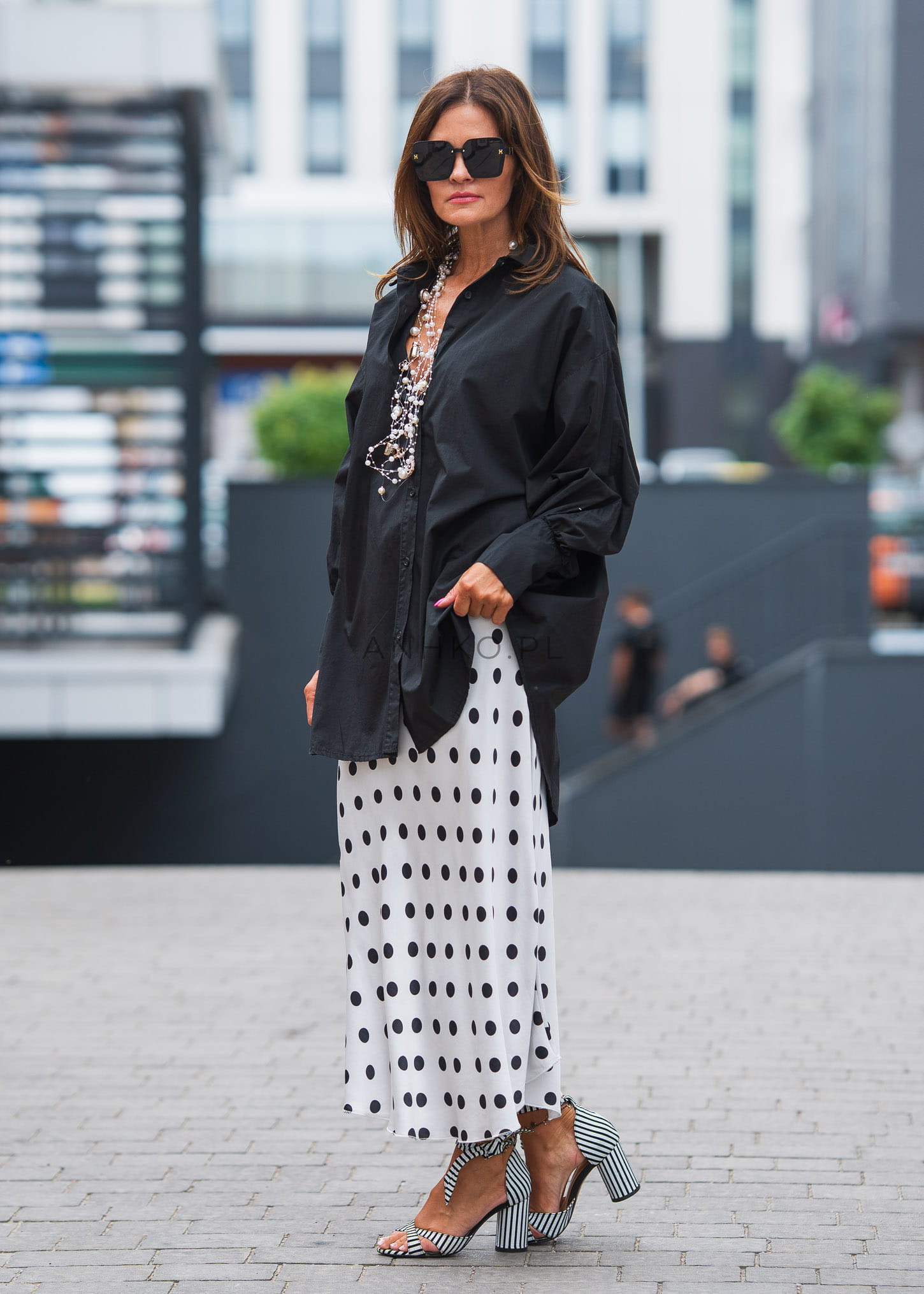 To klasyczna, lekka spódnica midi w ponadczasowy wzór czarnych grochów na białym tle. Jest idealnym wyborem na cieplejsze dni. Świetnie prezentuje się zarówno z t-shirtem i trampkami, jak i z elegancką bluzką i sandałami. Sprawdzi się na co dzień, do pracy, na spacer czy spotkania w mieście. To must-have w każdej kobiecej garderobie – stylowa, wygodna i zawsze modna.