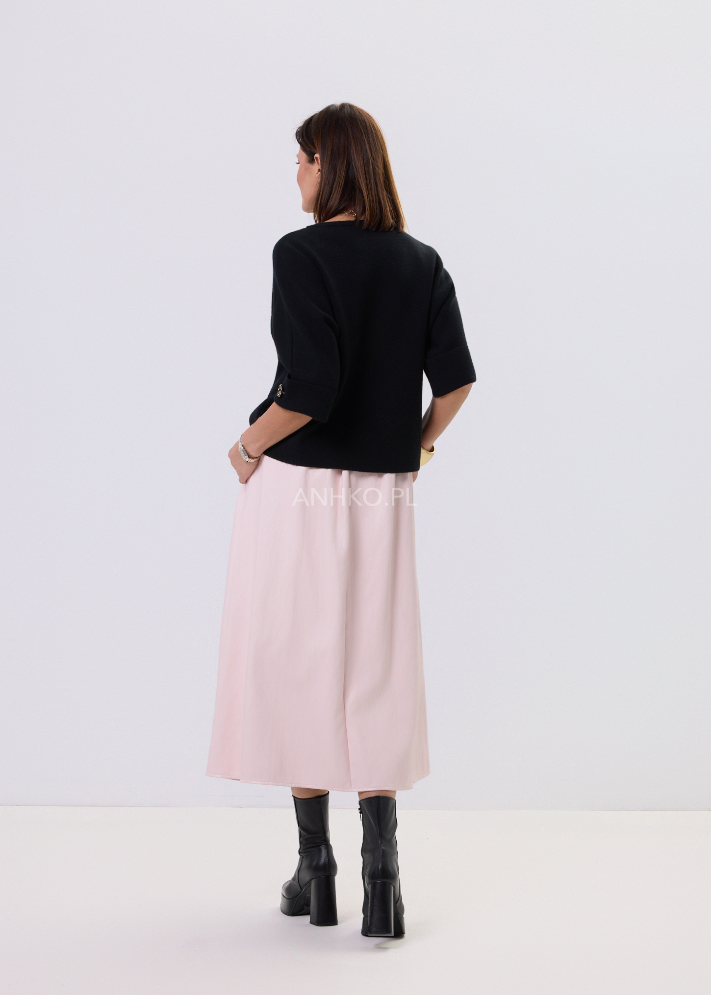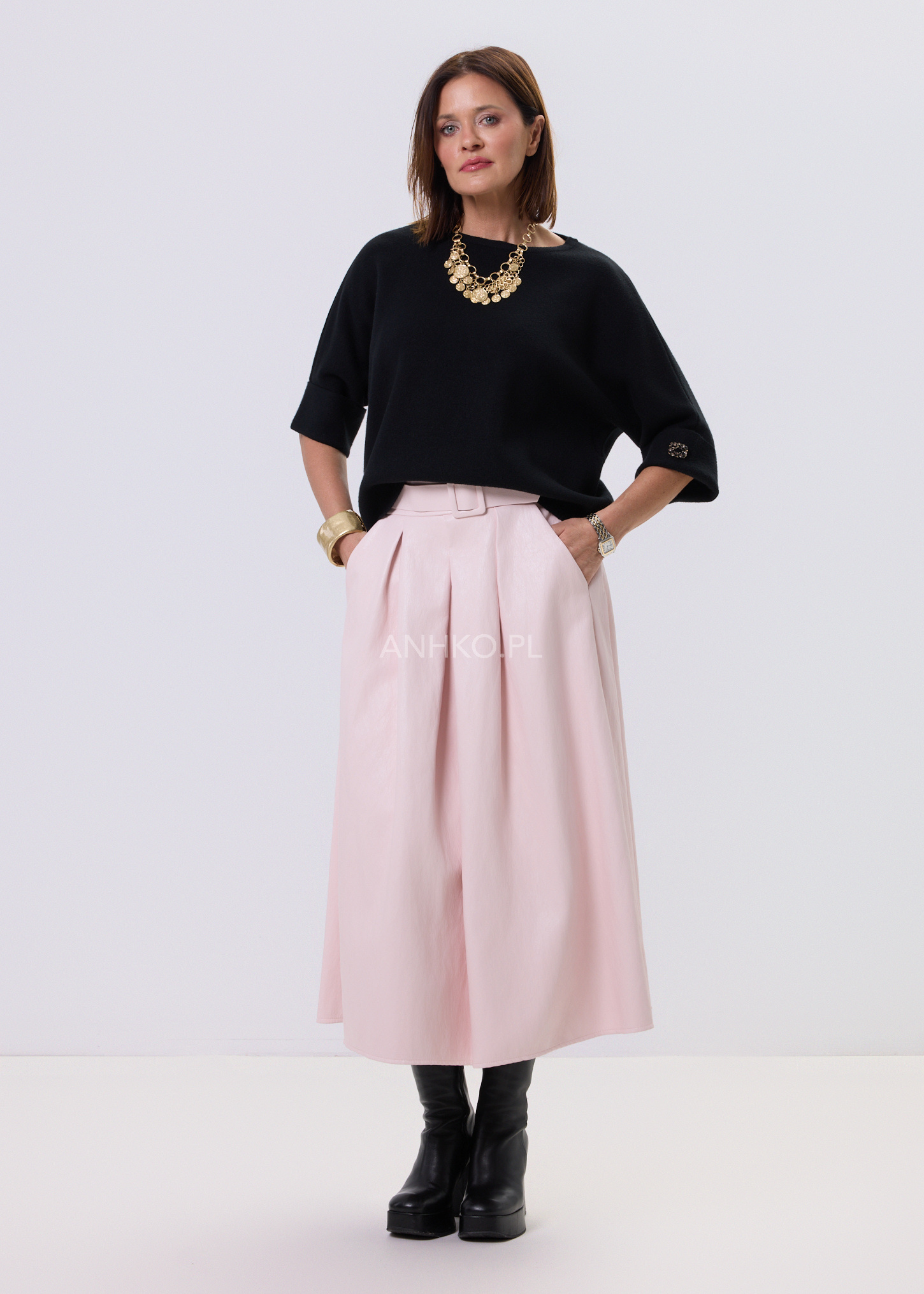 Spódnica Castro Pudrowo Różowa - Różowa spódnica midi o rozkloszowanym kroju to lekka, wygodna propozycja na co dzień. Wysoki stan z elastyczną gumą i ozdobnym paskiem dodaje charakteru i podkreśla talię.