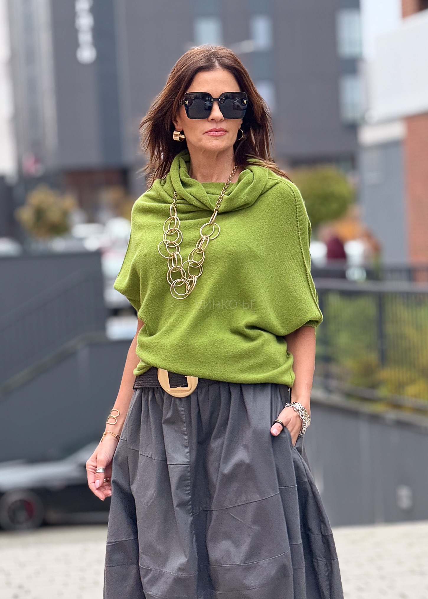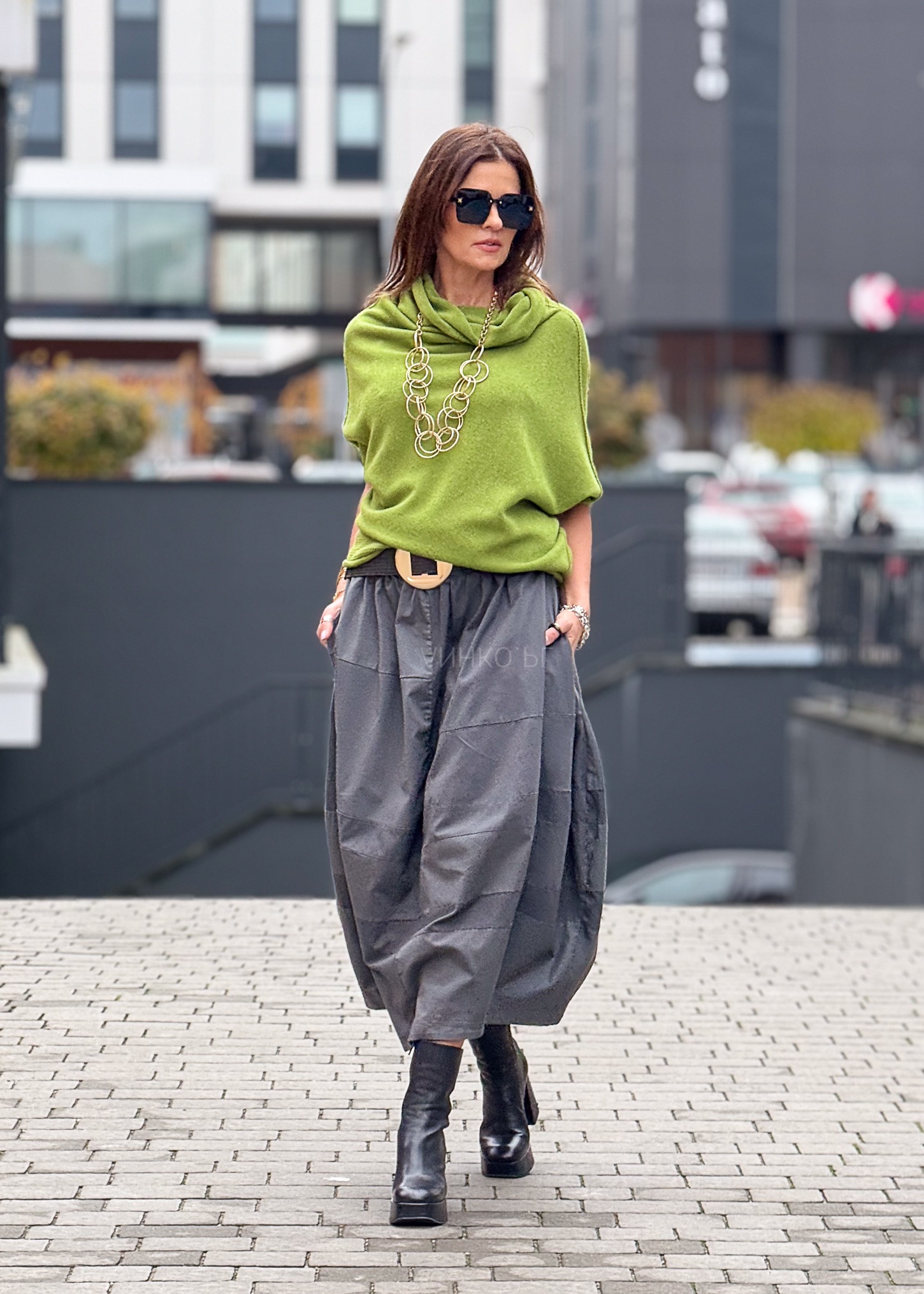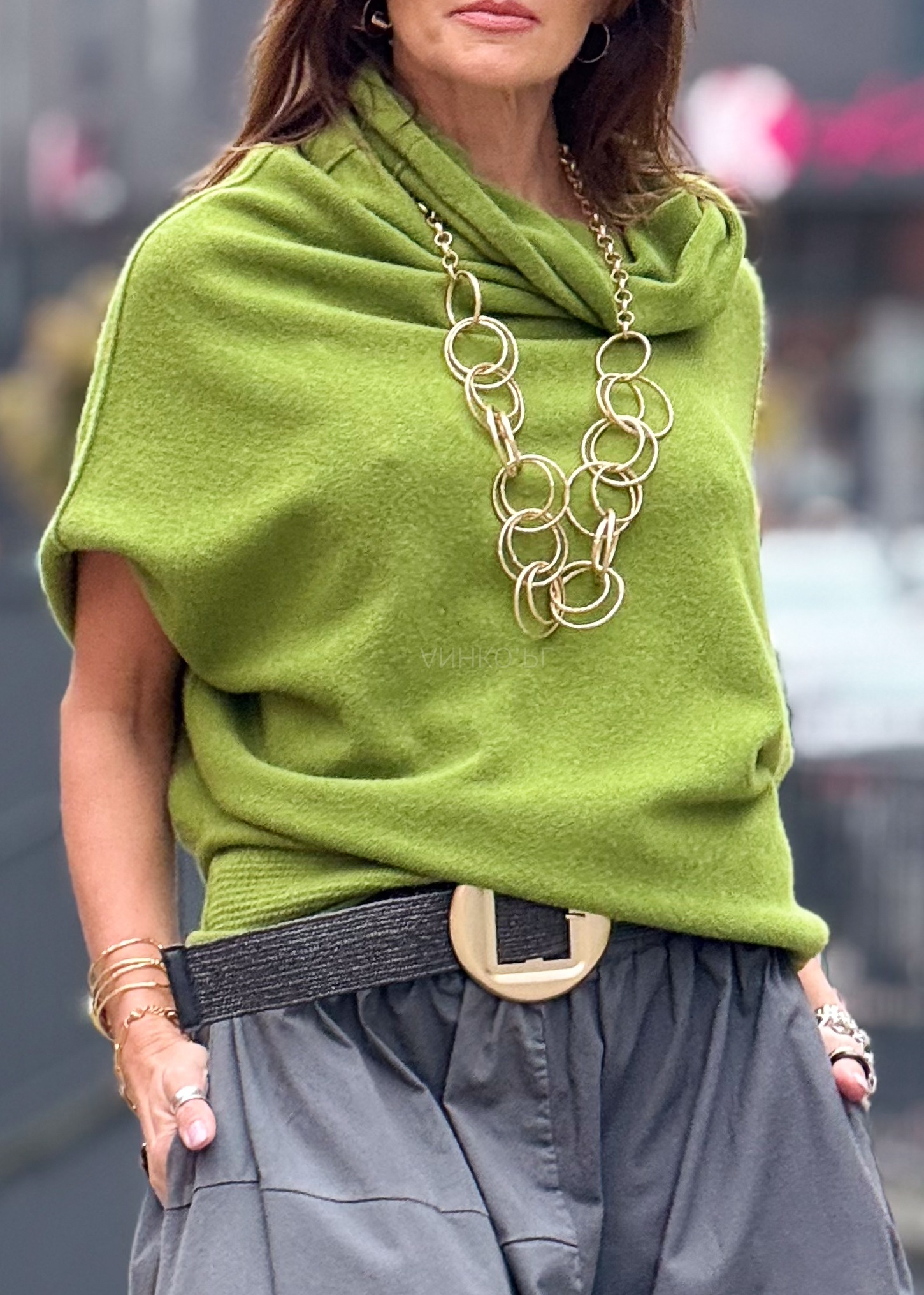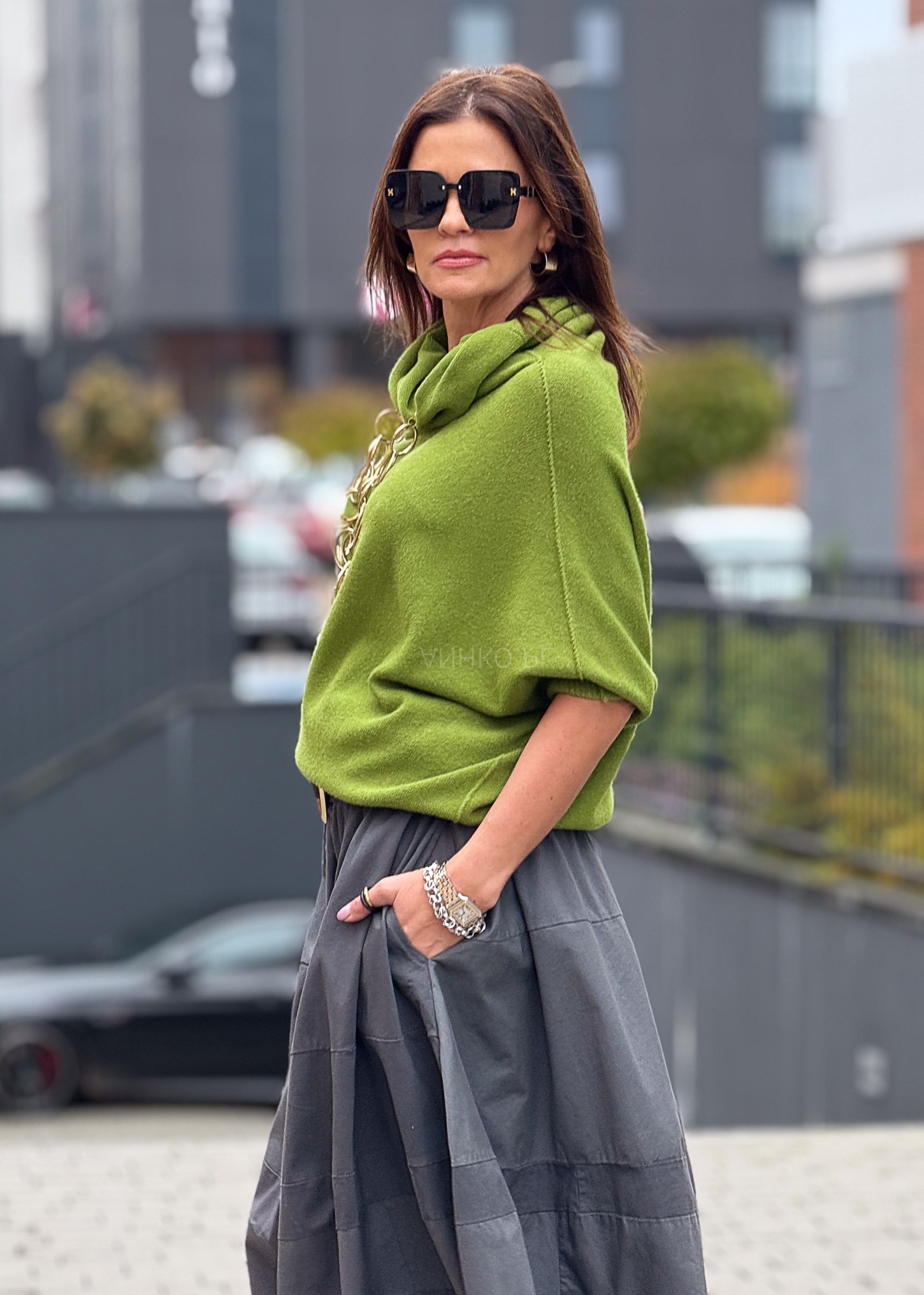 - Kolor: Jasnozielony – świeży, wyrazisty akcent stylizacji.
