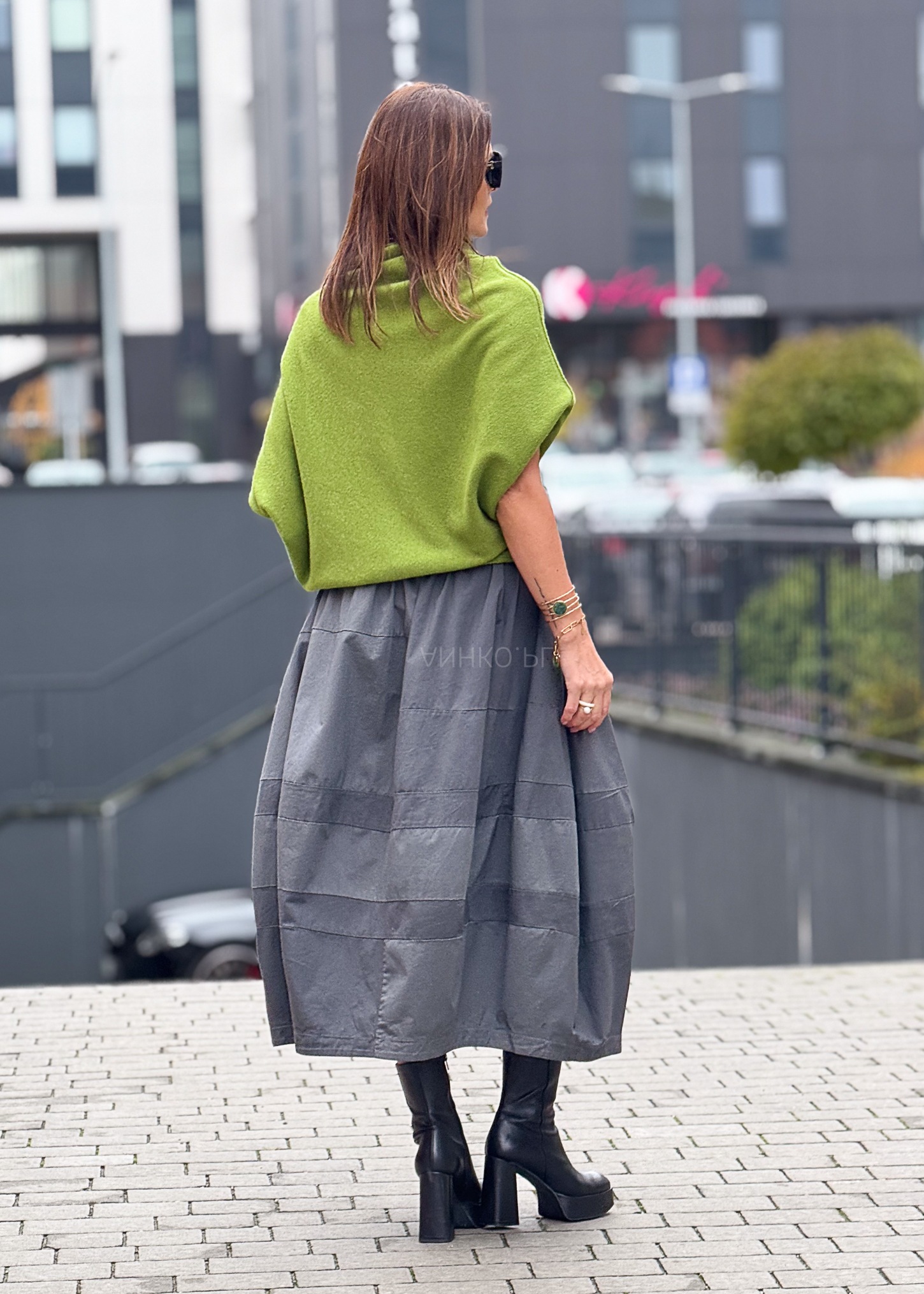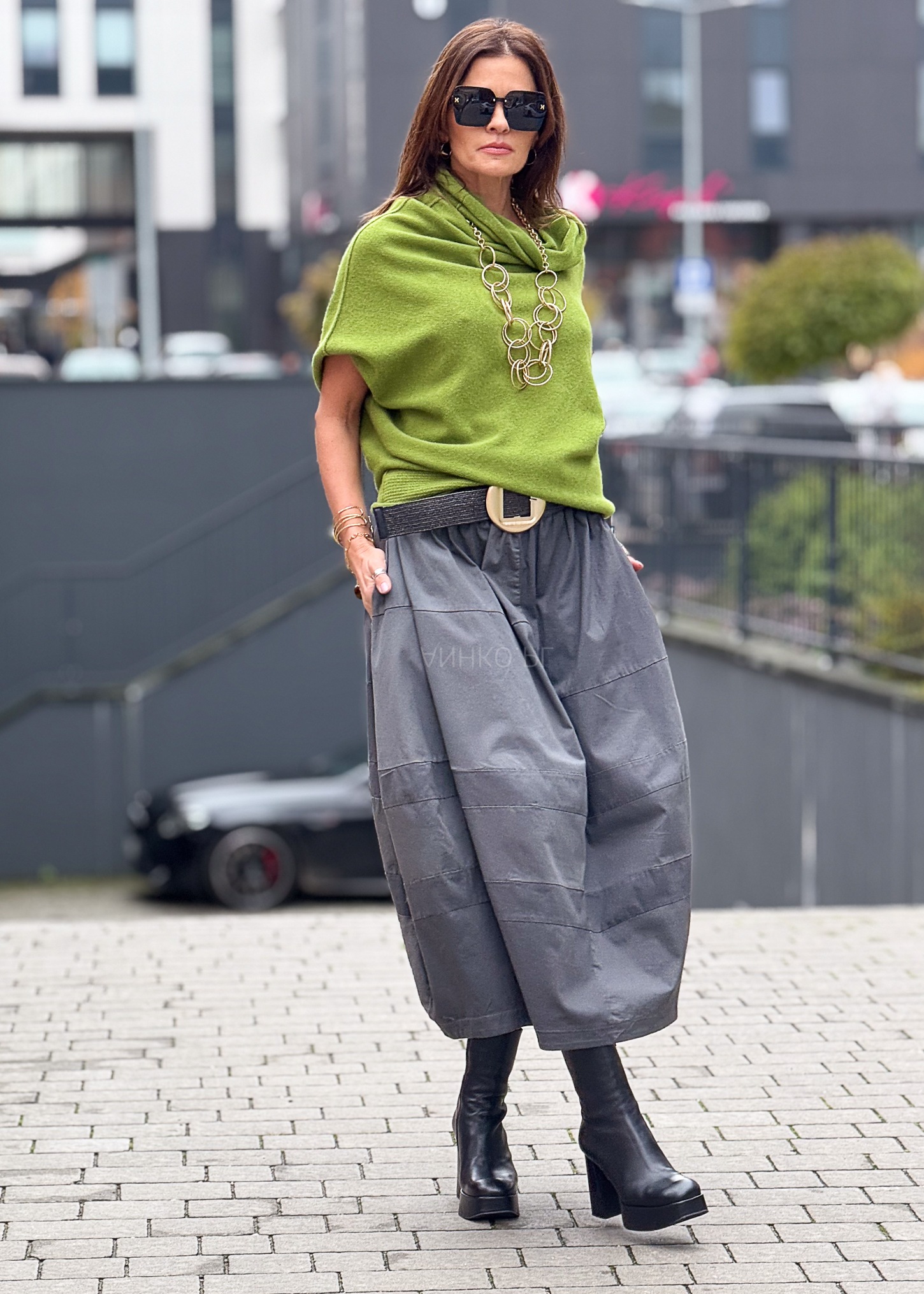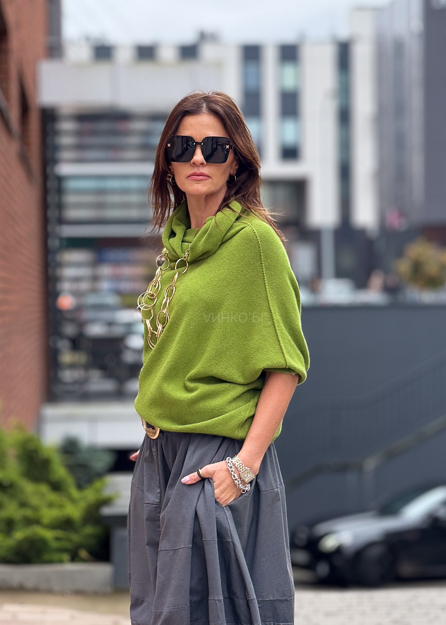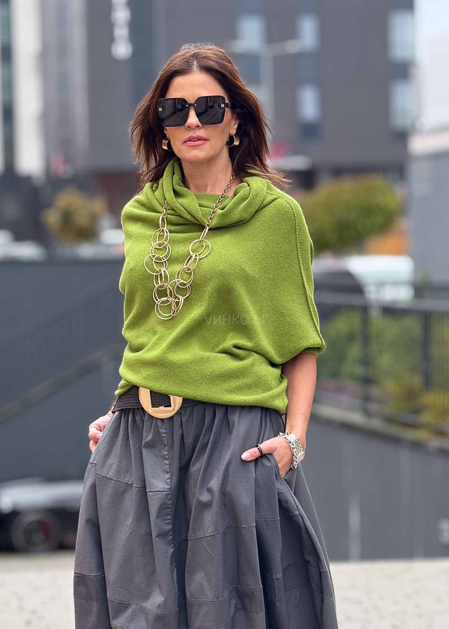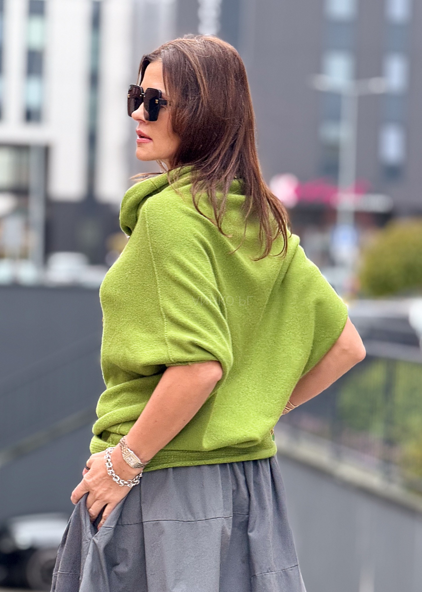 - Kolor: Jasnozielony – świeży, wyrazisty akcent stylizacji.