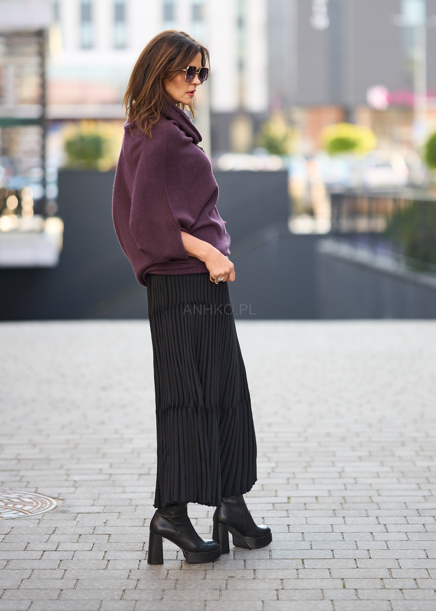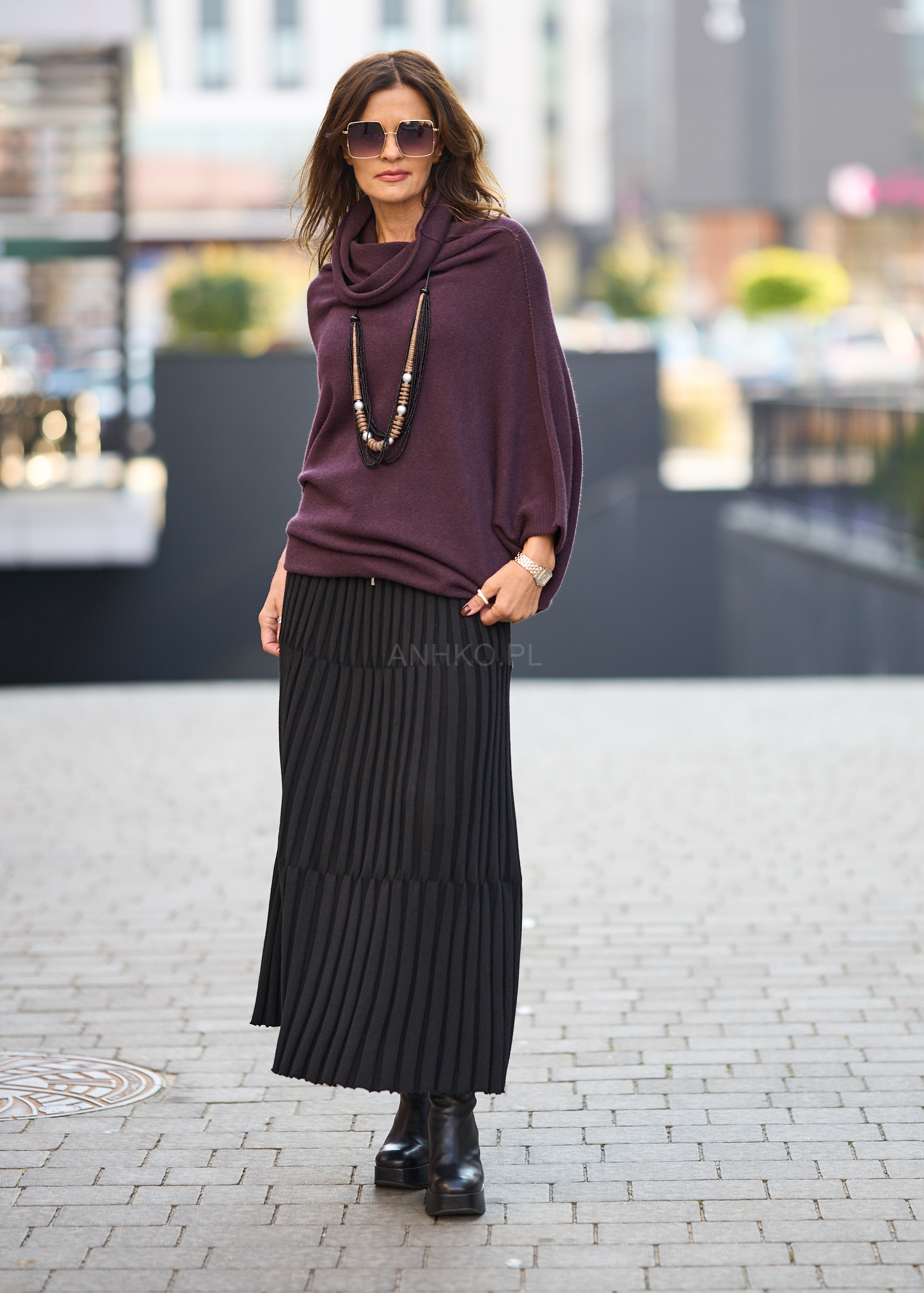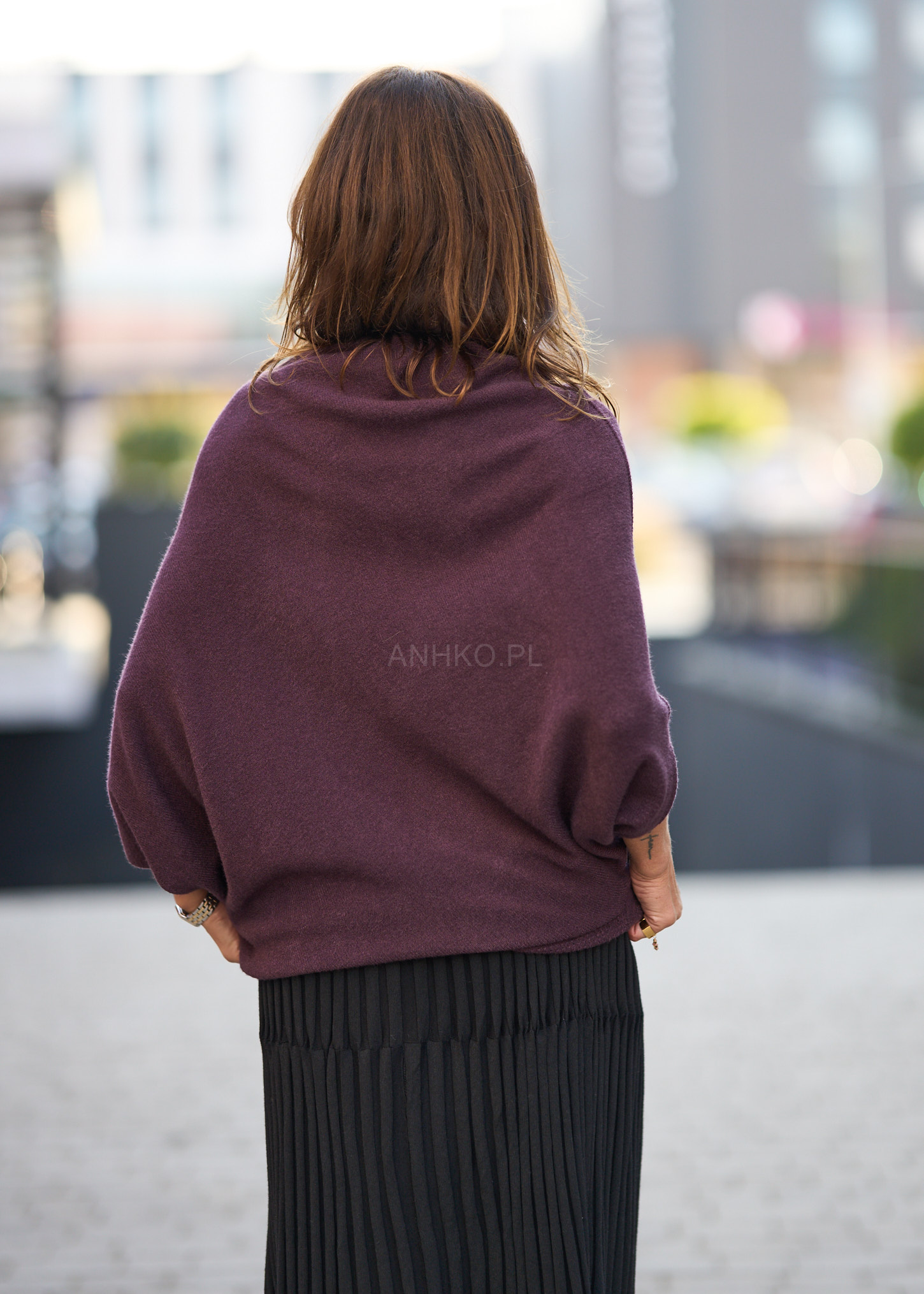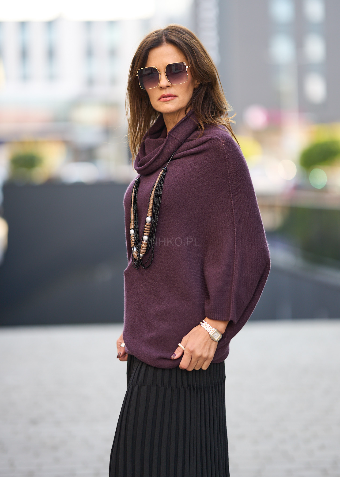 Głęboki śliwkowy odcień przyciąga uwagę i dodaje stylizacji charakteru, a szeroki kołnierz typu komin otula szyję, tworząc efekt miękkiej objętości. Przyjemna w dotyku dzianina sprawia, że model idealnie wpisuje się w codzienne stylizacje – od miejskich zestawów po bardziej eleganckie kombinacje.