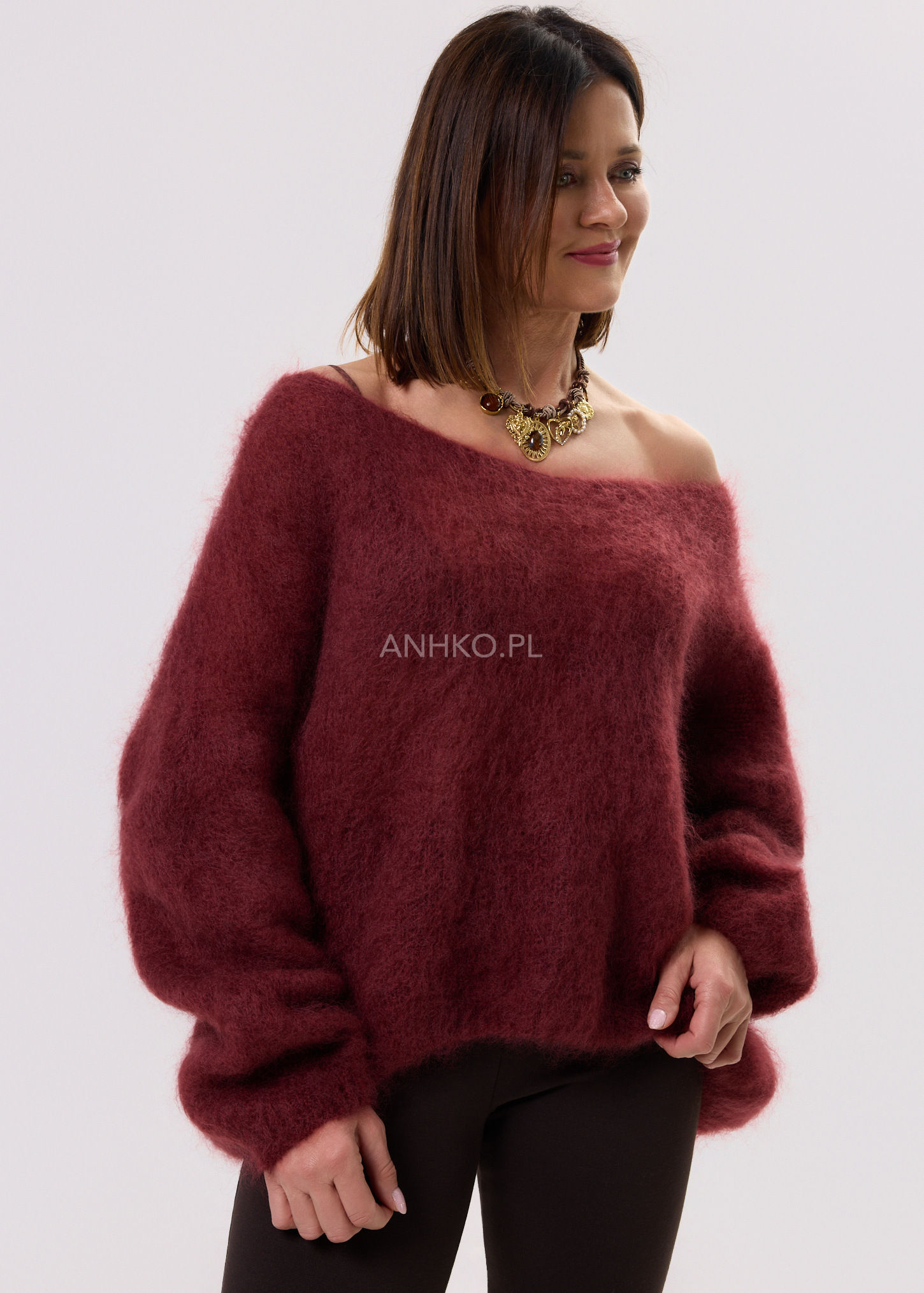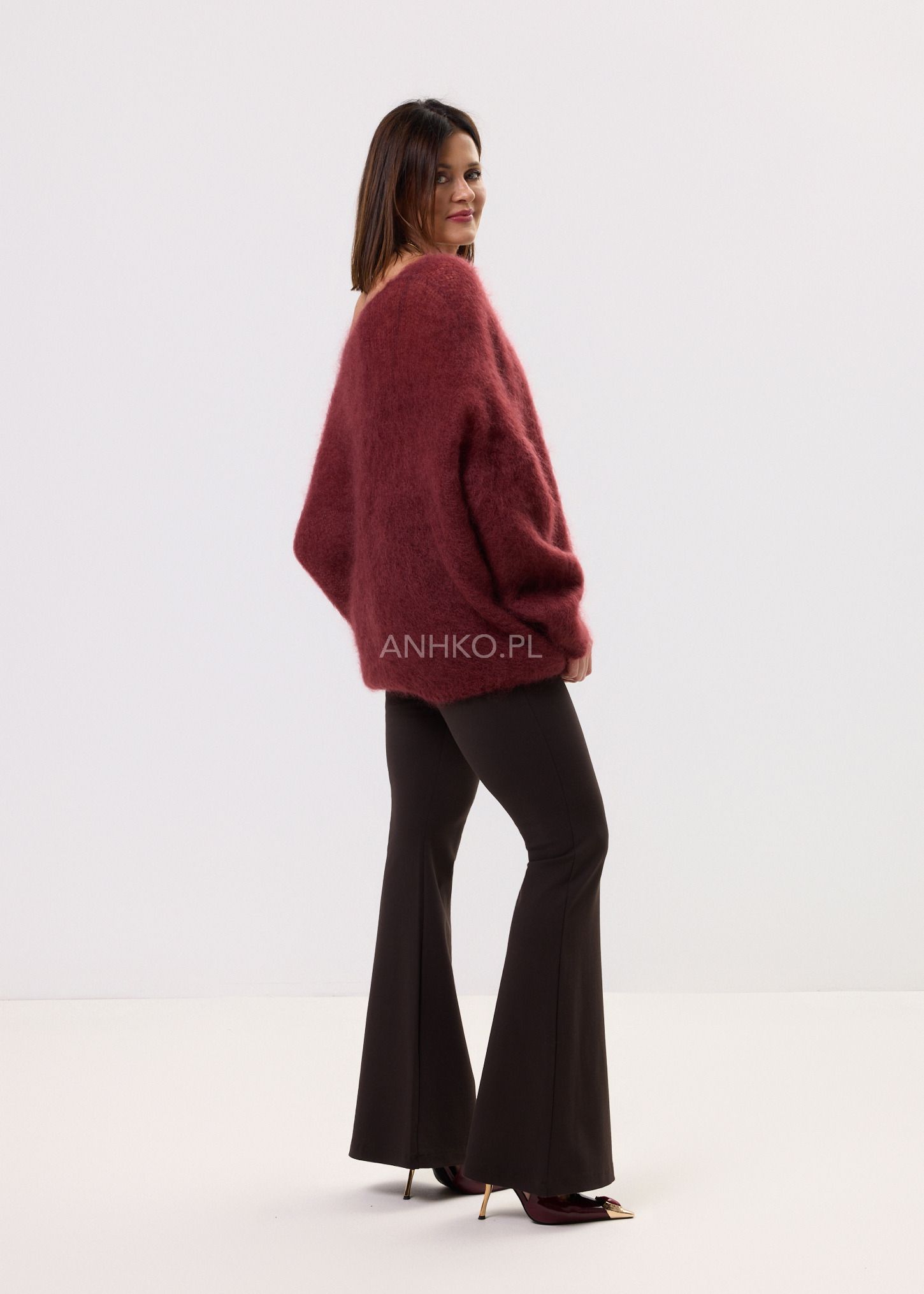 Ten sweter damski oversize z wyraźnym dekoltem V miękko opływa sylwetkę, tworząc efekt swobodnej, nonszalanckiej linii. Luźny fason z szerokimi rękawami i delikatnie wydłużonym tyłem sprawia, że model pięknie układa się w ruchu i pozwala budować warstwowe stylizacje. Głęboki odcień bordo podkreśla charakter całości i świetnie kontrastuje z czernią, denimem czy beżami.
