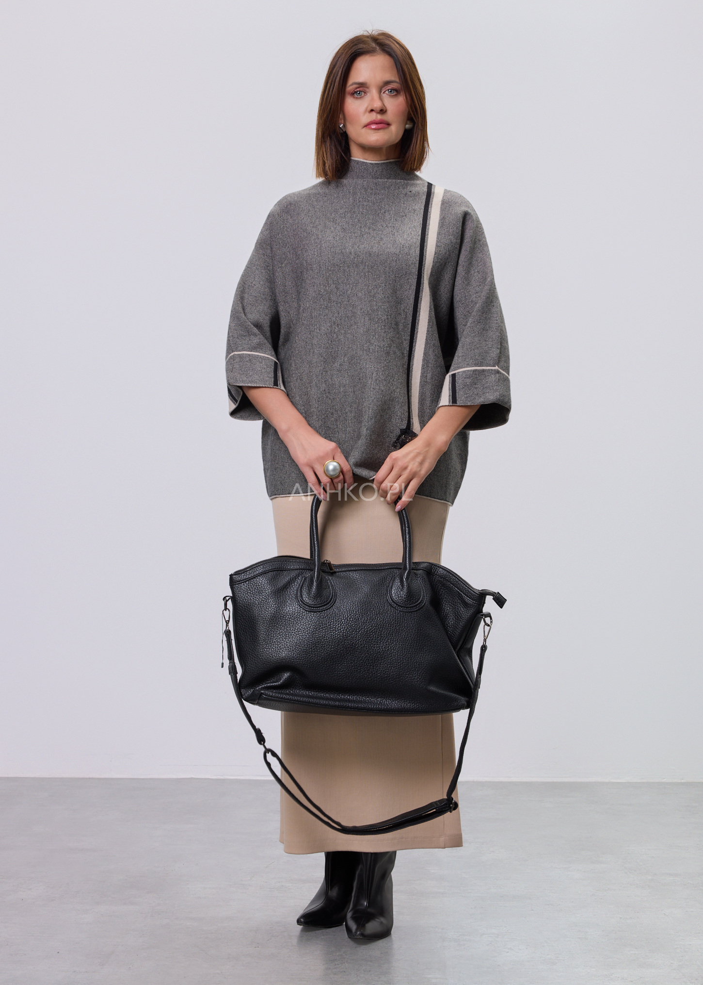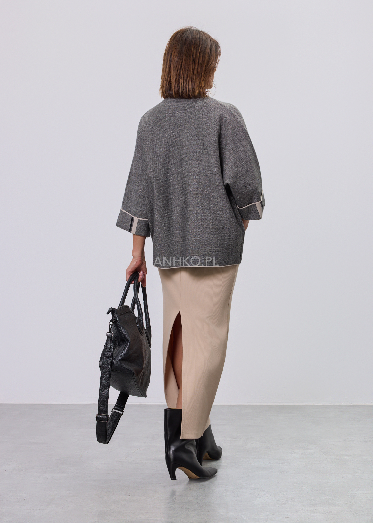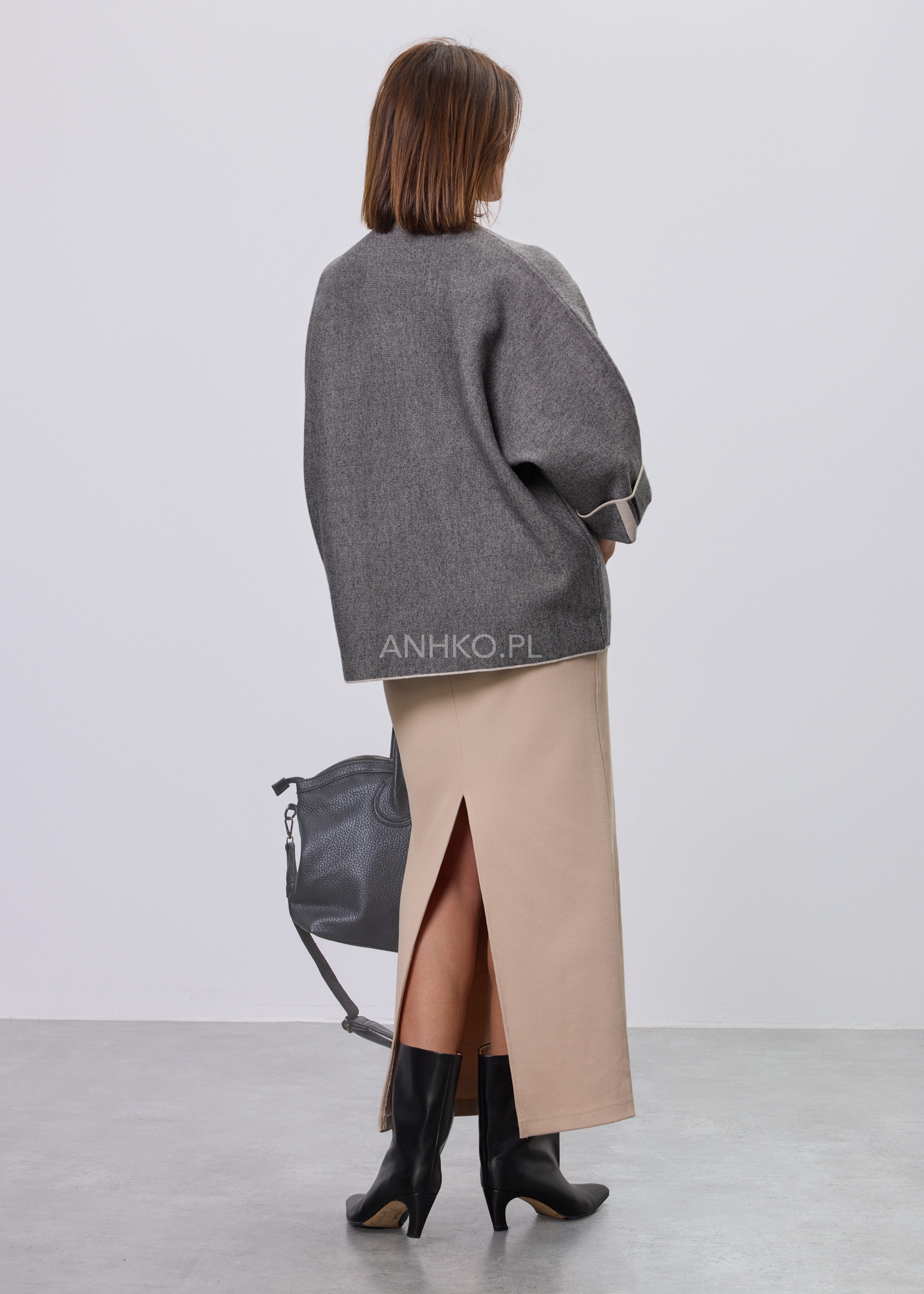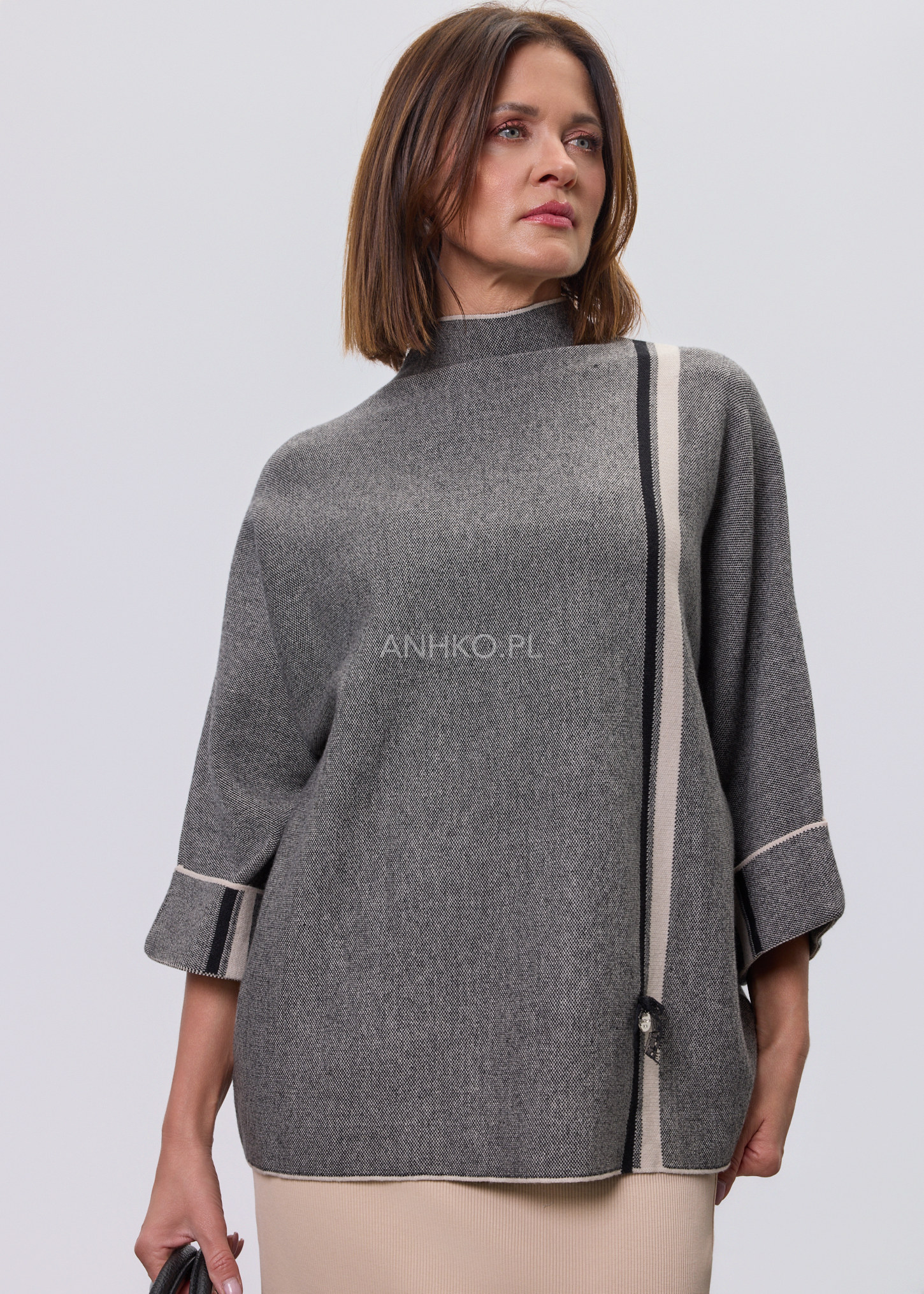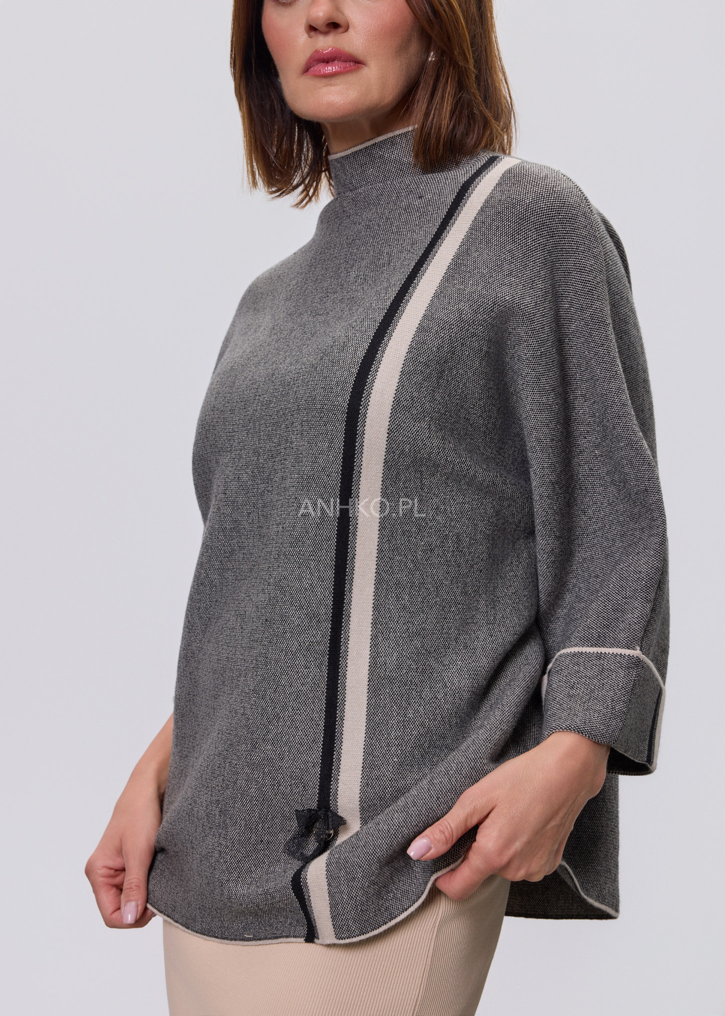 Stylowy sweter damski o luźnym kroju to idealna propozycja dla kobiet ceniących wygodę i nowoczesny design. Sweter miękko układa się na sylwetce, zapewniając komfort noszenia przez cały dzień. Charakterystycznym elementem modelu jest dekoracyjna pionowa linia umieszczona na plecach, zakończona ozdobnym zapięciem, która nadaje całości modowego, wyrafinowanego charakteru. Model nie posiada kieszeni, podszewki ani halki, dzięki czemu zachowuje lekkość i swobodę. Sweter doskonale sprawdzi się zarówno w codziennych stylizacjach z jeansami lub spodniami materiałowymi, jak i w bardziej eleganckich zestawach z ołówkową spódnicą czy prostymi spodniami, na spotkania, do pracy lub wyjścia wieczorne.