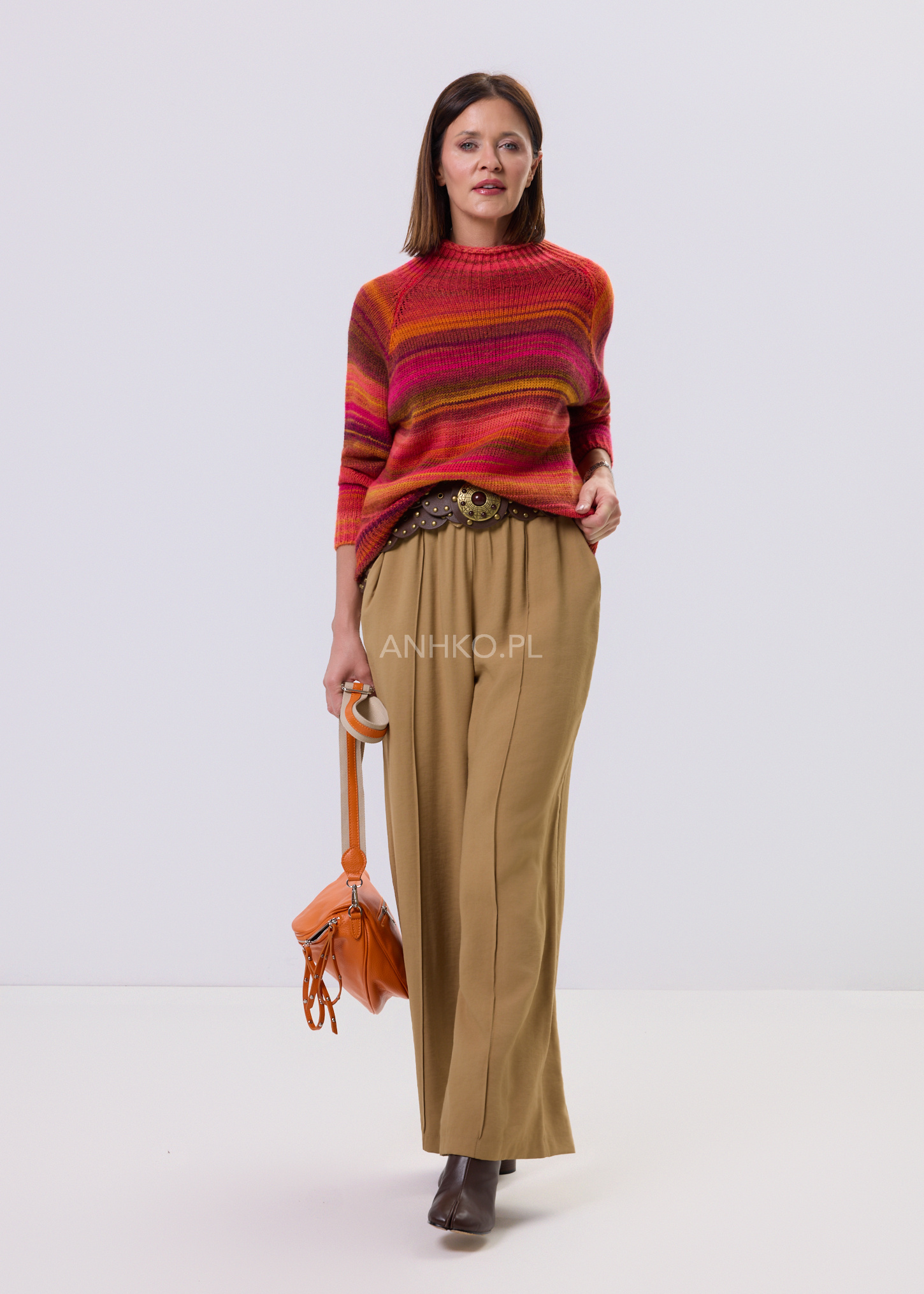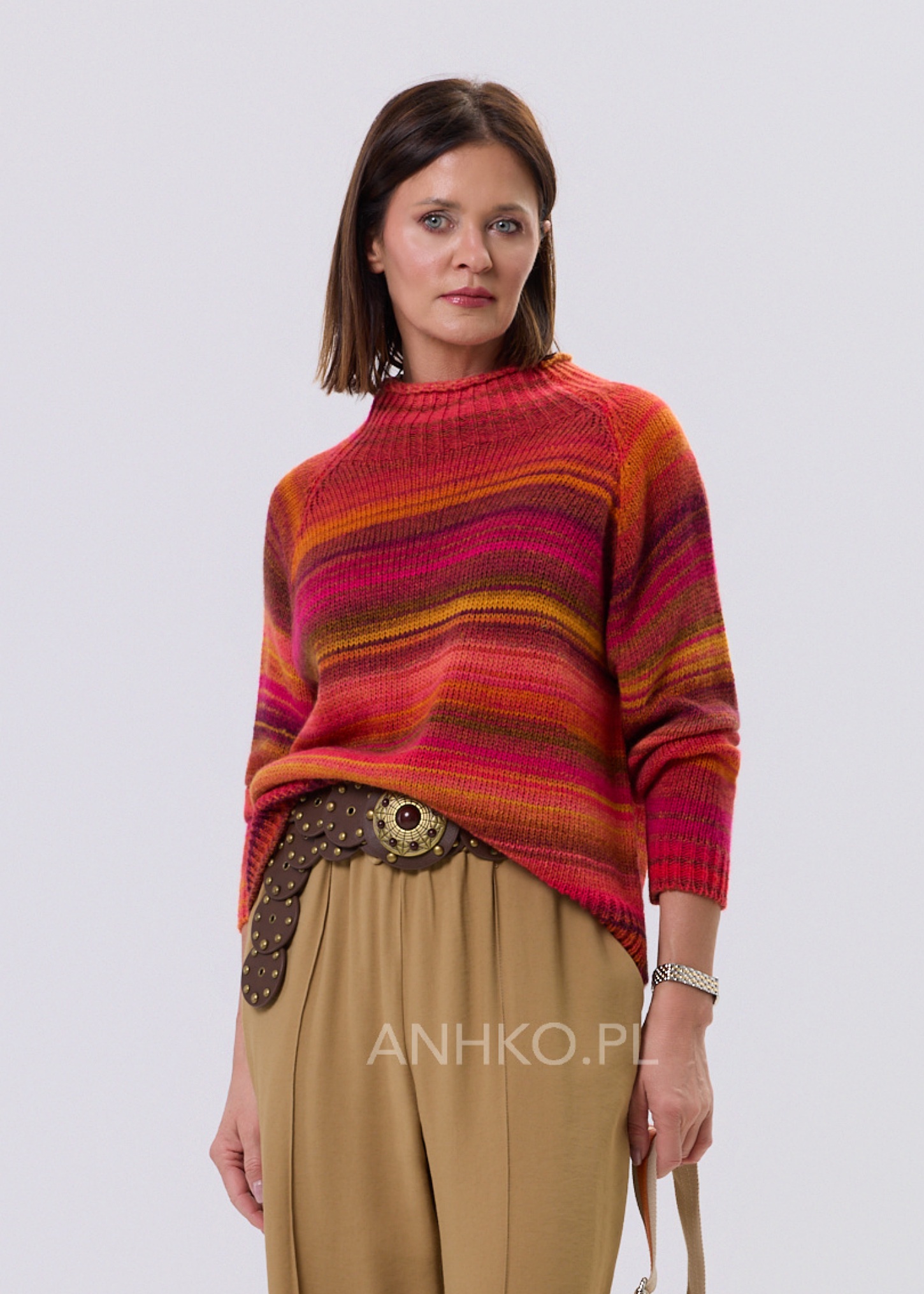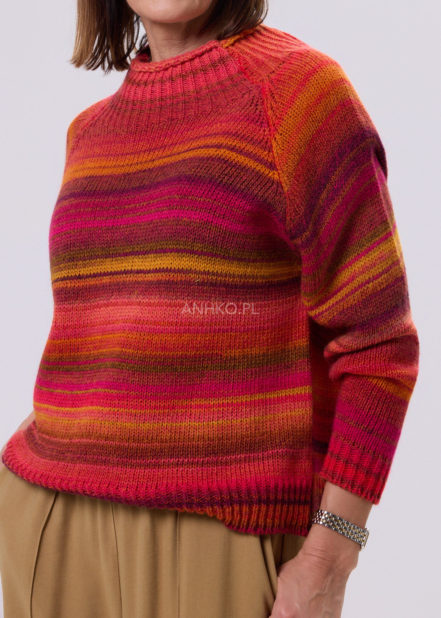 To wyjątkowy sweter, który zachwyca swoimi ciepłymi, wielobarwnymi odcieniami w paski. Wykonany z miękkiej mieszanki wełny i akrylu, zapewnia ciepło i komfort podczas chłodniejszych dni. Idealny do noszenia z jeansami na co dzień, świetnie sprawdzi się również w połączeniu z plisowaną spódnicą na casualowe wyjścia. Sweter doskonale uzupełni garderobę w stylu boho i vintage, dodając niepowtarzalnego charakteru każdej stylizacji.sweterki maga nieznacznie różnić się doborem kolorystycznym