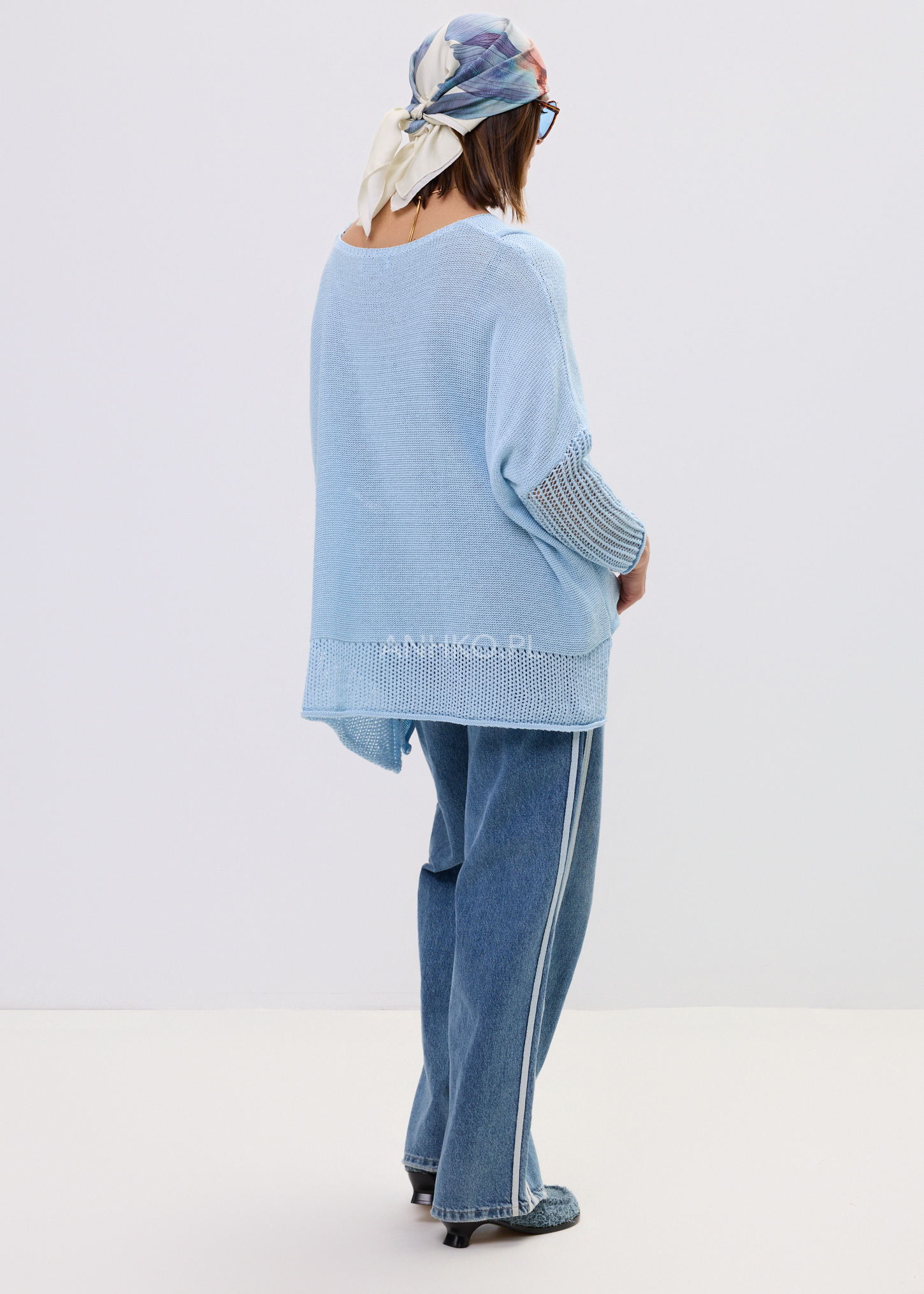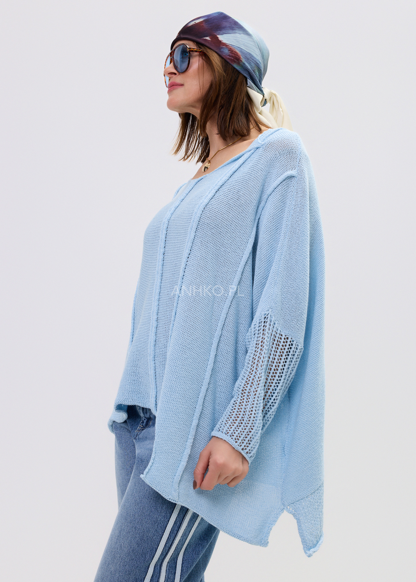 - Wykończenie: Ażurowa struktura przy rękawach i dole dodająca lekkości.