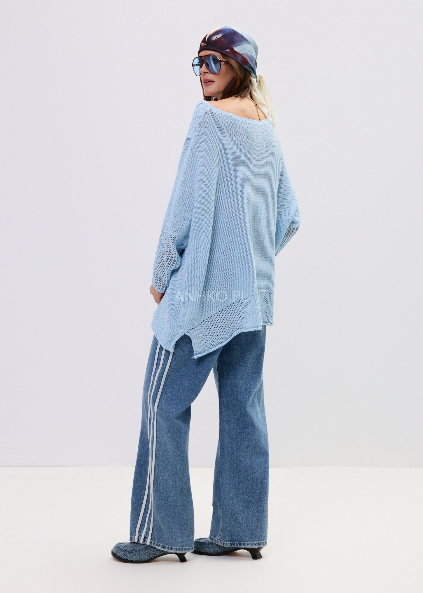 Ten sweter krótki w odcieniu jasnego błękitu zachwyca lekkością i swobodnym fasonem, który miękko układa się na sylwetce. Luźny krój oversize zapewnia komfort noszenia, a szeroki dekolt subtelnie podkreśla linię ramion, tworząc naturalny, niewymuszony look. Model świetnie sprawdzi się w stylizacjach warstwowych – zarówno z dopasowanymi spodniami, jak i z lekką spódnicą.