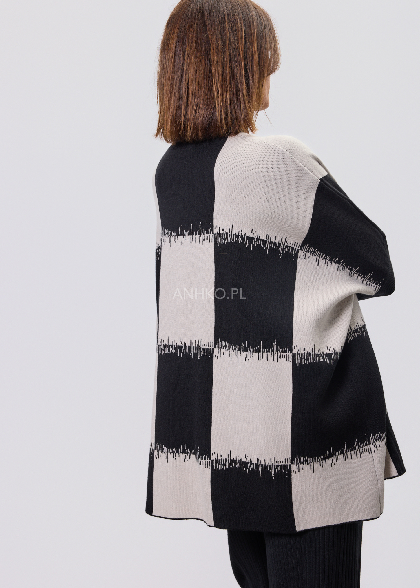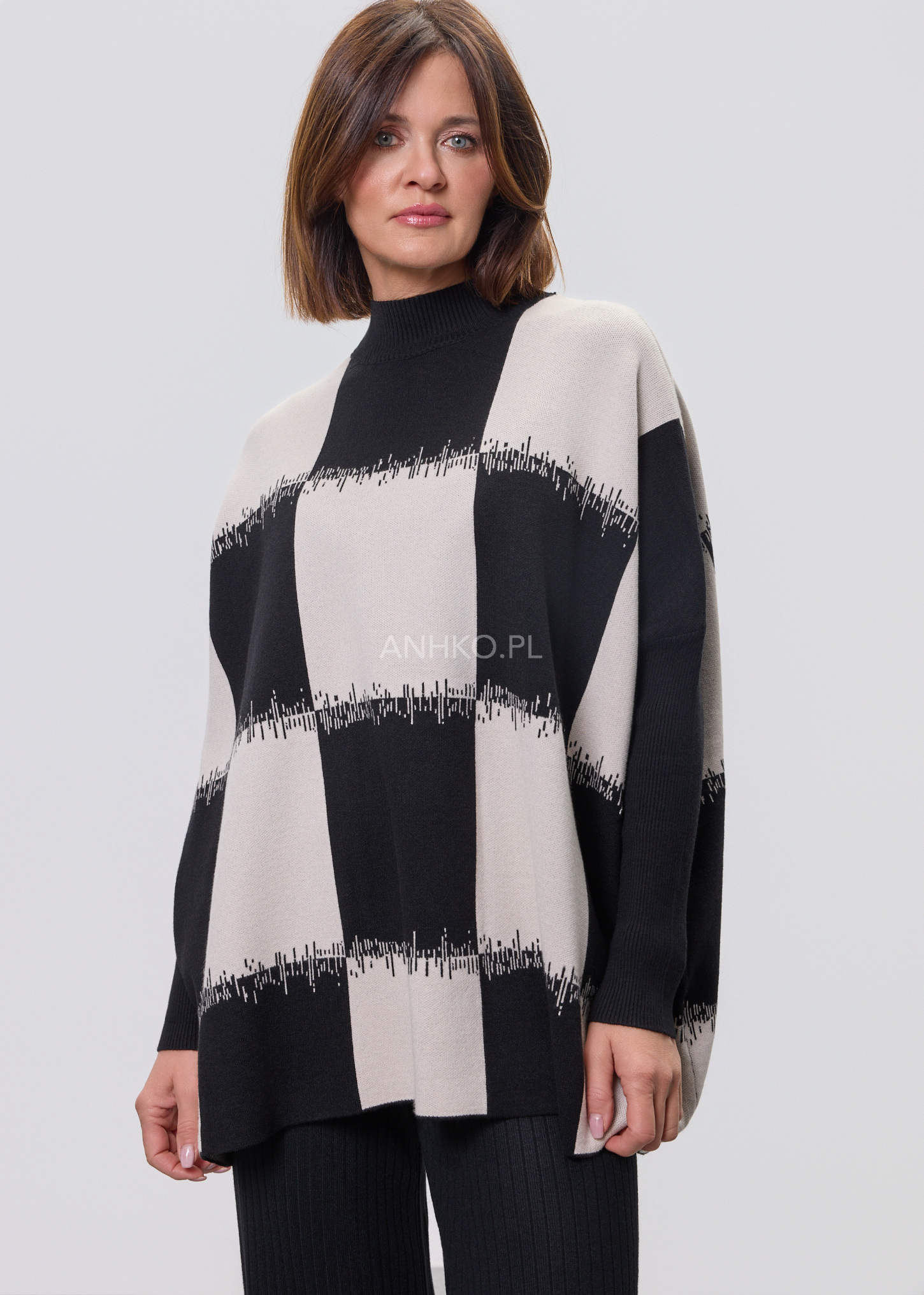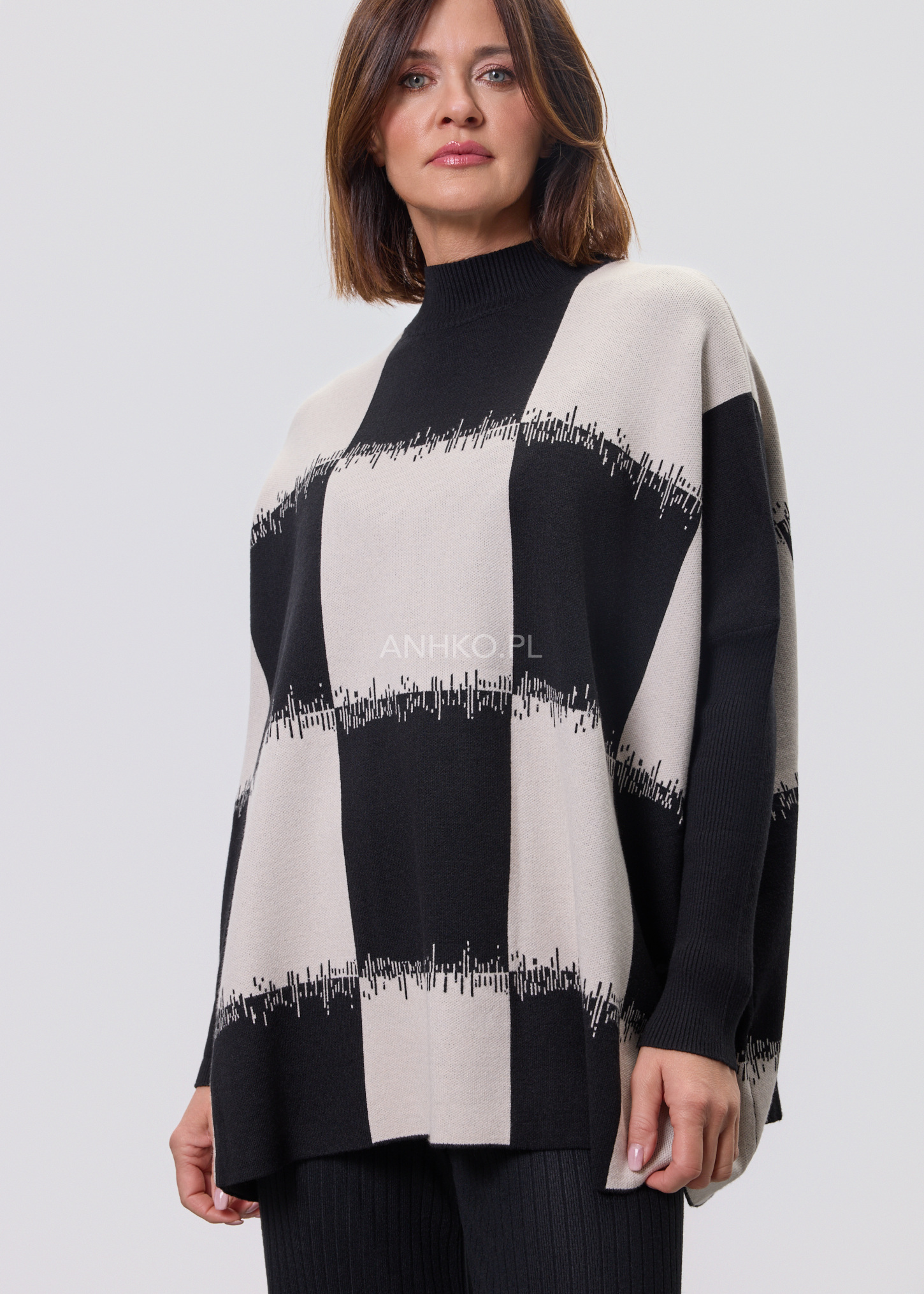 To propozycja dla osób ceniących nowoczesną formę i ponadczasowy charakter. Graficzny wzór przyciąga uwagę, a luźny krój zapewnia komfort noszenia przez cały dzień. Model świetnie sprawdzi się zarówno w codziennych stylizacjach – z jeansami, spodniami materiałowymi czy spódnicą – jak i w bardziej eleganckich zestawach do pracy lub spotkań. Miękka, elastyczna dzianina dobrze dopasowuje się do sylwetki i nie krępuje ruchów. Sweter nie posiada podszewki ani halek, dzięki czemu jest lekki i wygodny. To idealny wybór na sezon przejściowy, chłodniejsze dni oraz wieczory.