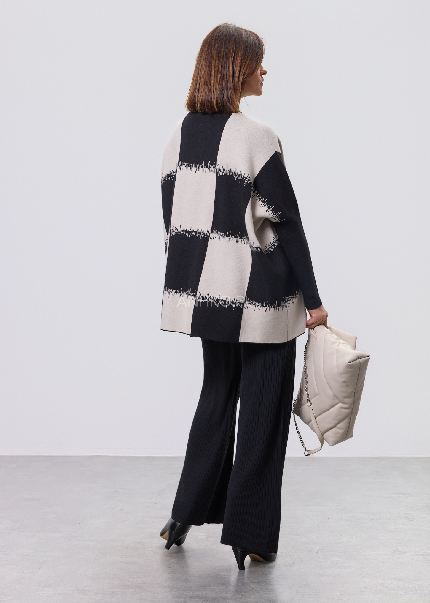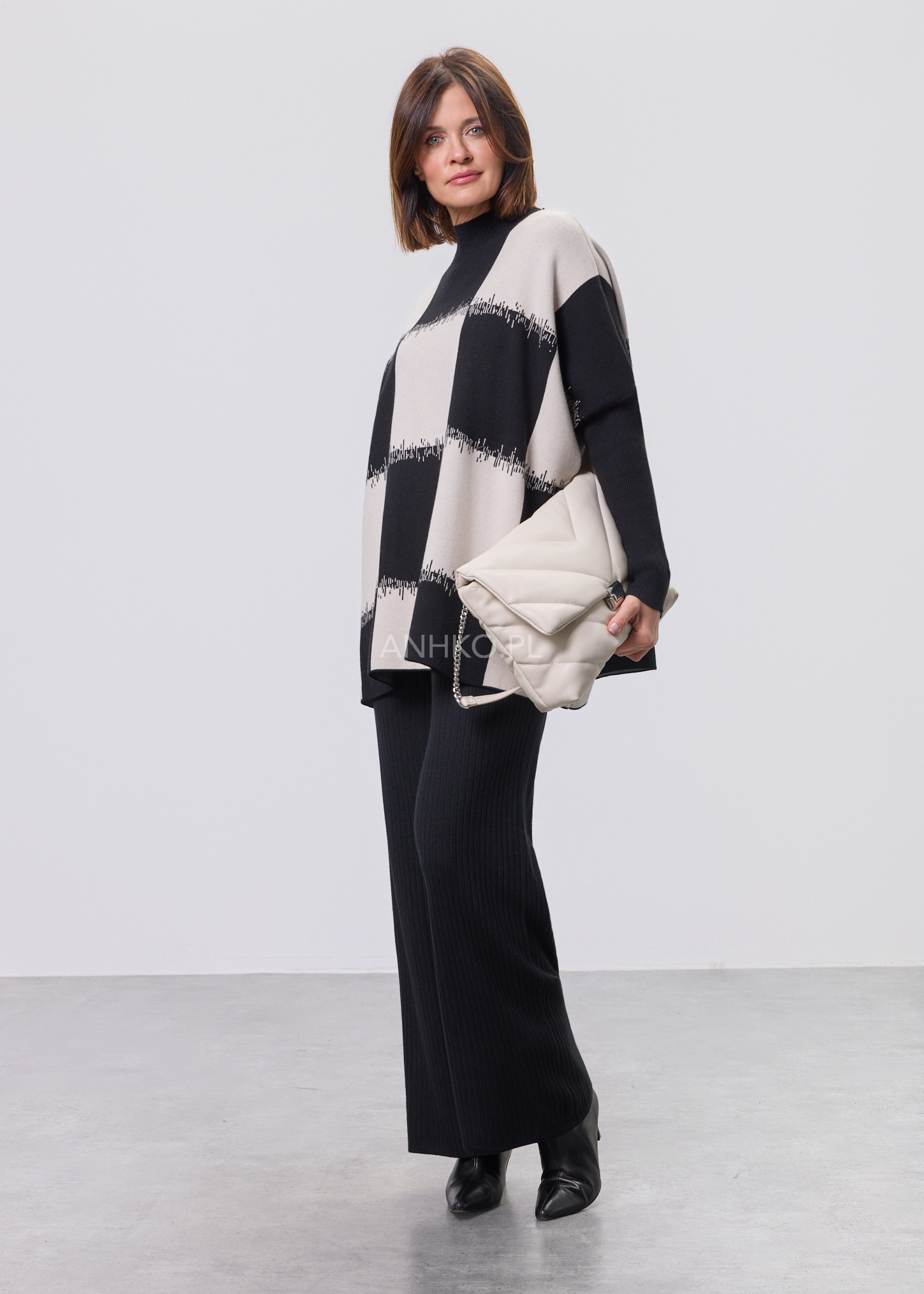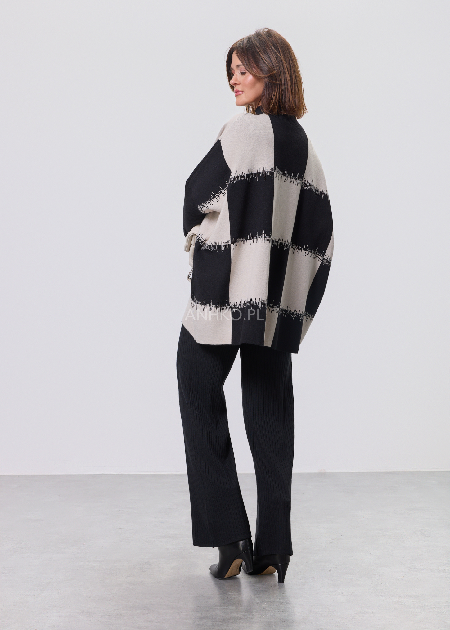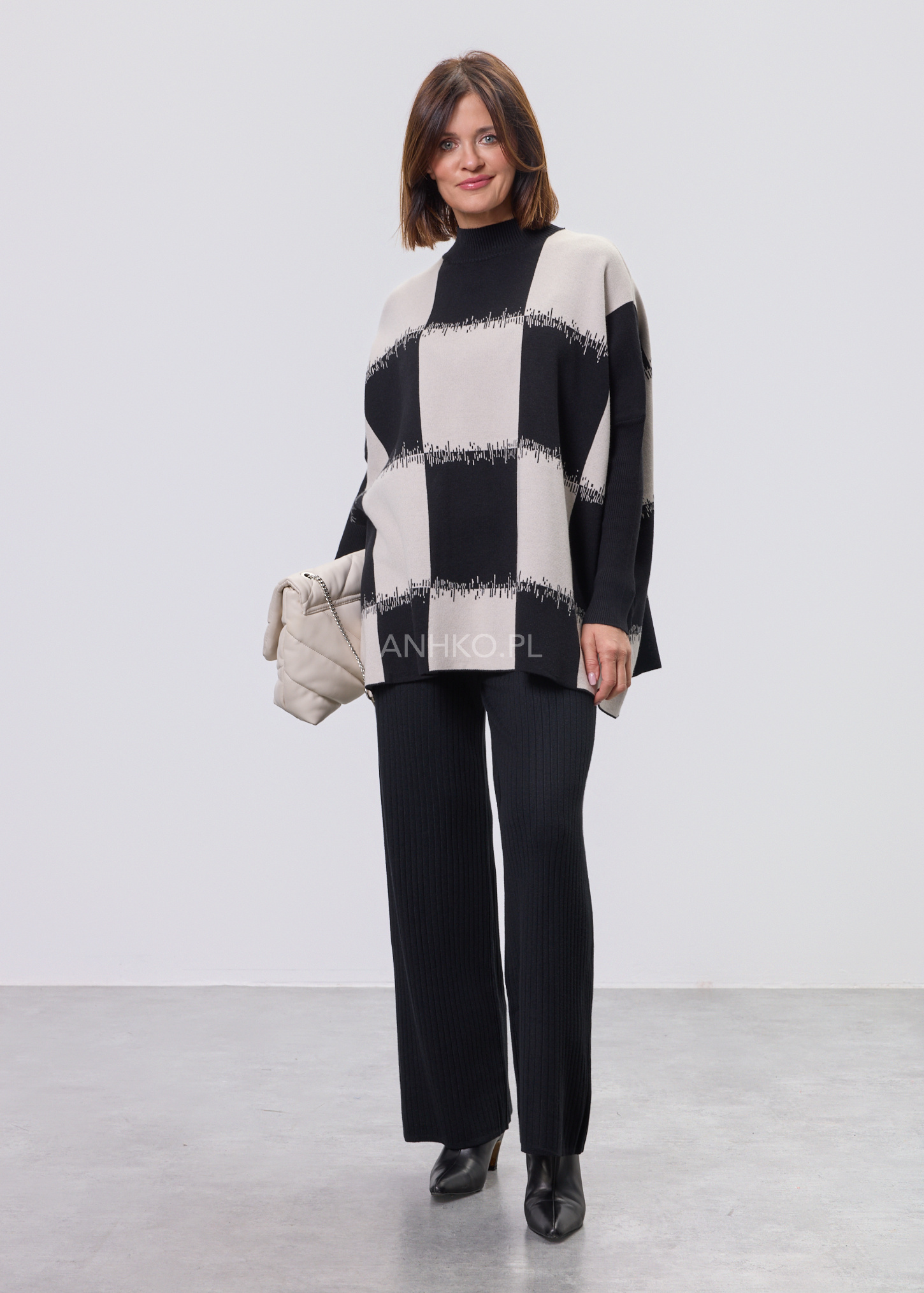 To propozycja dla osób ceniących nowoczesną formę i ponadczasowy charakter. Graficzny wzór przyciąga uwagę, a luźny krój zapewnia komfort noszenia przez cały dzień. Model świetnie sprawdzi się zarówno w codziennych stylizacjach – z jeansami, spodniami materiałowymi czy spódnicą – jak i w bardziej eleganckich zestawach do pracy lub spotkań. Miękka, elastyczna dzianina dobrze dopasowuje się do sylwetki i nie krępuje ruchów. Sweter nie posiada podszewki ani halek, dzięki czemu jest lekki i wygodny. To idealny wybór na sezon przejściowy, chłodniejsze dni oraz wieczory.