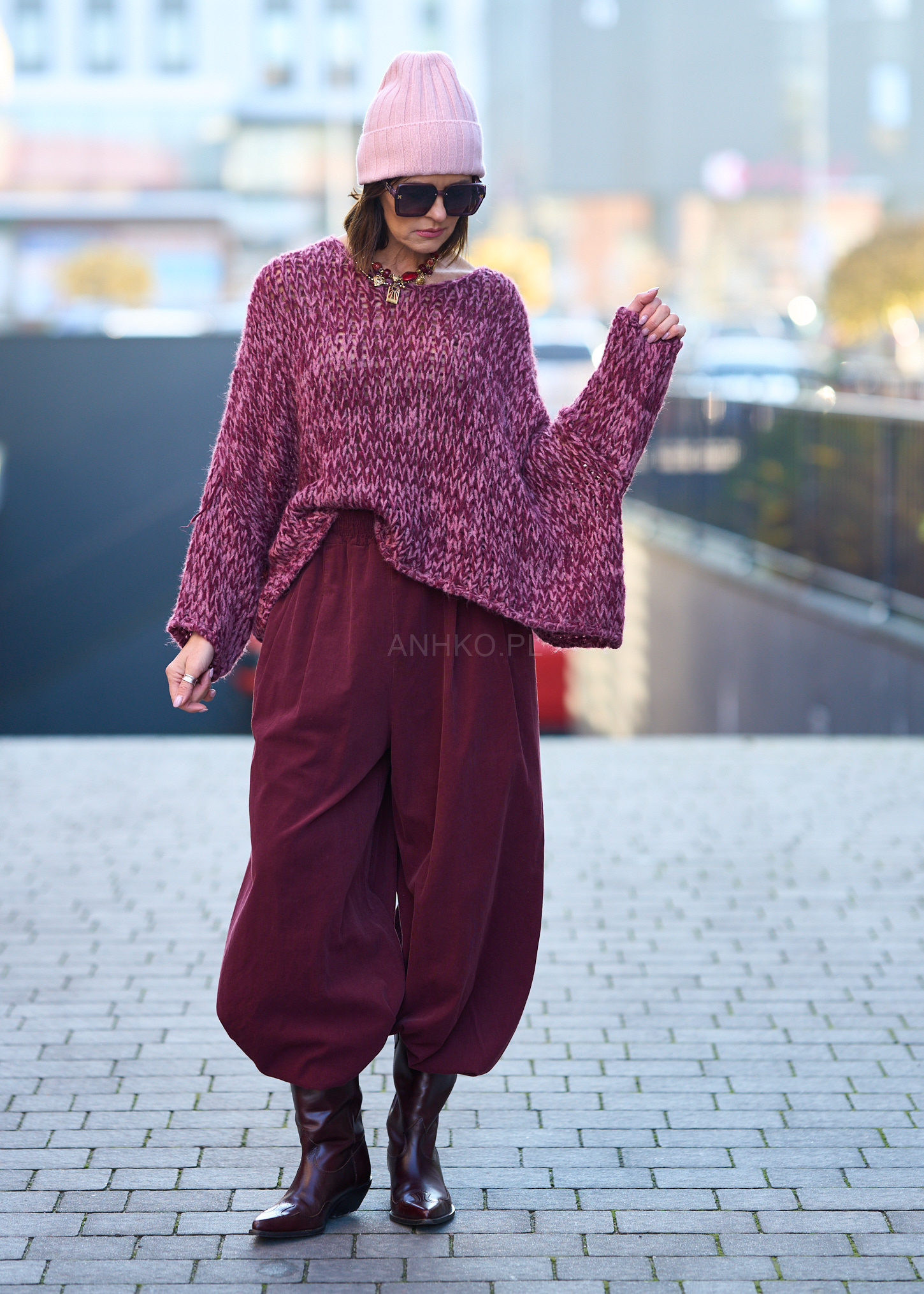 Spodnie Sztruksowe Lunren Bordowe - Szerokie, wygodne spodnie z bawełny o miękkiej sztruksowej strukturze. Posiadają elastyczny pas i ściągacze przy nogawkach. Idealne do codziennych stylizacji, zapewniają komfort i styl w jednym.