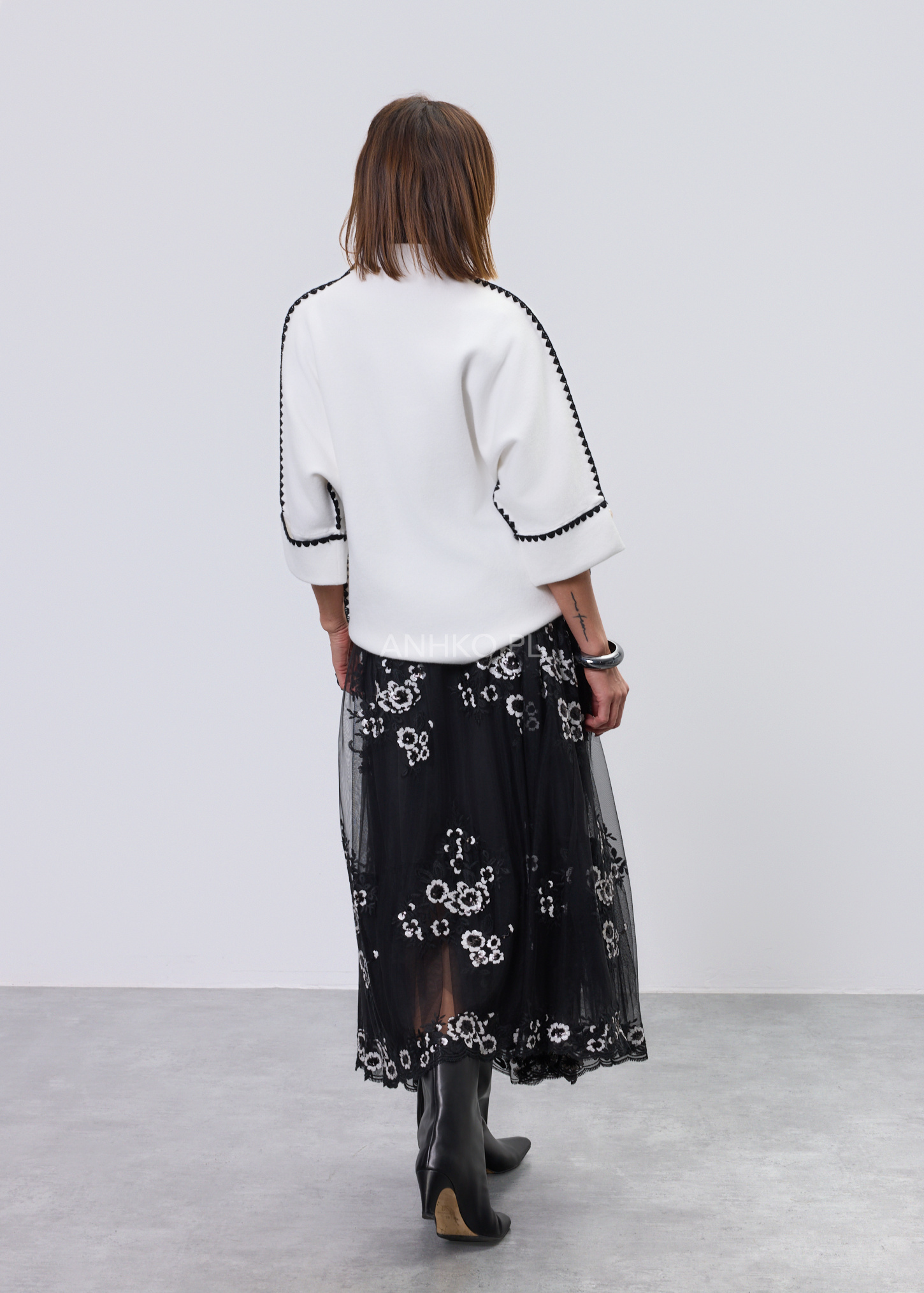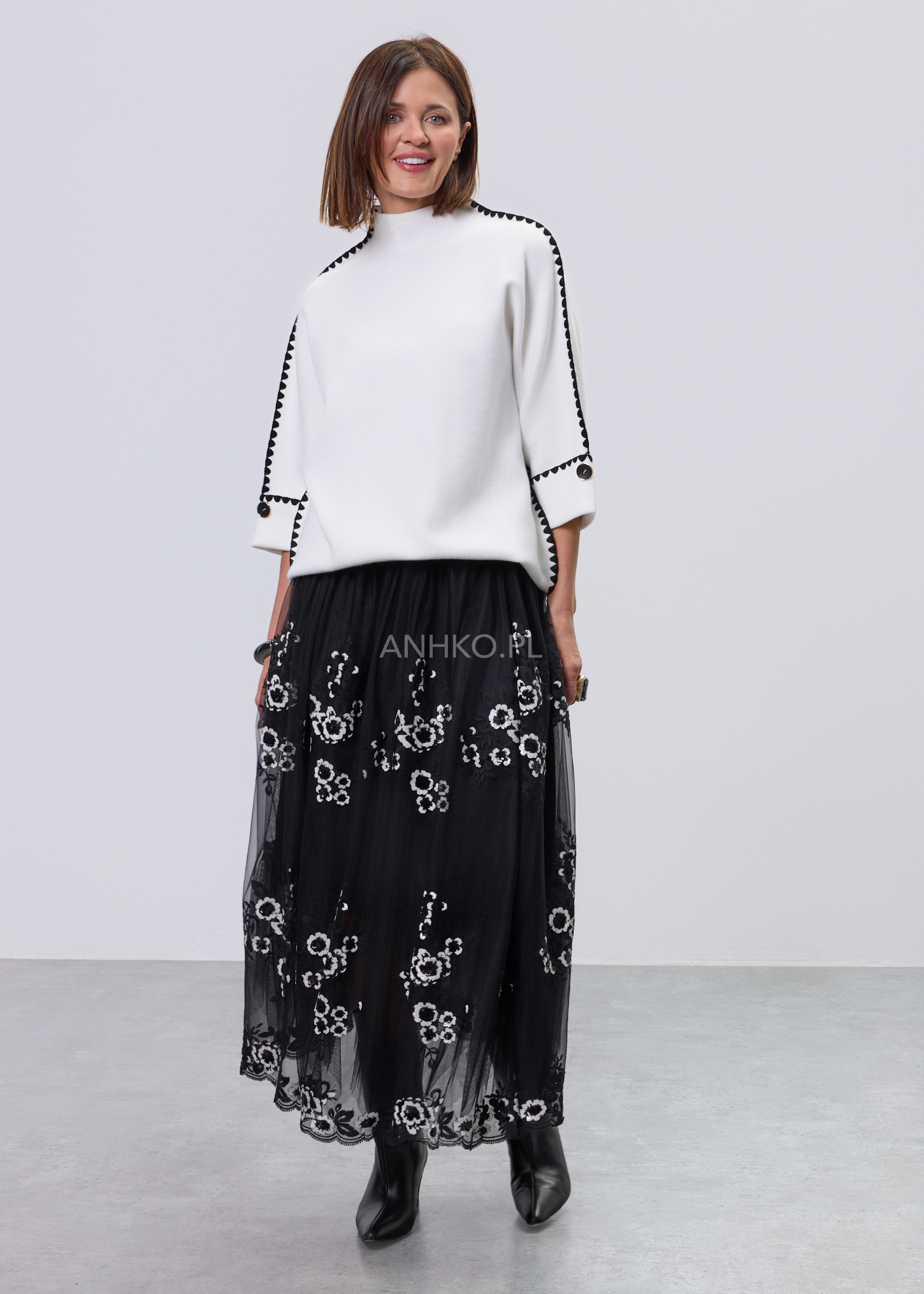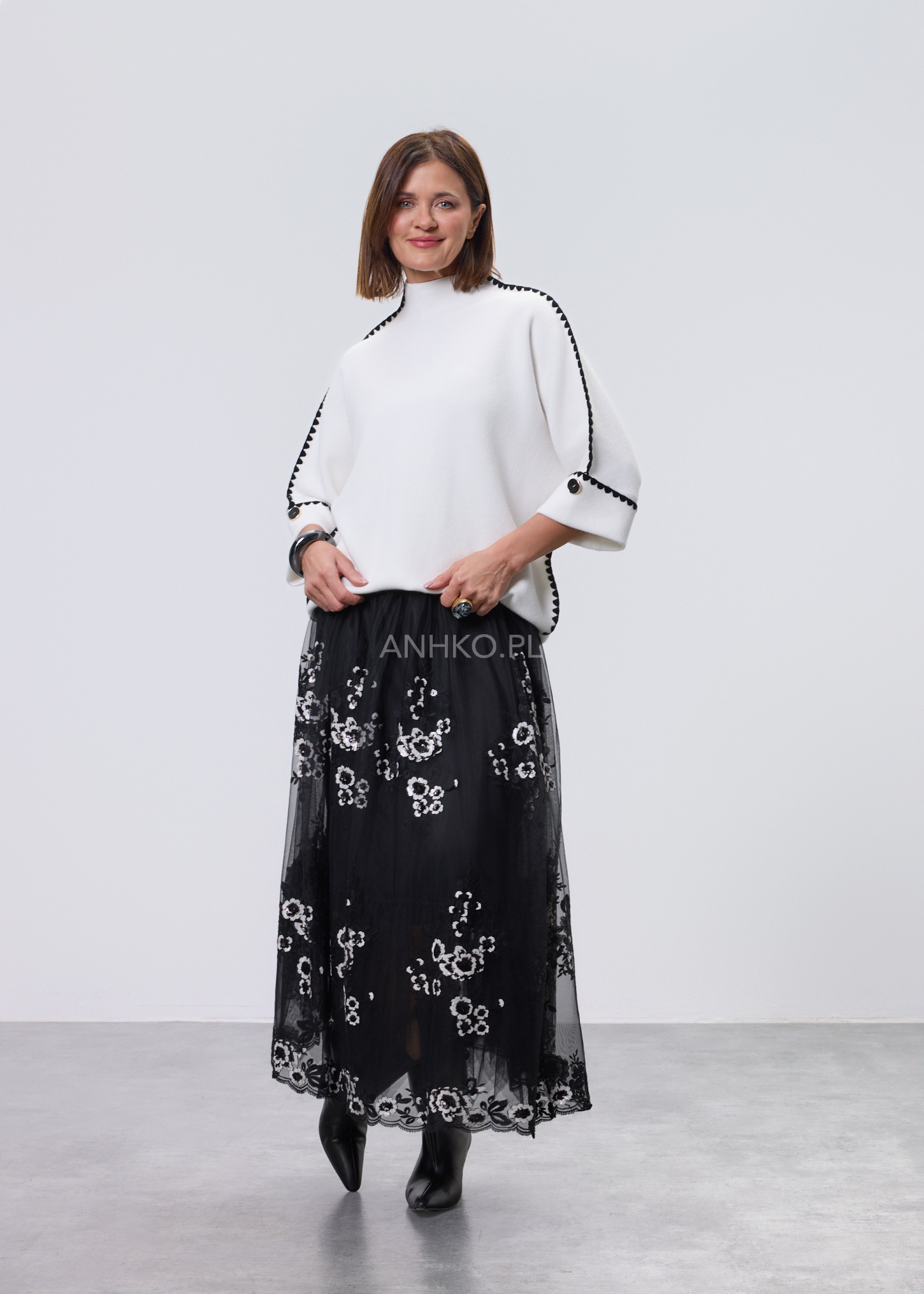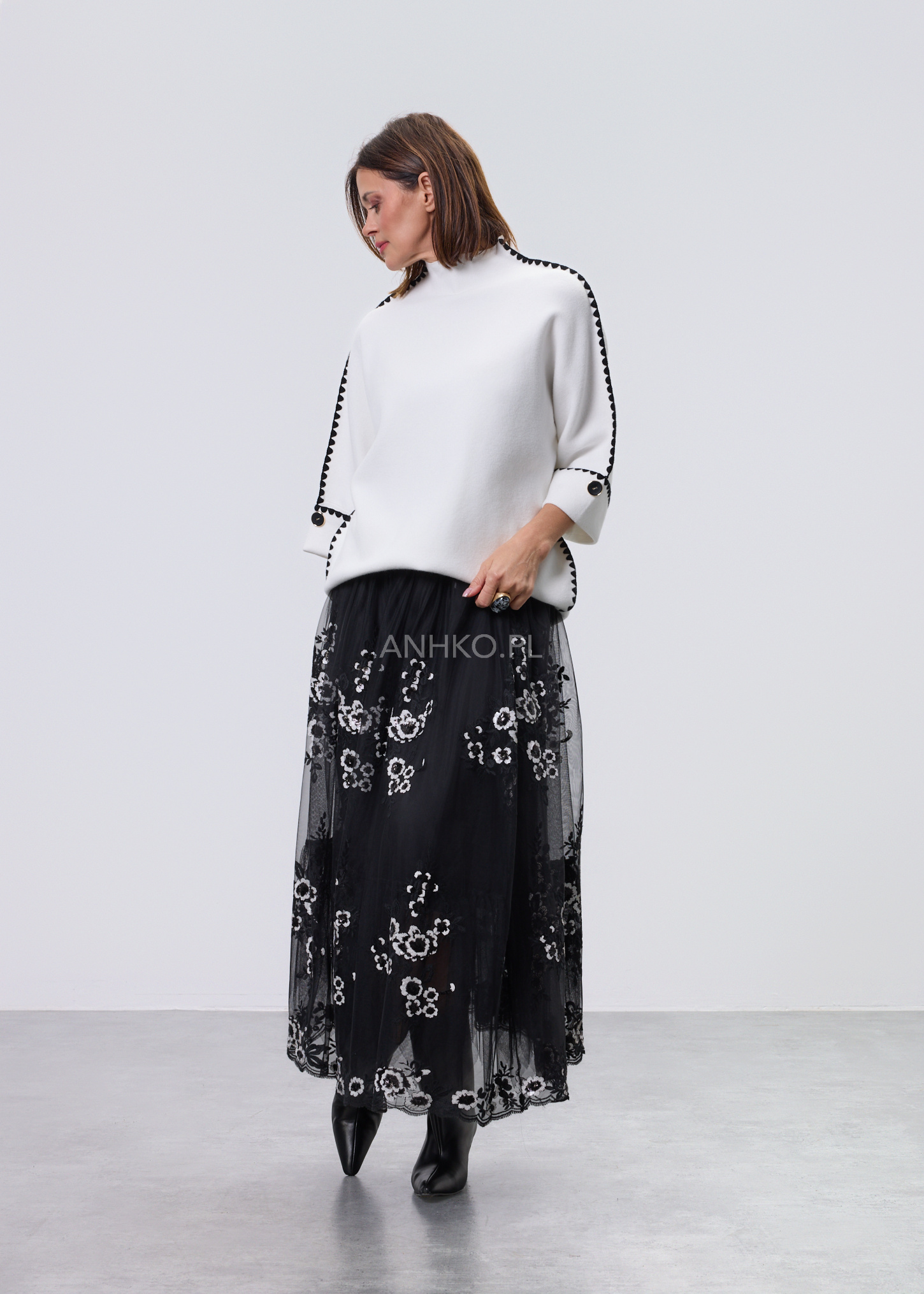 Spódnica Ophelia Poise Czarna - Elegancka, lekka spódnica o kobiecym charakterze, łącząca delikatność i wyrazisty detal. Transparentna warstwa z haftem subtelnie kontrastuje z gładką podszewką, tworząc efekt stylowej głębi. Idealna na wyjątkowe okazje i codzienne stylizacje z nutą elegancji.