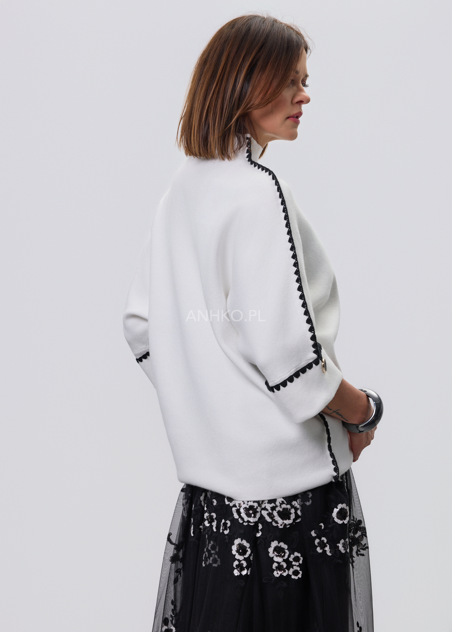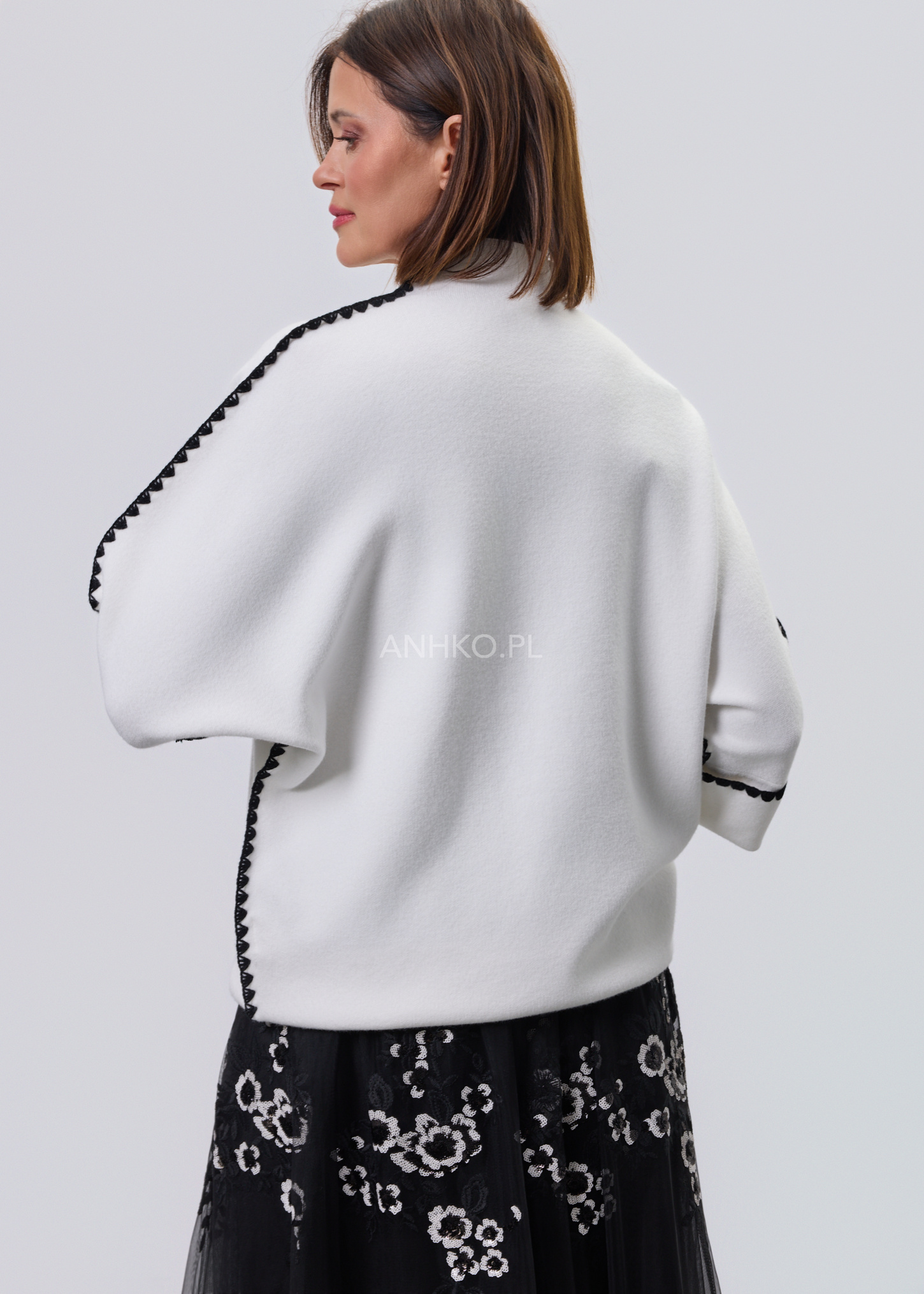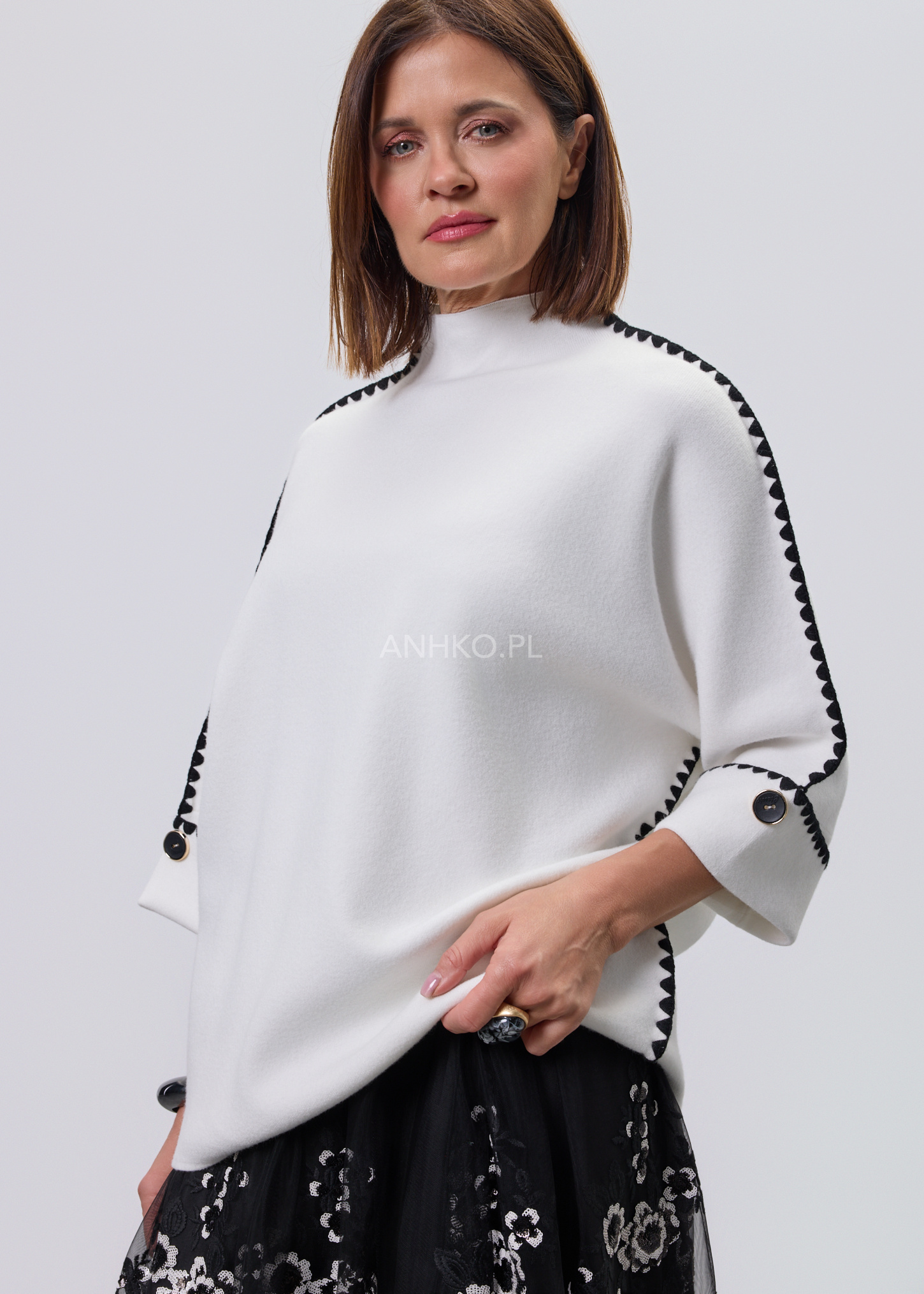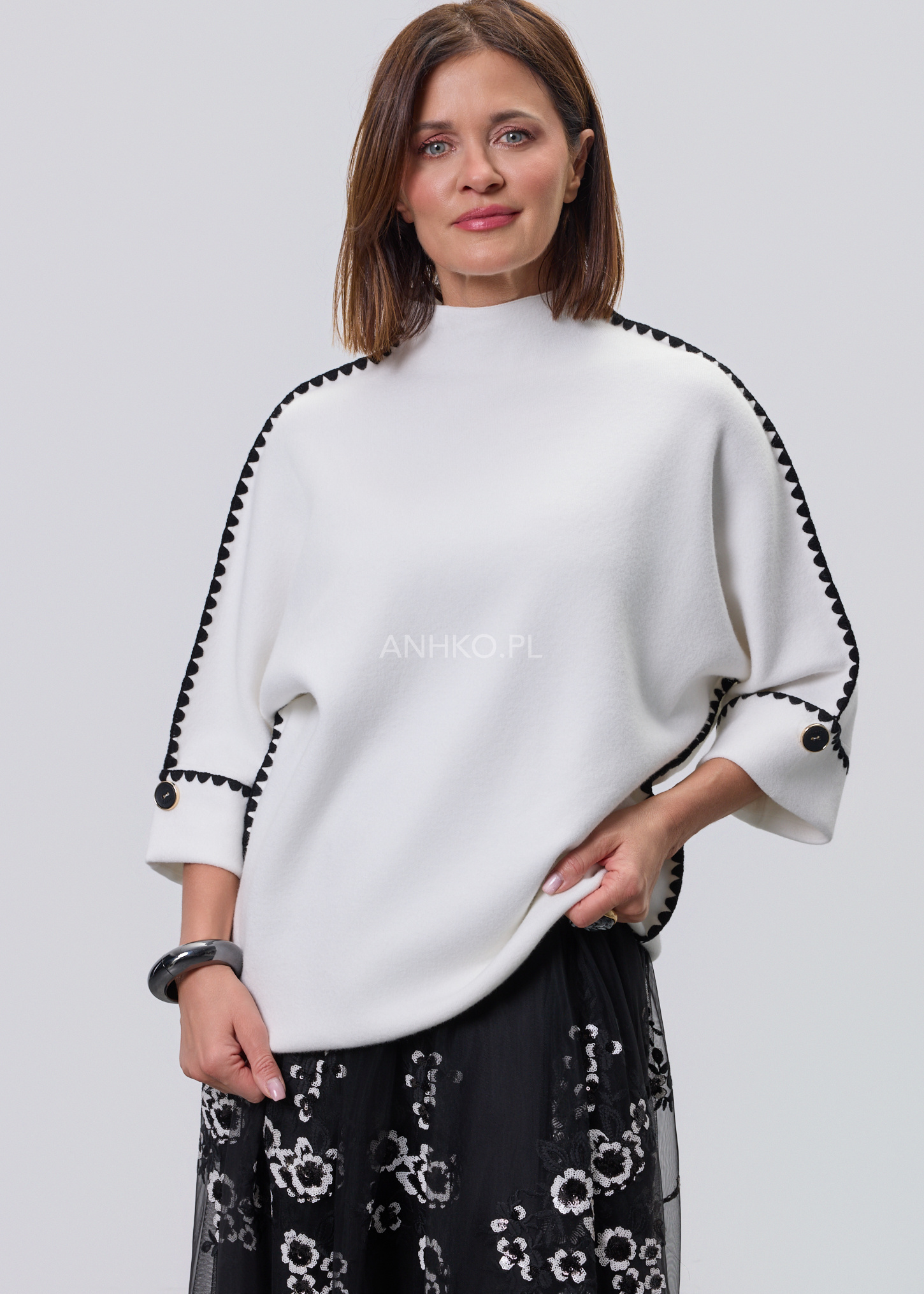 Stylowy sweter damski o swobodnym fasonie, zaprojektowany z myślą o wygodzie i nowoczesnej estetyce. Model posiada okrągły dekolt oraz szerokie, skrócone rękawy, które nadają całości lekkości i modowego charakteru. Ozdobne obszycie w kontrastowym kolorze subtelnie podkreśla linię ramion, rękawów i dołu swetra. Dodatkowy guzik przy rękawie pełni funkcję dekoracyjną. Sweter nie posiada kieszeni, podszewki ani halki, dzięki czemu pozostaje lekki i uniwersalny w stylizacji. Doskonale komponuje się z jeansami, eleganckimi spodniami oraz spódnicami. Sprawdzi się zarówno na co dzień, do pracy, jak i na spotkania czy wyjazdy.