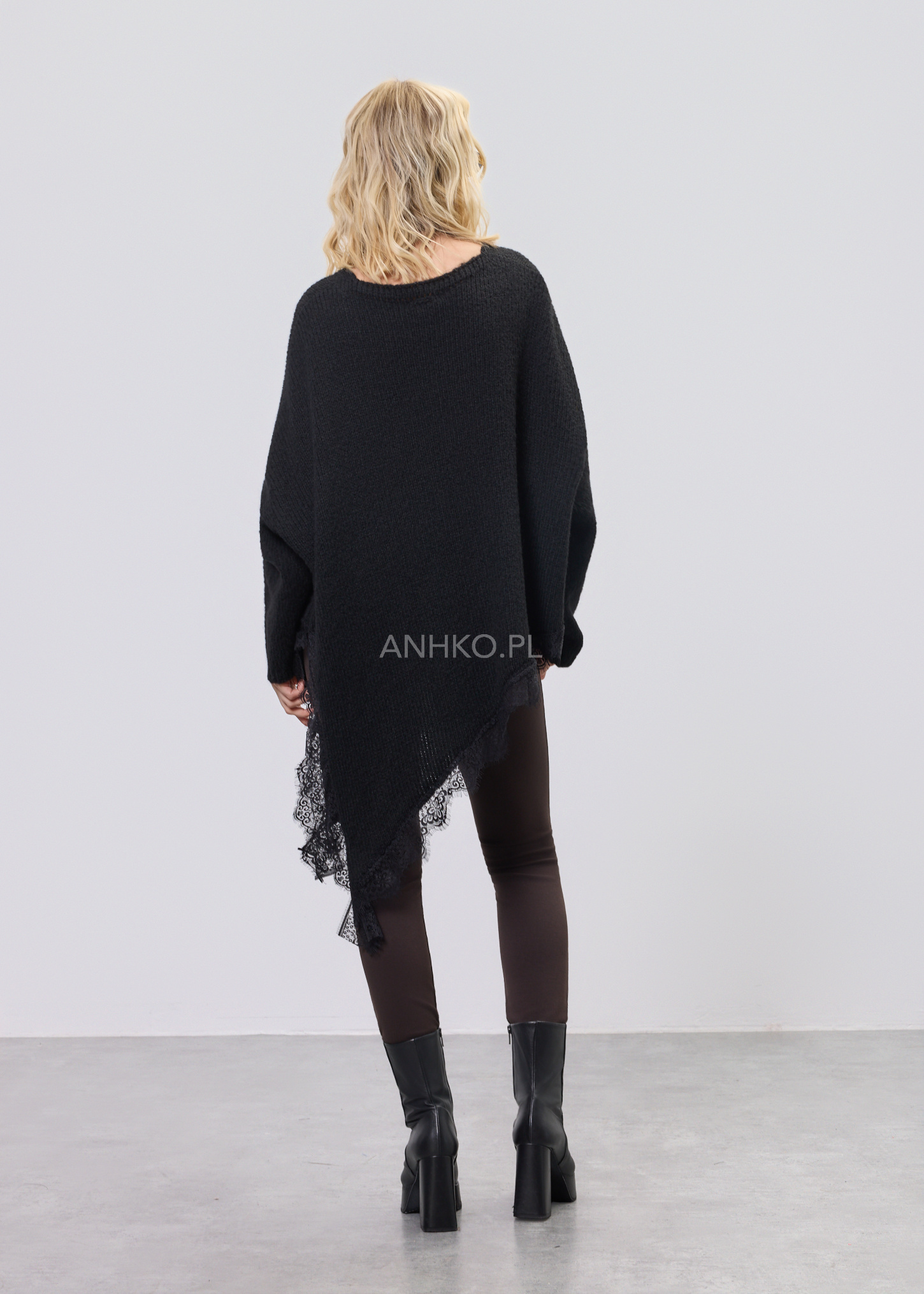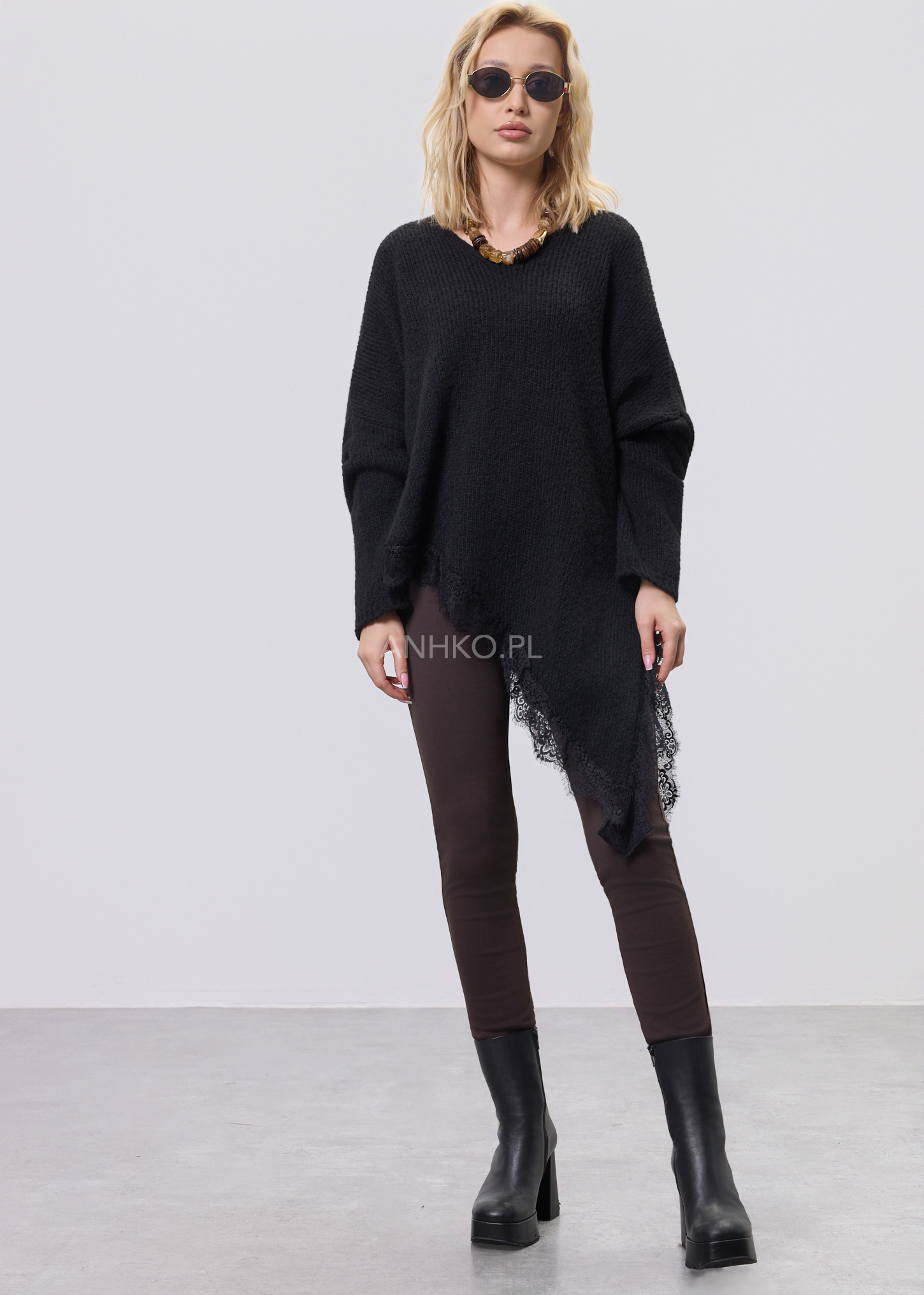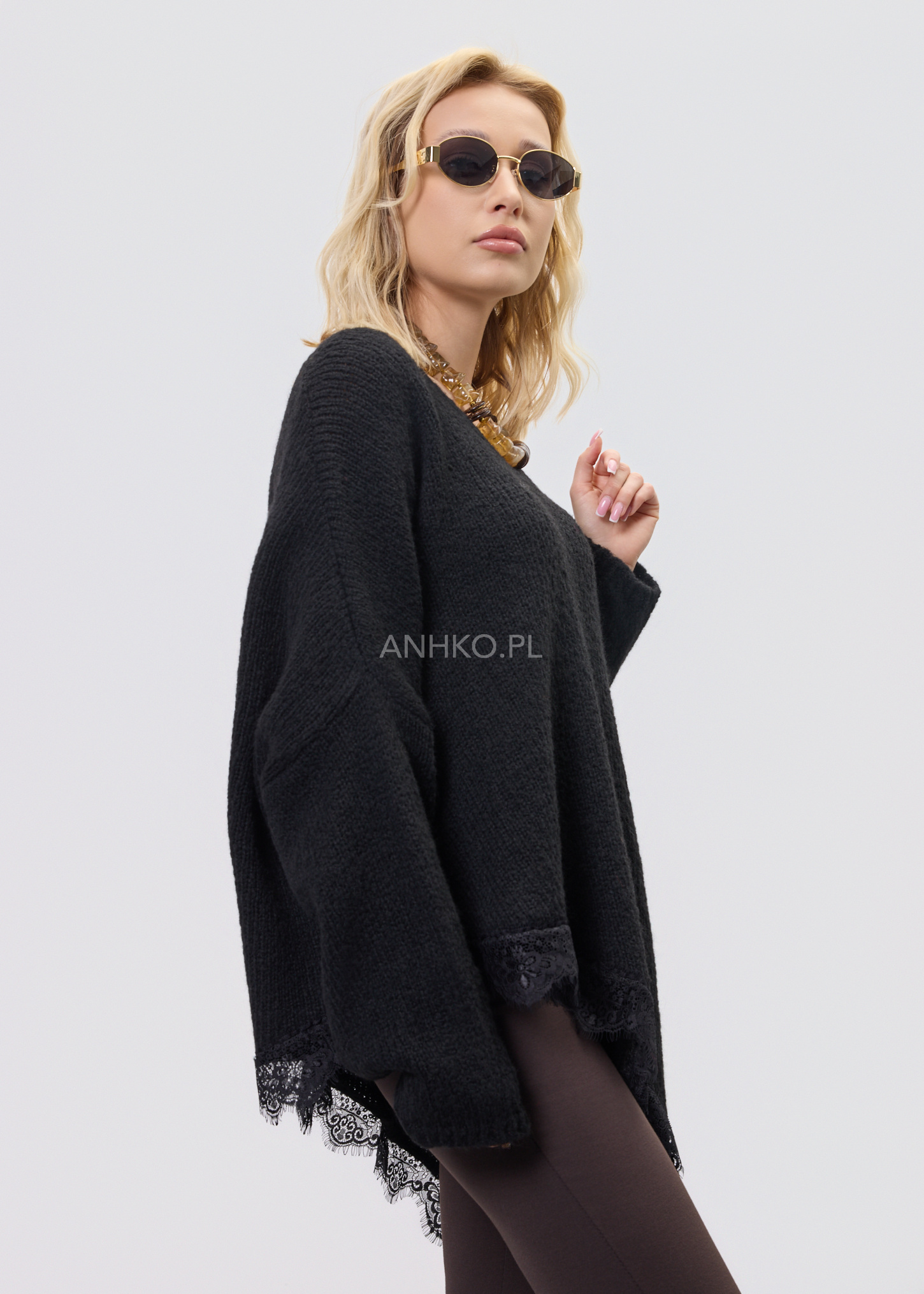 Ten sweter to połączenie swobodnej formy z delikatnym, dekoracyjnym wykończeniem. Luźny krój zapewnia wygodę noszenia i dobrze układa się na różnych typach sylwetek. Dekolt w kształcie litery V optycznie wydłuża szyję, a koronkowe wstawki przy rękawach i dolnej krawędzi nadają całości wyrafinowanego charakteru. Sprawdzi się zarówno w codziennych stylizacjach z jeansami i botkami, jak i w bardziej kobiecych zestawach z długą spódnicą czy eleganckimi spodniami. Idealny na spotkania, wyjścia do pracy, spacery czy wieczorne kolacje.