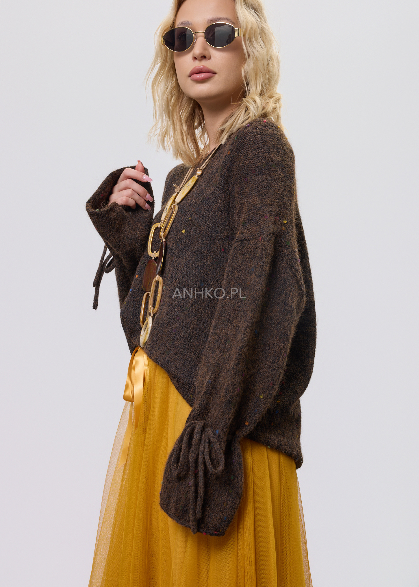 Wyjątkowy sweter o swobodnym kroju, zaprojektowany z myślą o komforcie i modowym akcencie. Model wyróżnia się efektownym detalem wiązania na rękawach, który nadaje całości niebanalnego charakteru. Dekolt o klasycznej linii zapewnia uniwersalność, a elastyczna dzianina dopasowuje się do sylwetki bez uczucia skrępowania. Sweter nie posiada podszewki ani kieszeni, dzięki czemu pozostaje lekki i idealny do noszenia warstwowego. Doskonale sprawdzi się w stylizacjach codziennych, do pracy w trybie smart casual, na spotkania z przyjaciółmi czy weekendowe wyjścia. Można go zestawić zarówno z jeansami, jak i spódnicą czy spodniami materiałowymi.