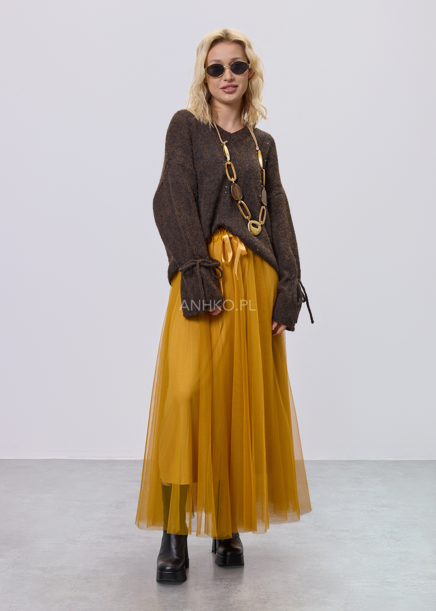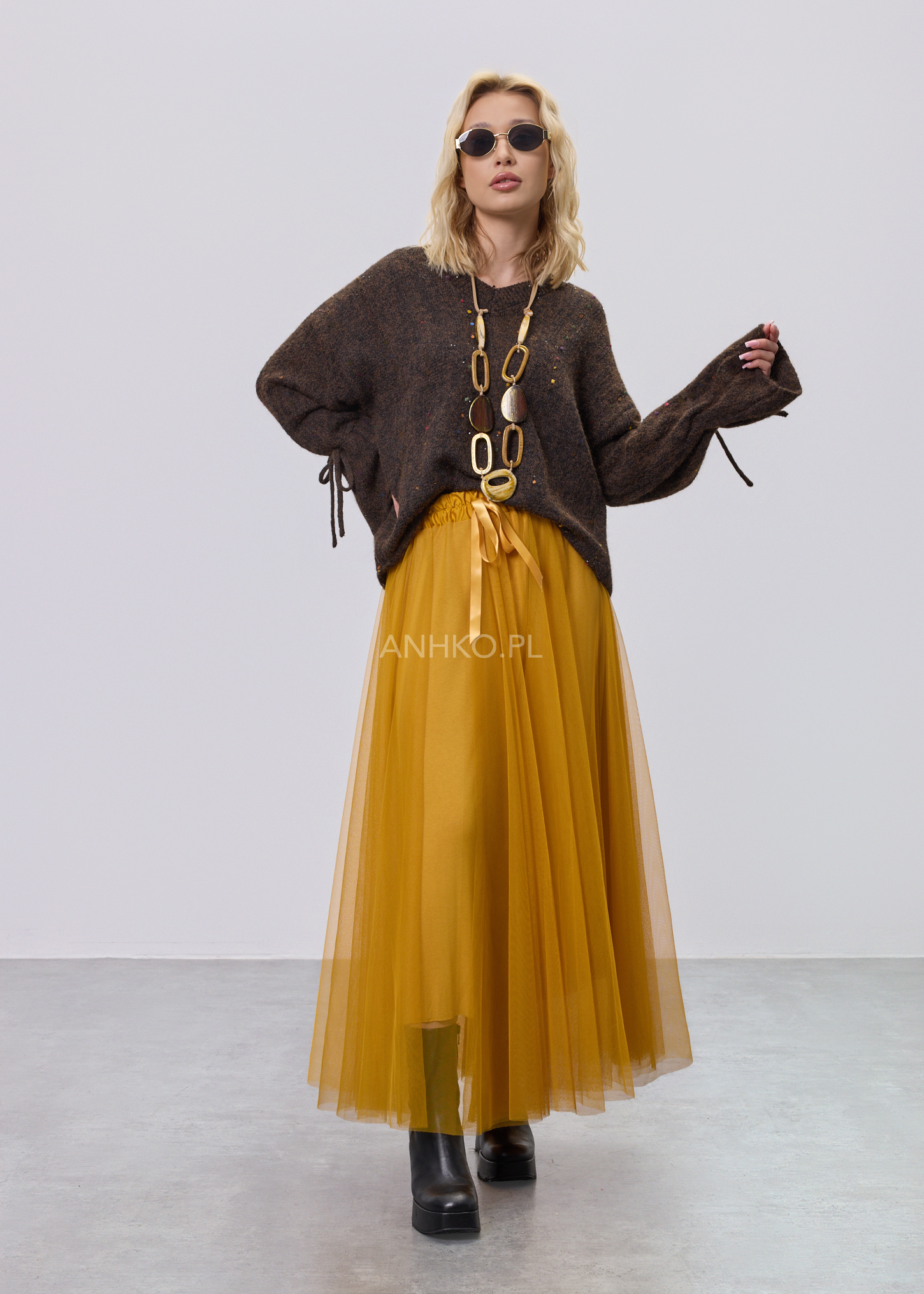Spódnica Eldara Żółta - Tiulowa spódnica w kolorze żółtym. Lekka, zwiewna i kobieca – idealna do stylizacji zarówno codziennych, jak i eleganckich. Posiada gładką halkę, która zapewnia komfort i subtelny wygląd.
