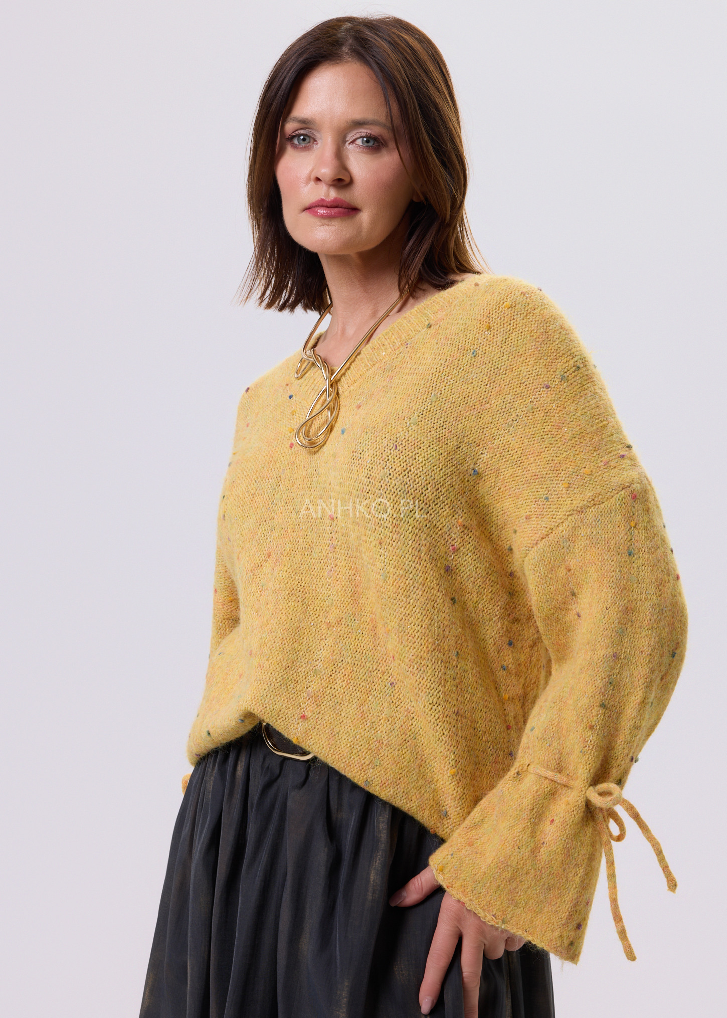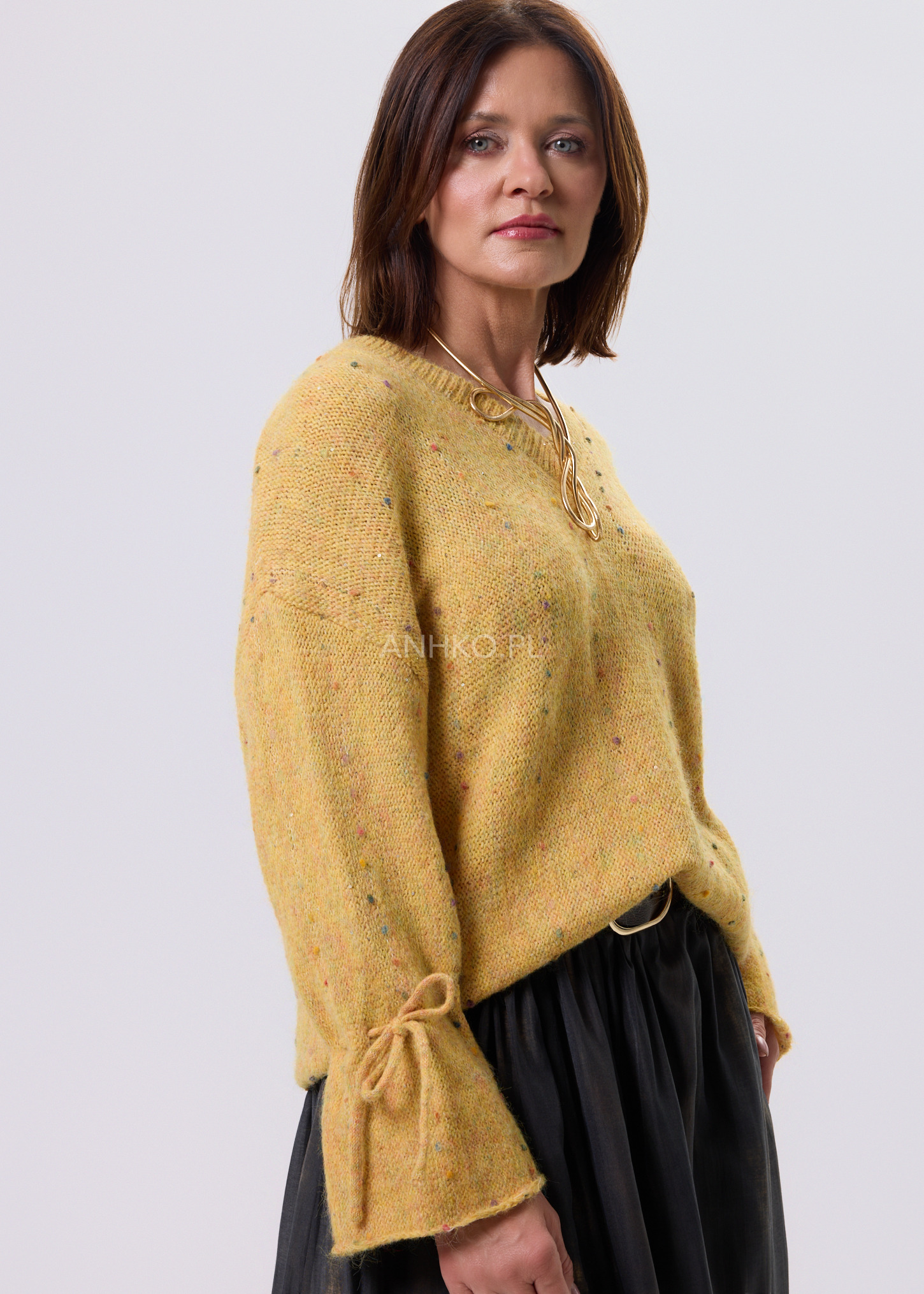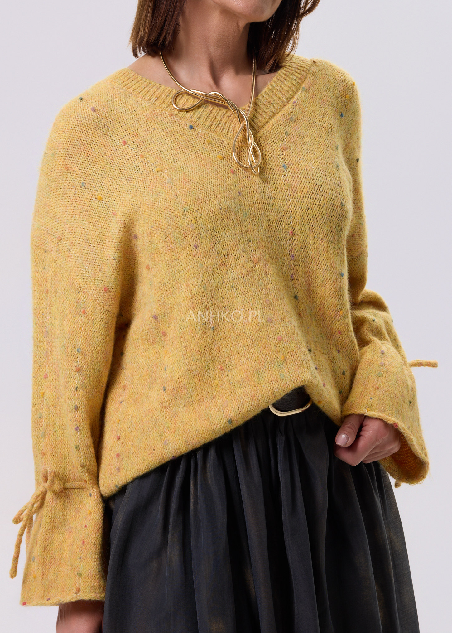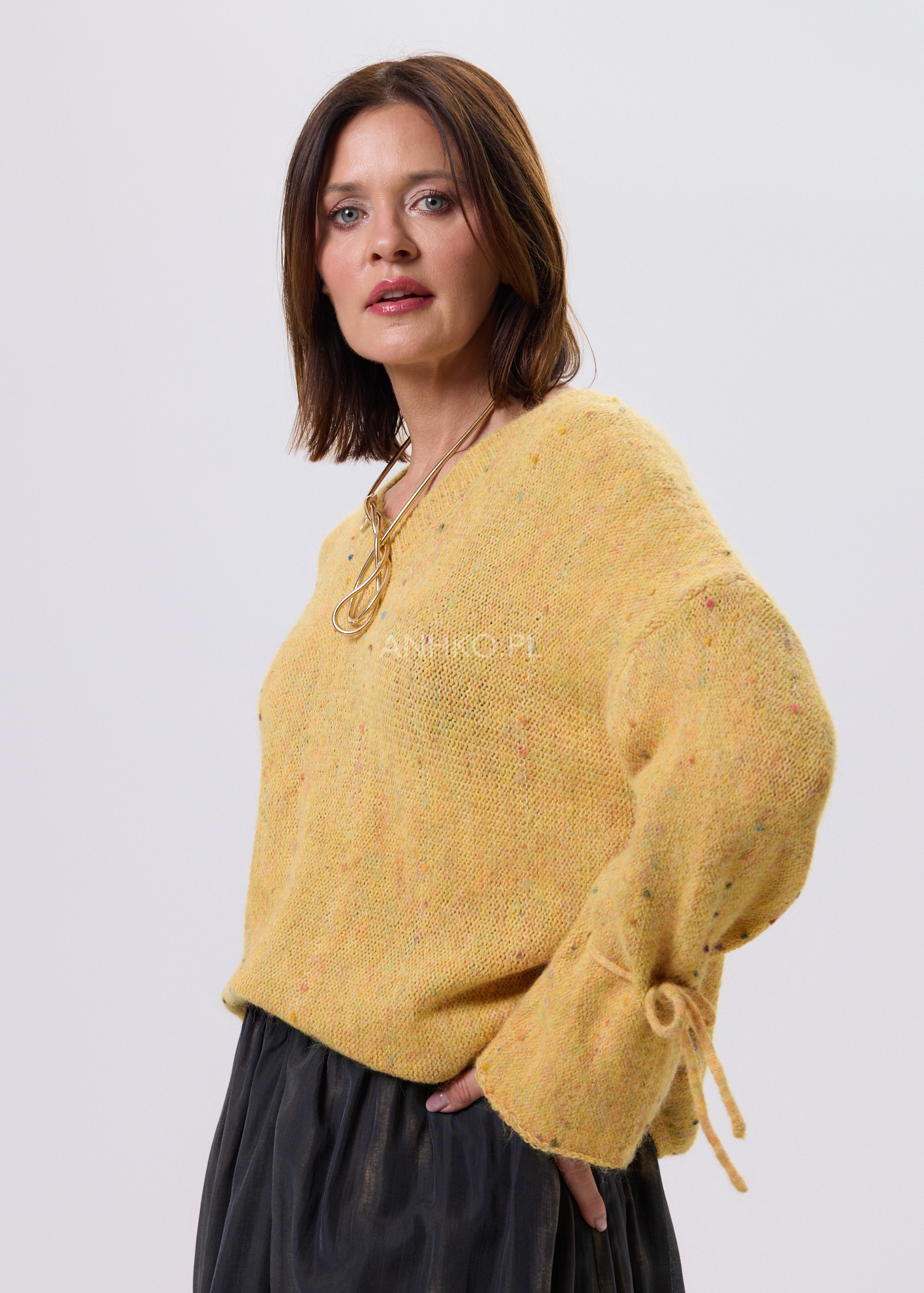 Wyjątkowy sweter o swobodnym kroju, zaprojektowany z myślą o komforcie i modowym akcencie. Model wyróżnia się efektownym detalem wiązania na rękawach, który nadaje całości niebanalnego charakteru. Dekolt o klasycznej linii zapewnia uniwersalność, a elastyczna dzianina dopasowuje się do sylwetki bez uczucia skrępowania. Sweter nie posiada podszewki ani kieszeni, dzięki czemu pozostaje lekki i idealny do noszenia warstwowego. Doskonale sprawdzi się w stylizacjach codziennych, do pracy w trybie smart casual, na spotkania z przyjaciółmi czy weekendowe wyjścia. Można go zestawić zarówno z jeansami, jak i spódnicą czy spodniami materiałowymi.