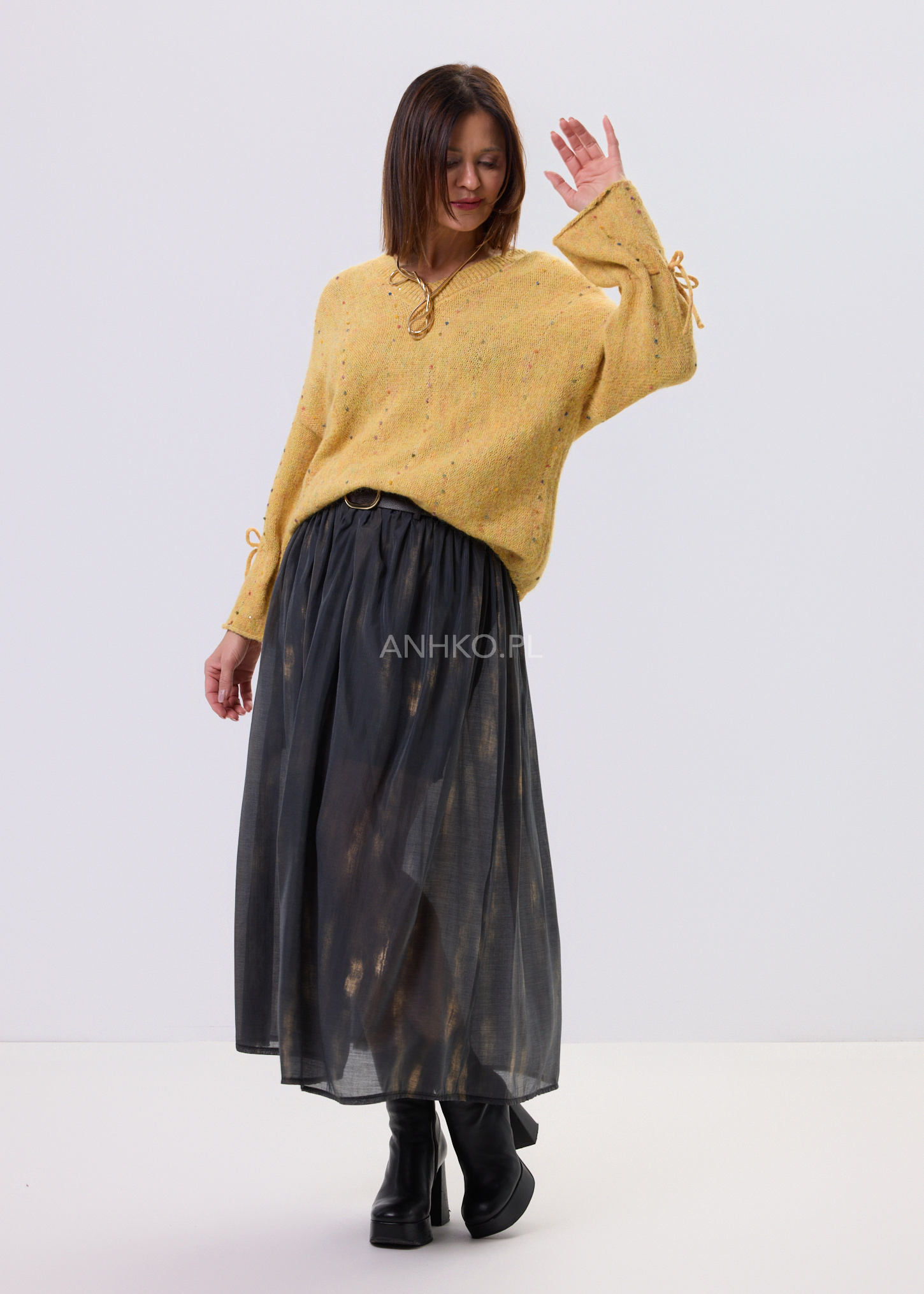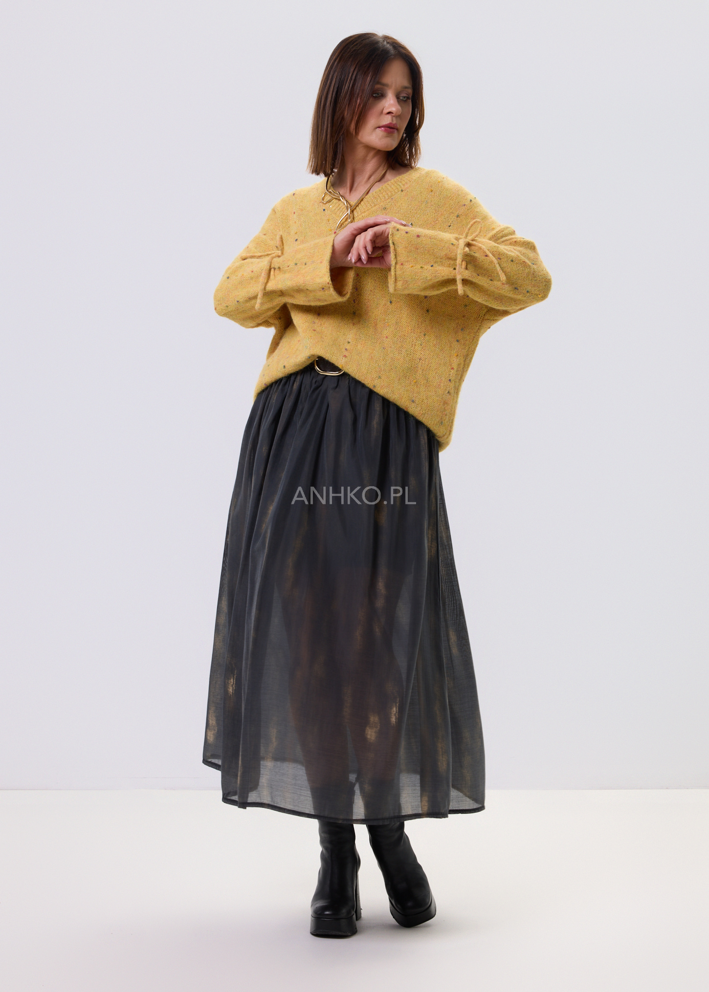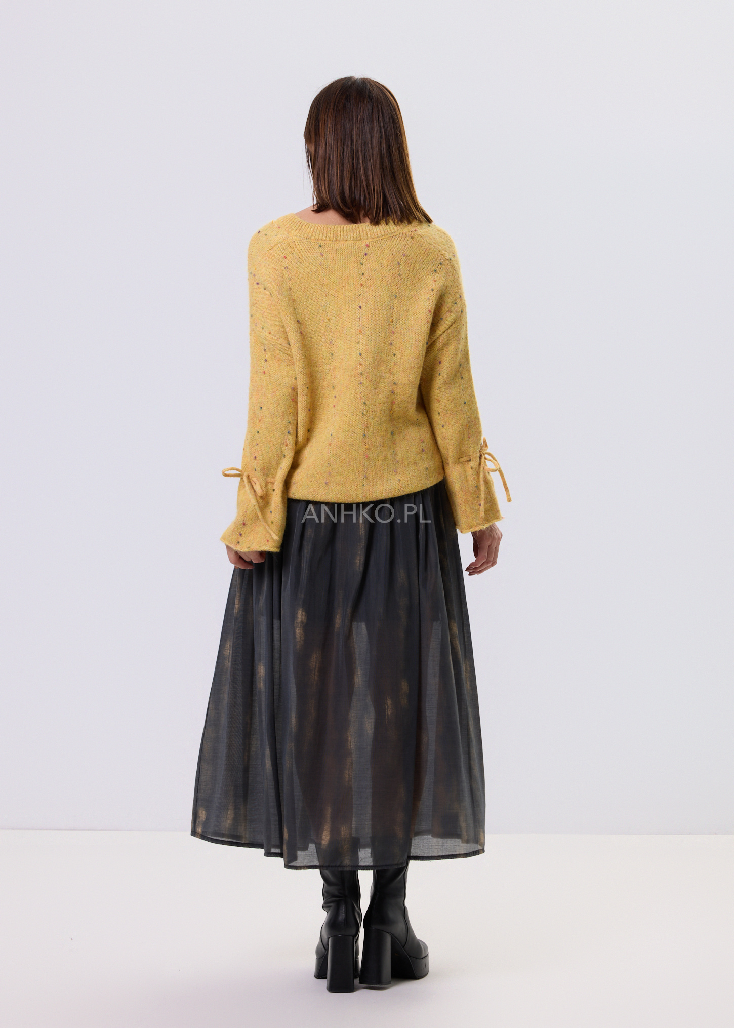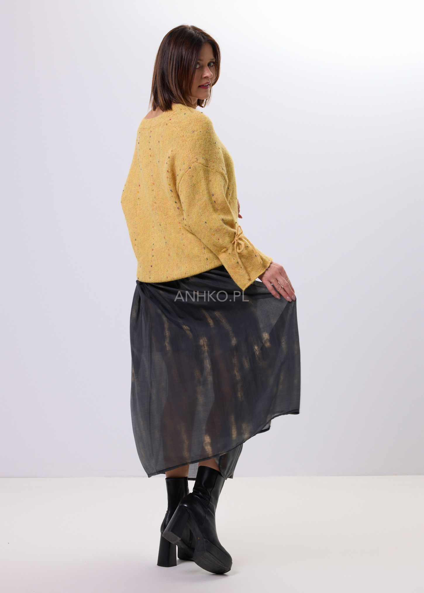 Wyjątkowy sweter o swobodnym kroju, zaprojektowany z myślą o komforcie i modowym akcencie. Model wyróżnia się efektownym detalem wiązania na rękawach, który nadaje całości niebanalnego charakteru. Dekolt o klasycznej linii zapewnia uniwersalność, a elastyczna dzianina dopasowuje się do sylwetki bez uczucia skrępowania. Sweter nie posiada podszewki ani kieszeni, dzięki czemu pozostaje lekki i idealny do noszenia warstwowego. Doskonale sprawdzi się w stylizacjach codziennych, do pracy w trybie smart casual, na spotkania z przyjaciółmi czy weekendowe wyjścia. Można go zestawić zarówno z jeansami, jak i spódnicą czy spodniami materiałowymi.