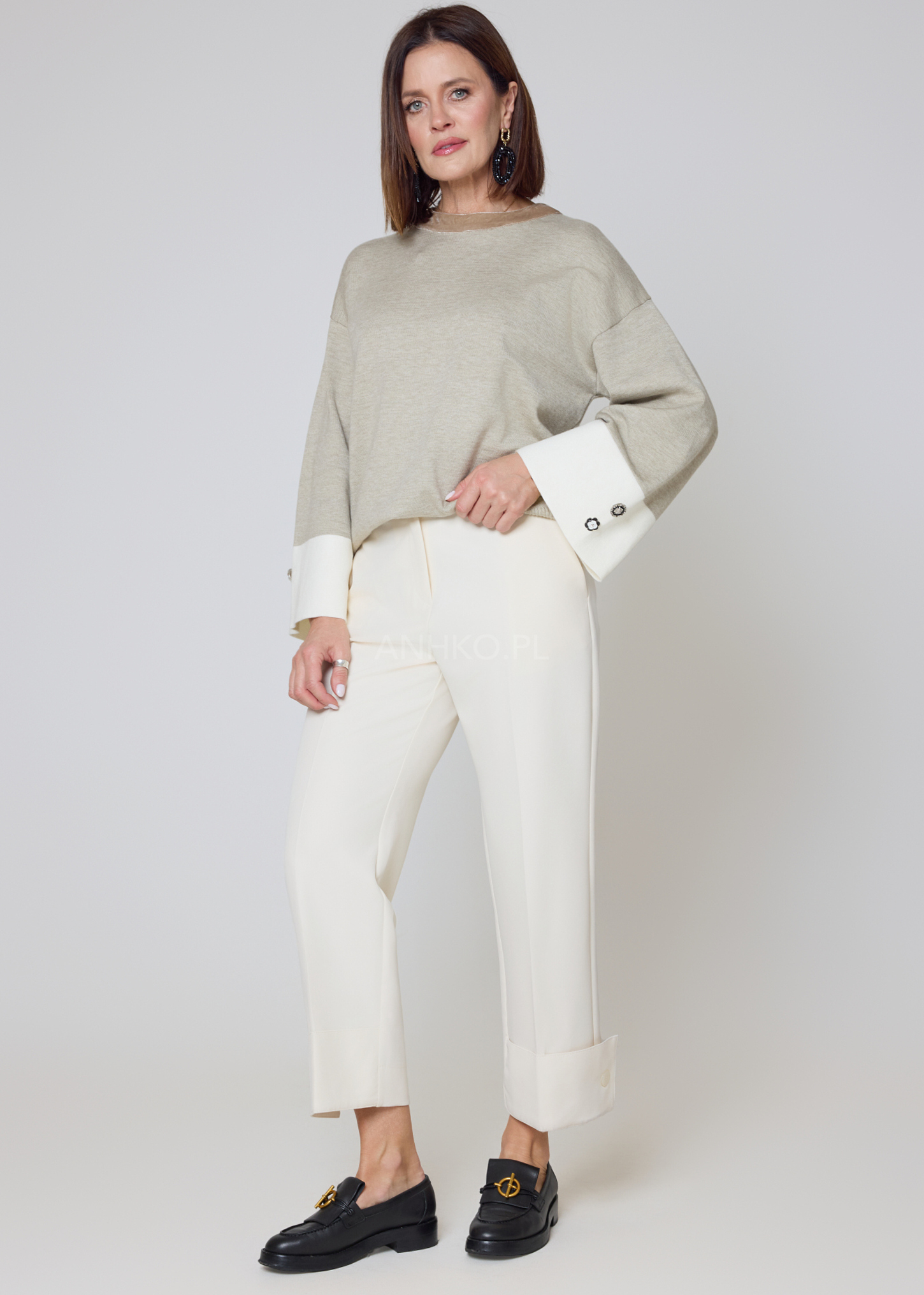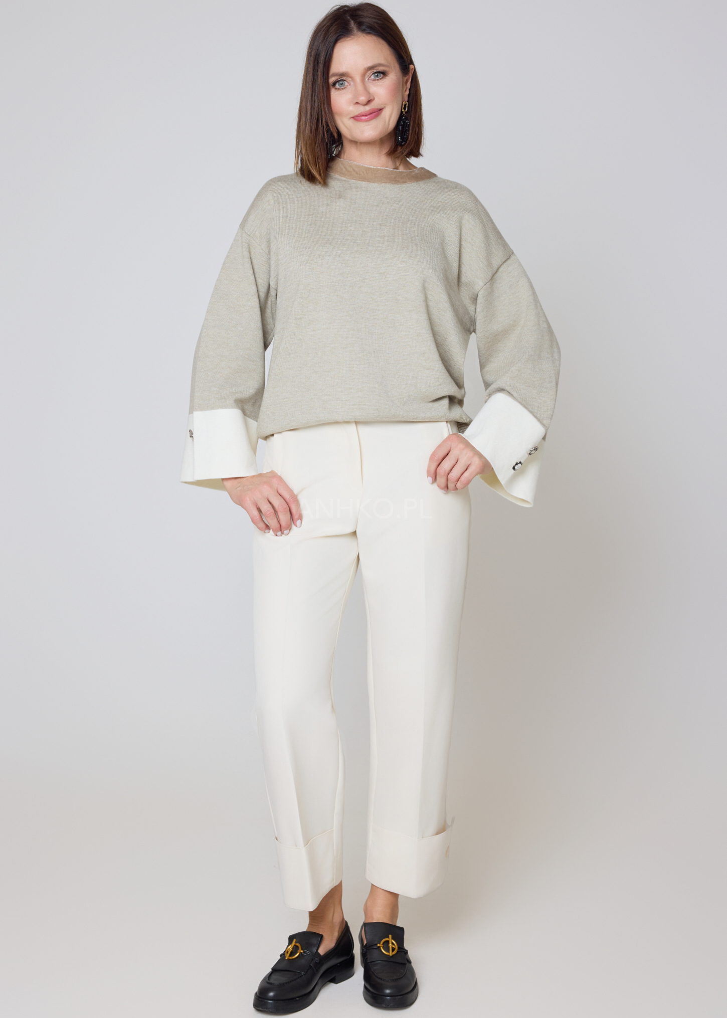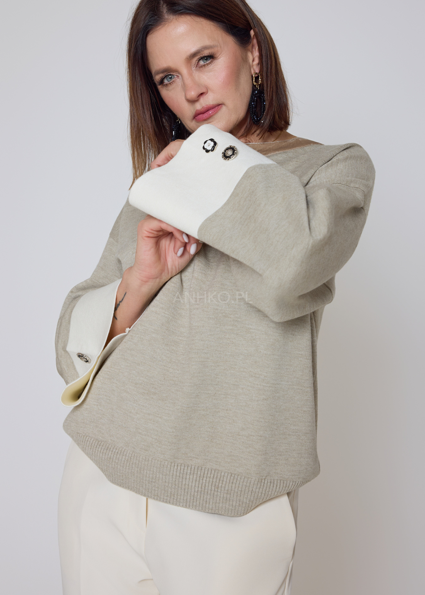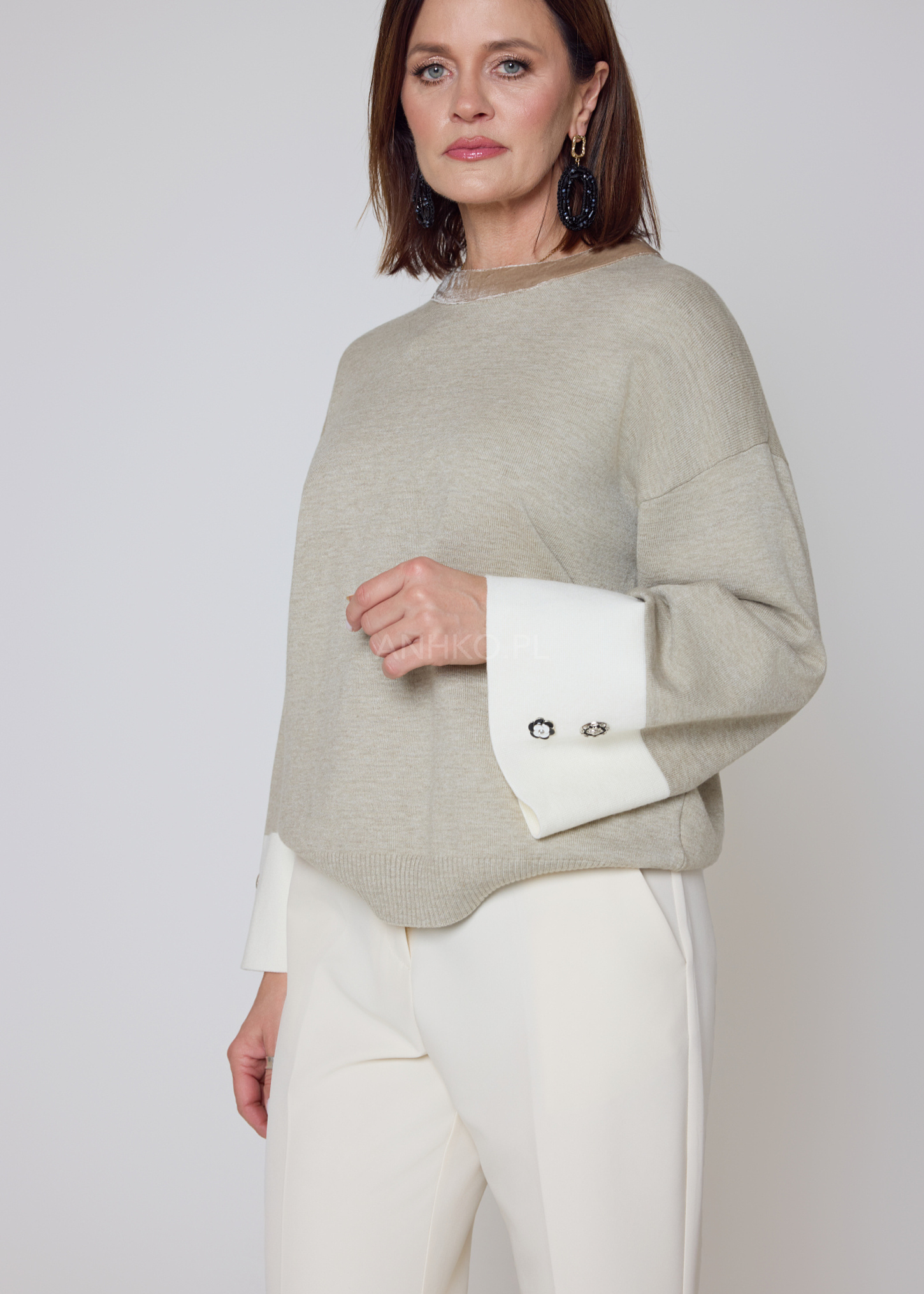Stylowy sweter o swobodnym kroju, wykonany z miękkiej mieszanki wiskozowej, zapewnia wyjątkowy komfort i dopasowanie. Kontrastowe, jasne mankiety zdobią dekoracyjne guziki, które nadają całości eleganckiego charakteru. Model nie posiada kieszeni ani podszewki, dzięki czemu zachowuje lekkość i świetnie układa się na sylwetce. Idealny do codziennych stylizacji z jeansami, jak i bardziej eleganckich zestawów z cygaretkami czy spódnicą. Doskonale sprawdzi się do pracy, na spotkania, kolacje oraz weekendowe wyjścia. Uniwersalna kolorystyka umożliwia łatwe łączenie z dodatkami, a delikatny kołnierz w innym odcieniu dodaje mu unikatowego stylu.