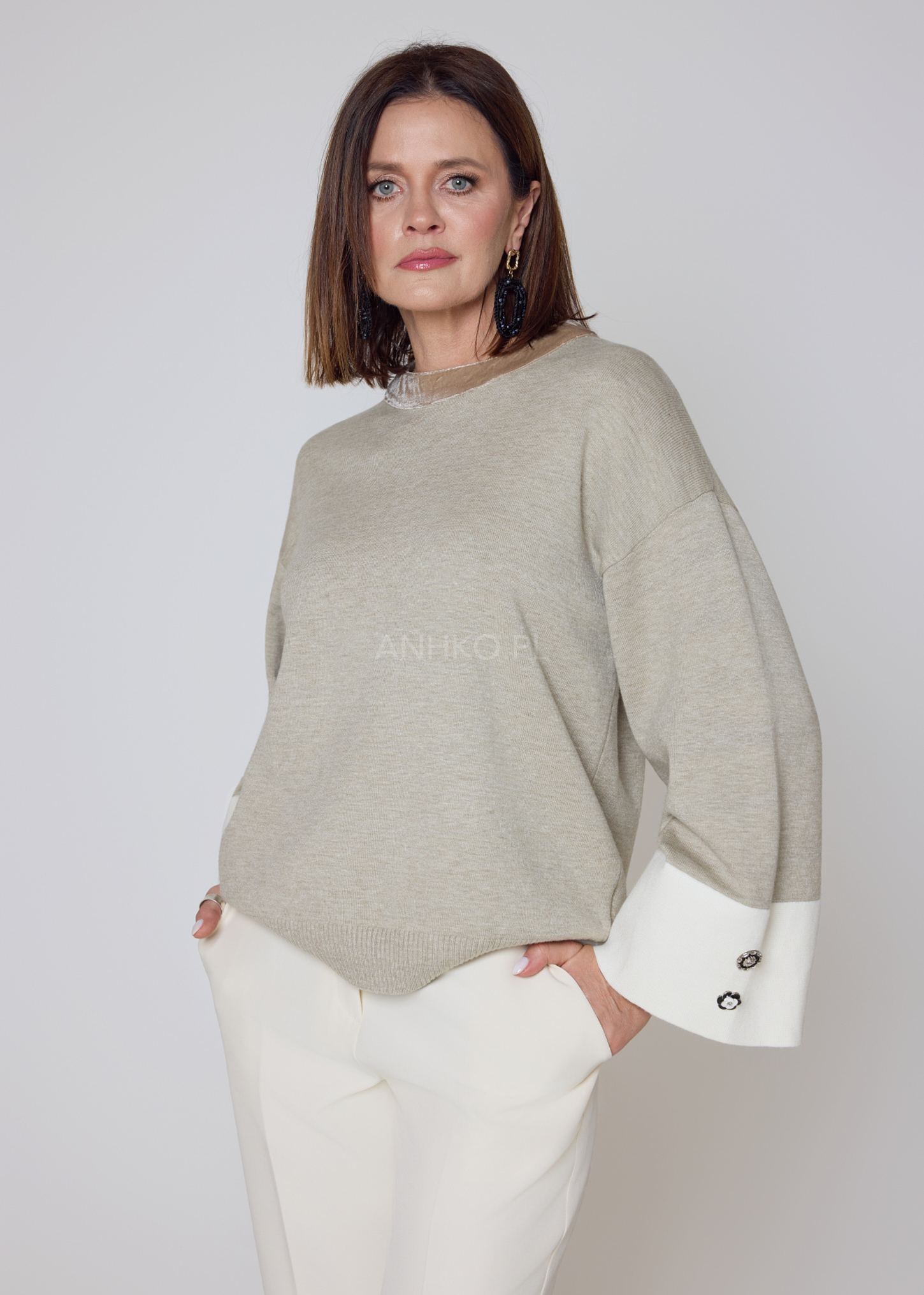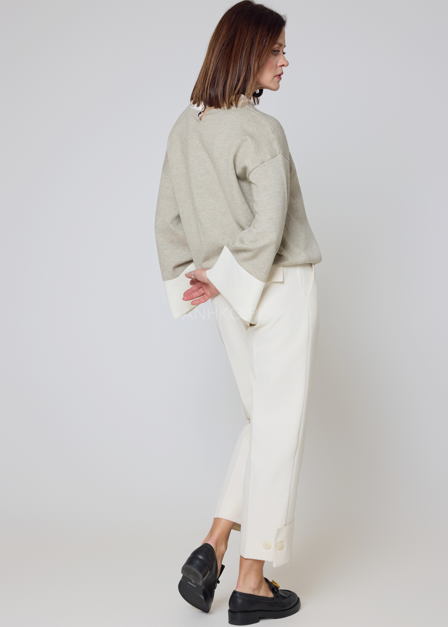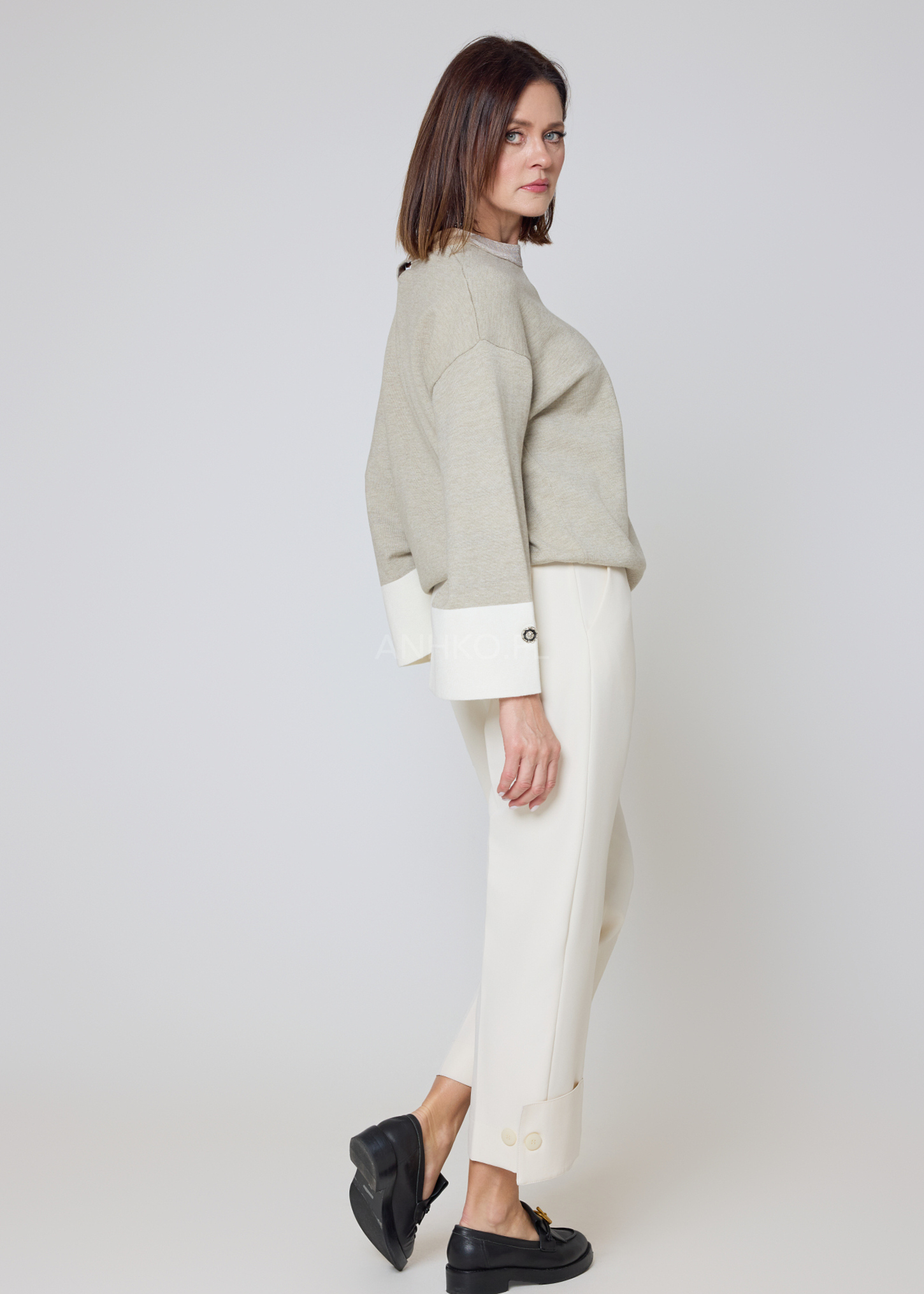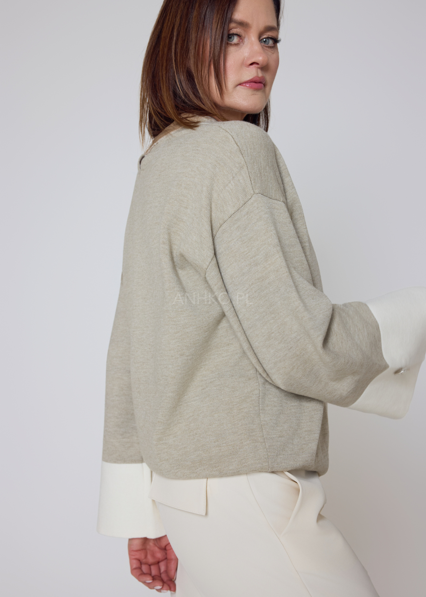 Stylowy sweter o swobodnym kroju, wykonany z miękkiej mieszanki wiskozowej, zapewnia wyjątkowy komfort i dopasowanie. Kontrastowe, jasne mankiety zdobią dekoracyjne guziki, które nadają całości eleganckiego charakteru. Model nie posiada kieszeni ani podszewki, dzięki czemu zachowuje lekkość i świetnie układa się na sylwetce. Idealny do codziennych stylizacji z jeansami, jak i bardziej eleganckich zestawów z cygaretkami czy spódnicą. Doskonale sprawdzi się do pracy, na spotkania, kolacje oraz weekendowe wyjścia. Uniwersalna kolorystyka umożliwia łatwe łączenie z dodatkami, a delikatny kołnierz w innym odcieniu dodaje mu unikatowego stylu.