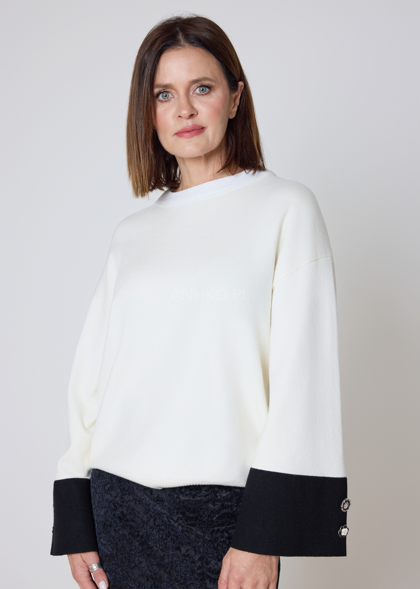 Stylowy sweter o swobodnym kroju, wykonany z miękkiej mieszanki wiskozowej, zapewnia wyjątkowy komfort i dopasowanie. Kontrastowe, jasne mankiety zdobią dekoracyjne guziki, które nadają całości eleganckiego charakteru. Model nie posiada kieszeni ani podszewki, dzięki czemu zachowuje lekkość i świetnie układa się na sylwetce. Idealny do codziennych stylizacji z jeansami, jak i bardziej eleganckich zestawów z cygaretkami czy spódnicą. Doskonale sprawdzi się do pracy, na spotkania, kolacje oraz weekendowe wyjścia. Uniwersalna kolorystyka umożliwia łatwe łączenie z dodatkami, a delikatny kołnierz w innym odcieniu dodaje mu unikatowego stylu.