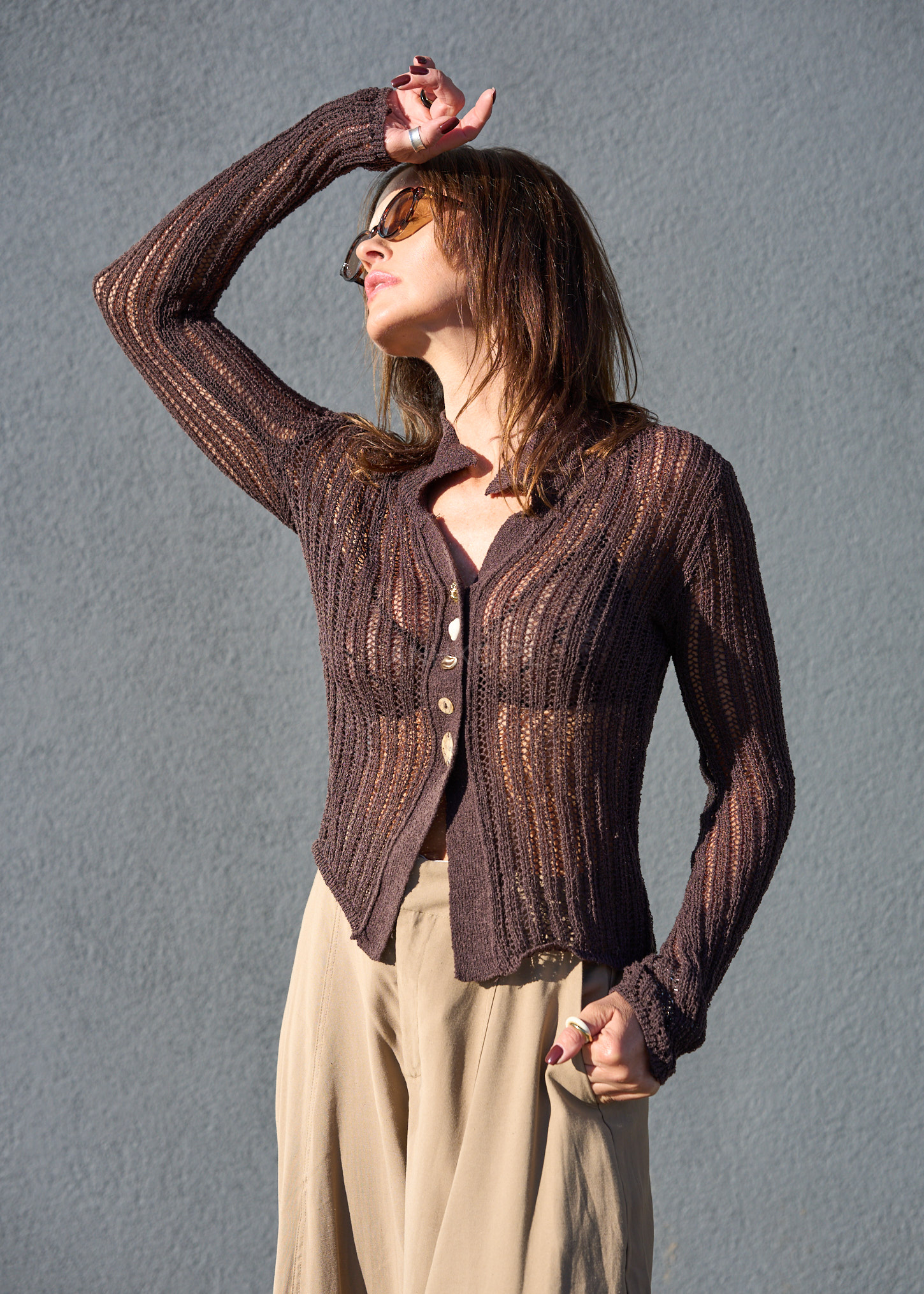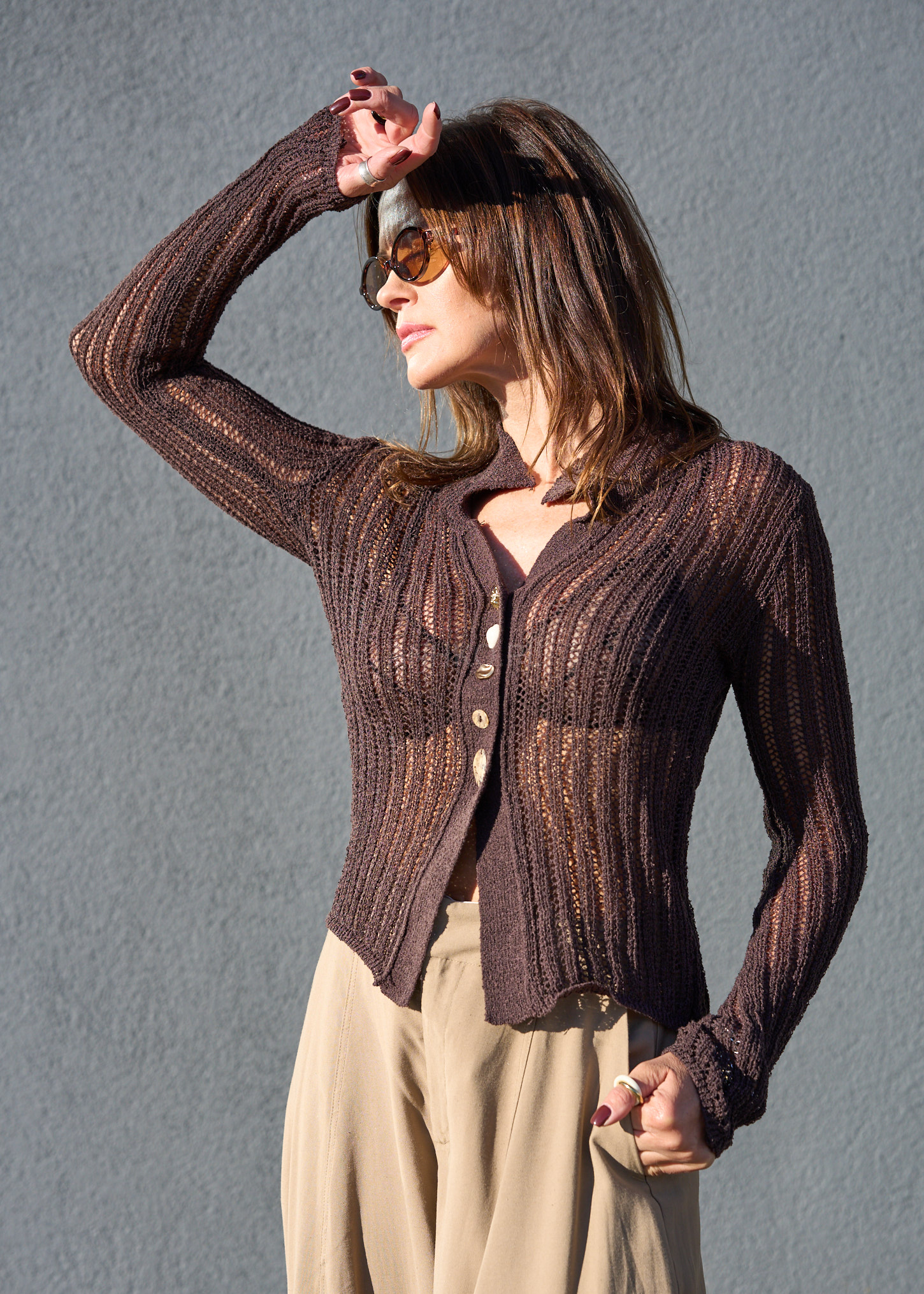 To połączenie elegancji i lekkości w nowoczesnym wydaniu. Wykonany w całości z miękkiej wiskozy, posiada ażurowy splot, który pięknie eksponuje sylwetkę, jednocześnie pozostając niezwykle komfortowym. Różnorodne guziki – w tym złoty element dekoracyjny – nadają mu wyjątkowego, artystycznego stylu. Model z długim rękawem, kołnierzykiem i dopasowanym krojem sprawdzi się zarówno w casualowych, jak i eleganckich stylizacjach. Doskonały do spodni z wysokim stanem, spódnic czy jeansów. Idealny wybór na sezon wiosenno-letni.