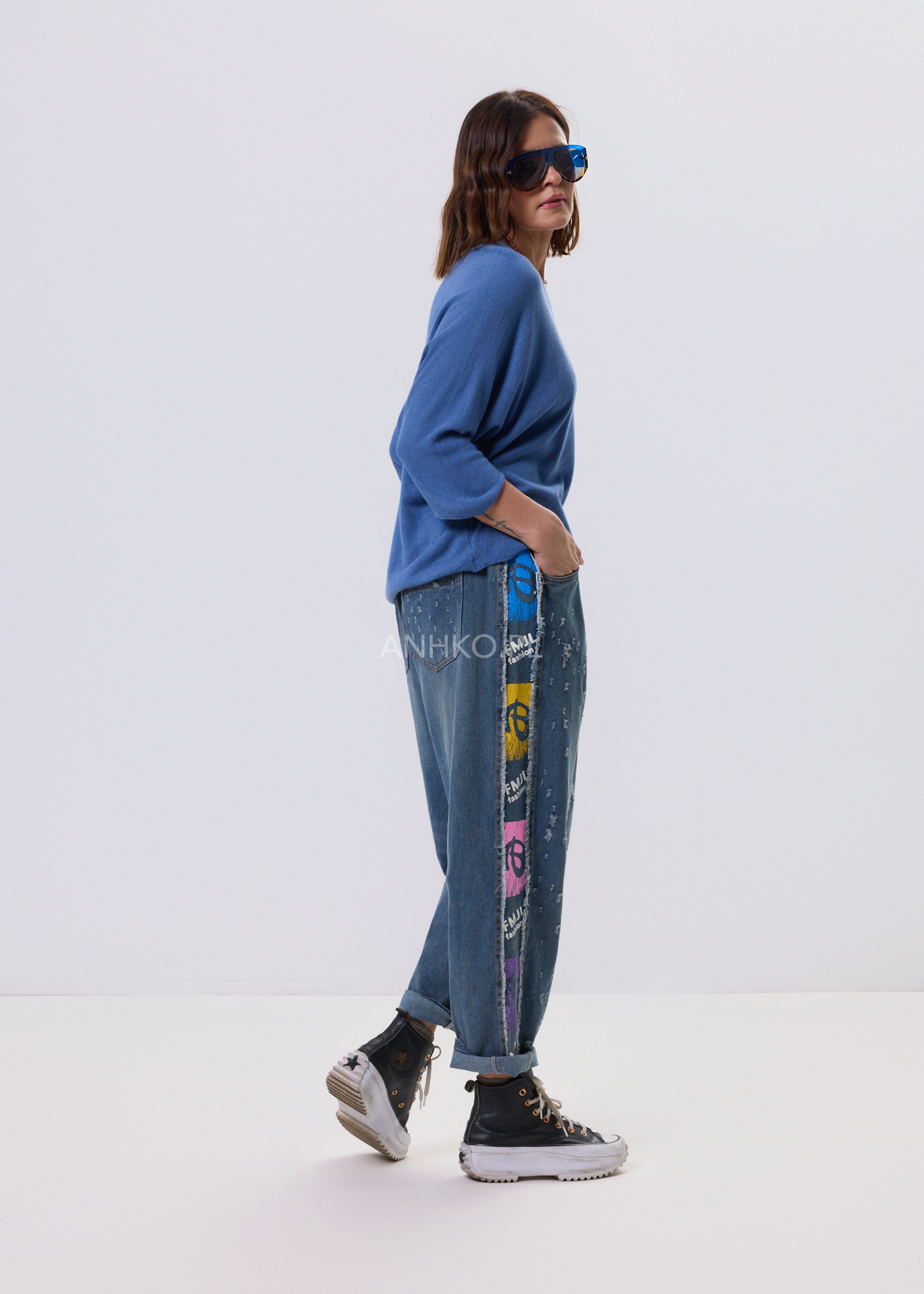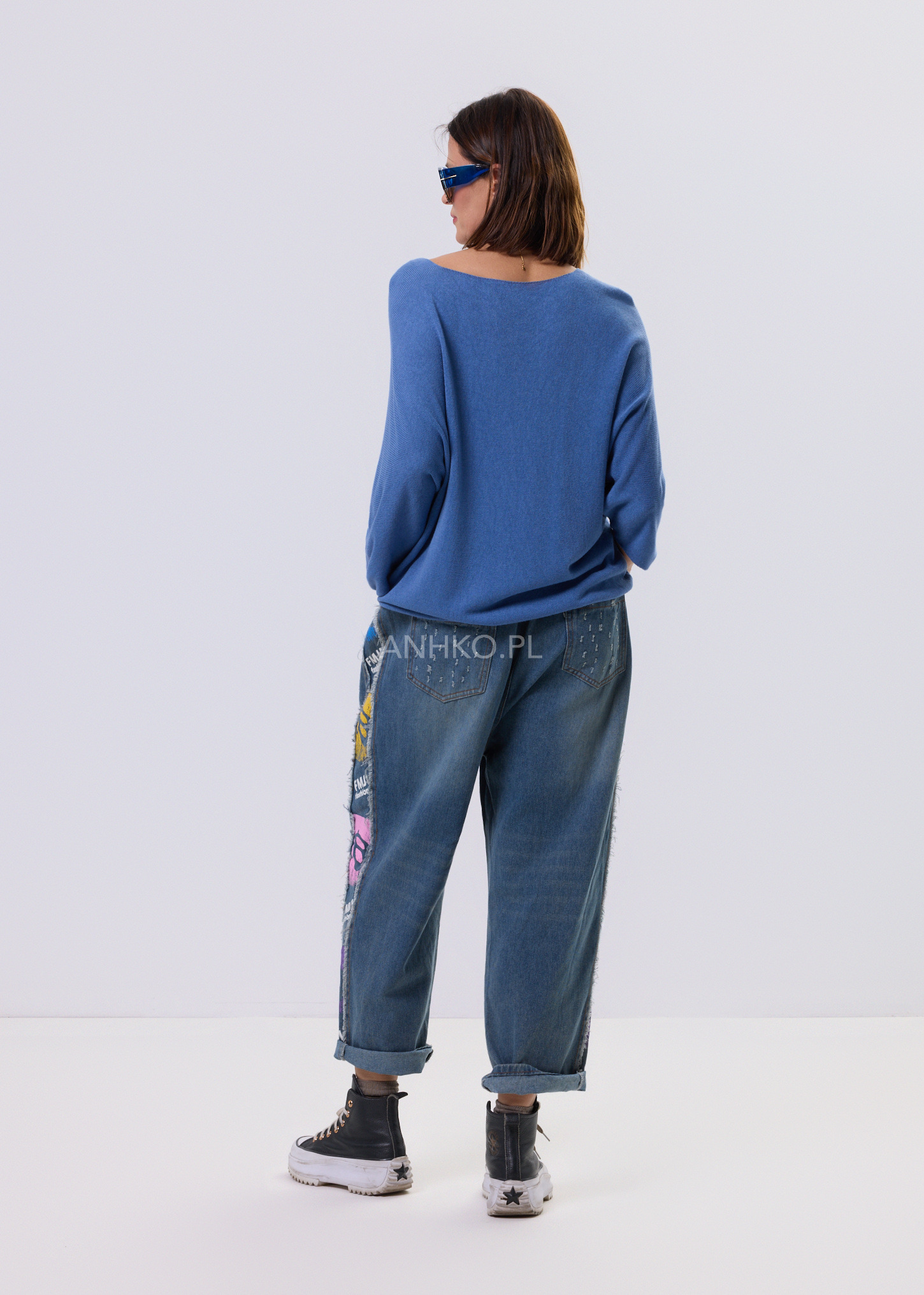 To dzianinowy sweterek o nietoperzowym kroju. Model z dekoltem typu V-neck oraz rękawem długości 3/4. Na dole swetra wszyto ściągacze.