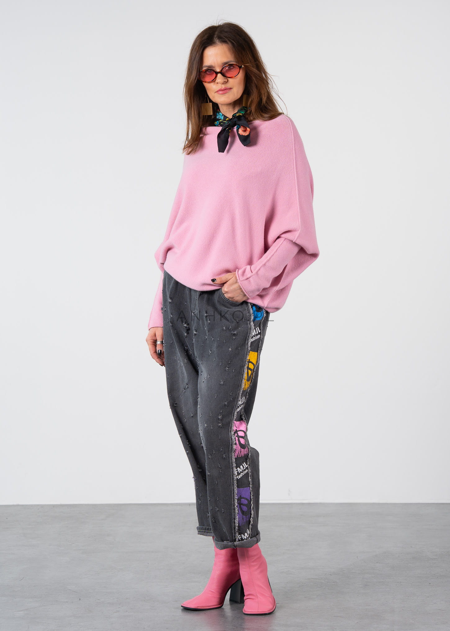 Pudroworóżowy odcień dodaje całości subtelności i świeżości, a oversize’owy fason zapewnia pełen komfort noszenia. Asymetryczny dół przełamuje klasykę, a miękka dzianina sprawia, że model świetnie wpisuje się zarówno w codzienne stylizacje, jak i bardziej dopracowane zestawy.