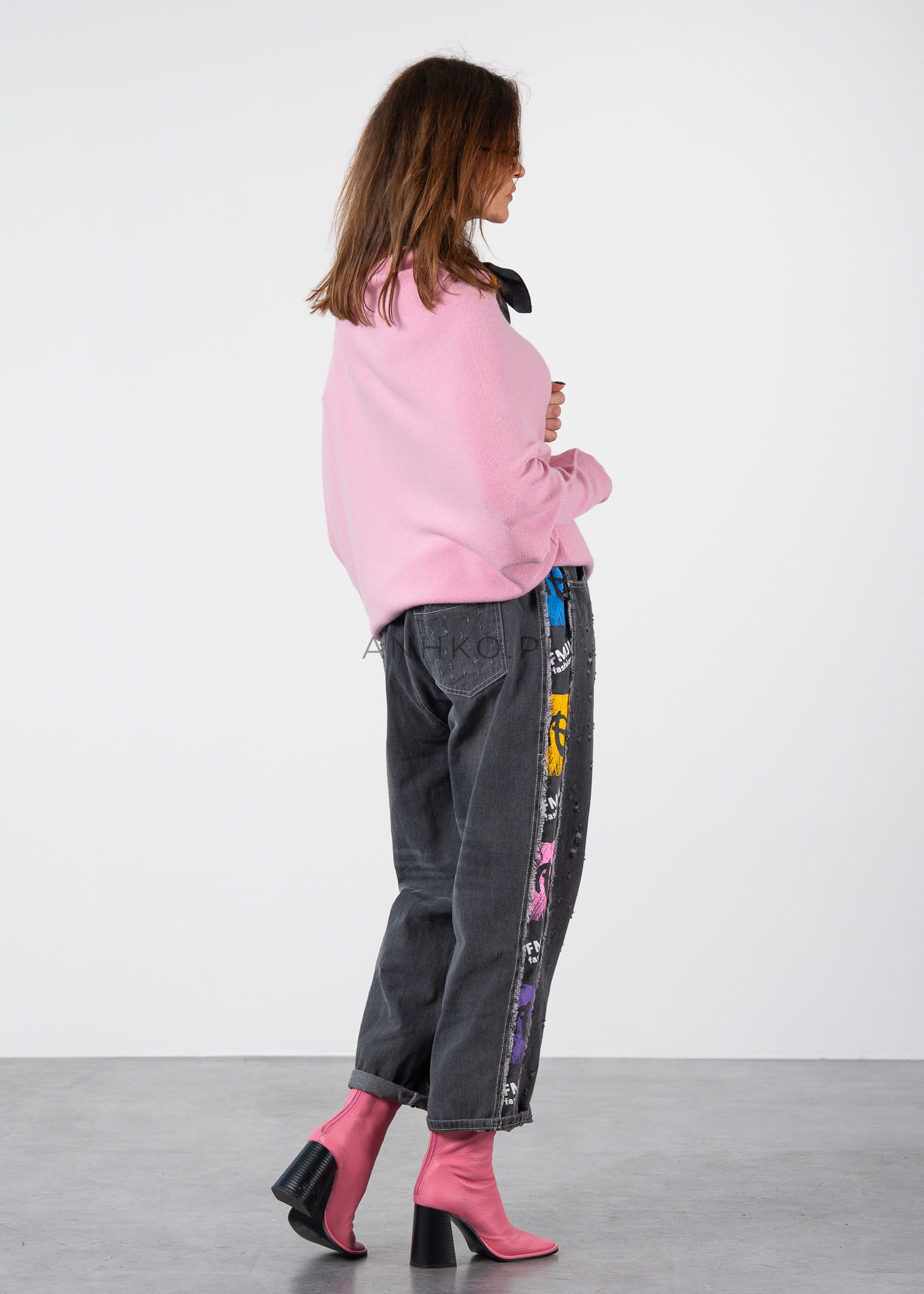 Jeansy Distressed Joggers - Stylowe i wygodne jeansowe joggery z efektem przetarcia i designerskimi nadrukami po bokach. Połączenie miejskiego stylu z luzem sprawia, że to doskonały wybór na co dzień. Wygodny elastyczny pas i troczki zapewniają idealne dopasowanie.