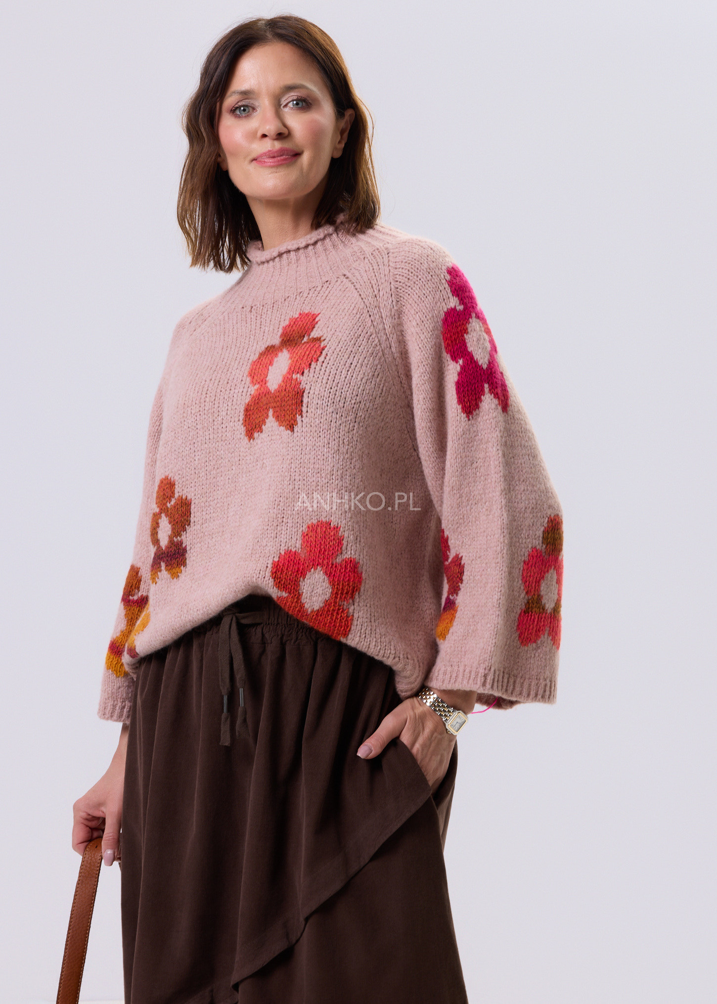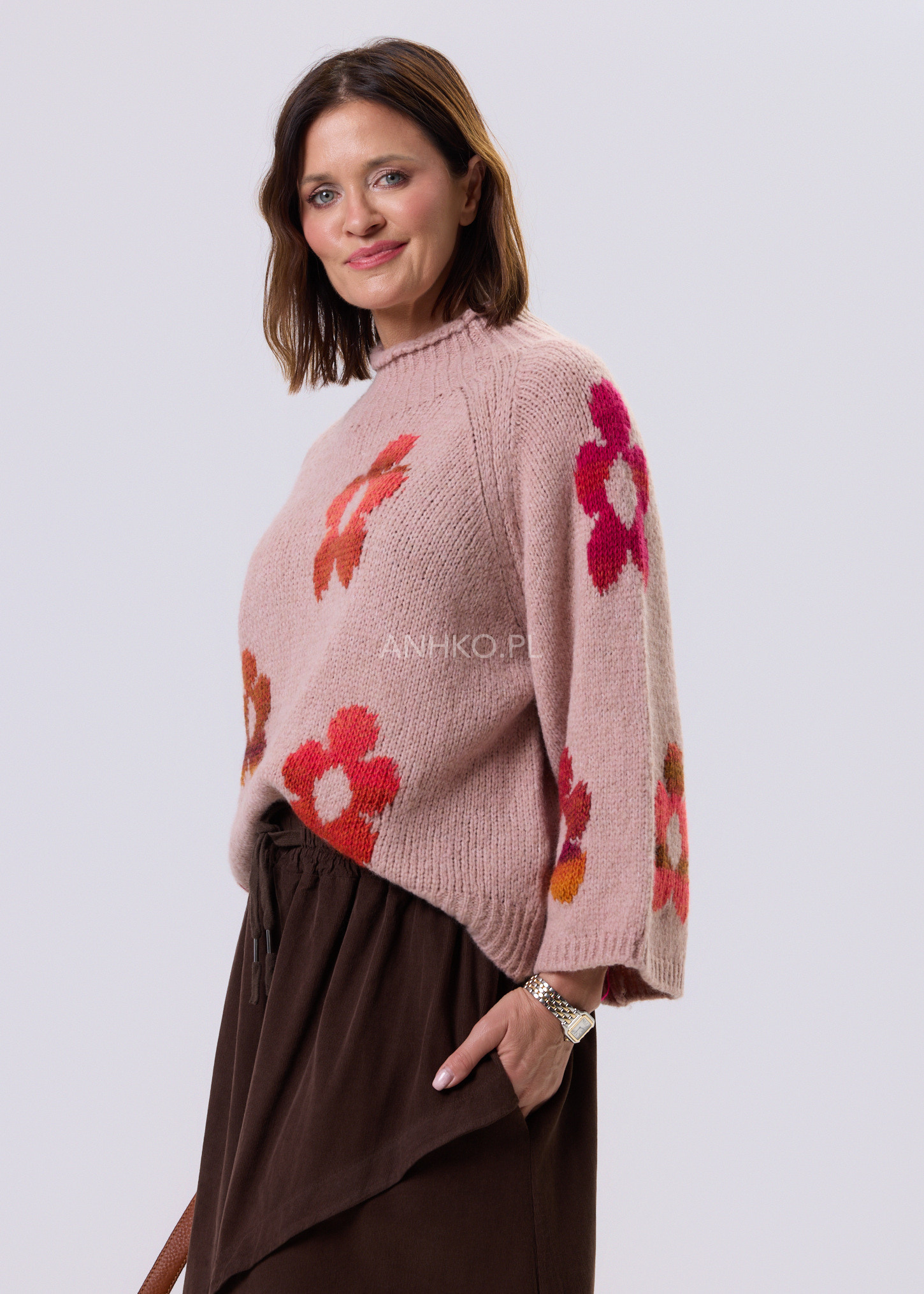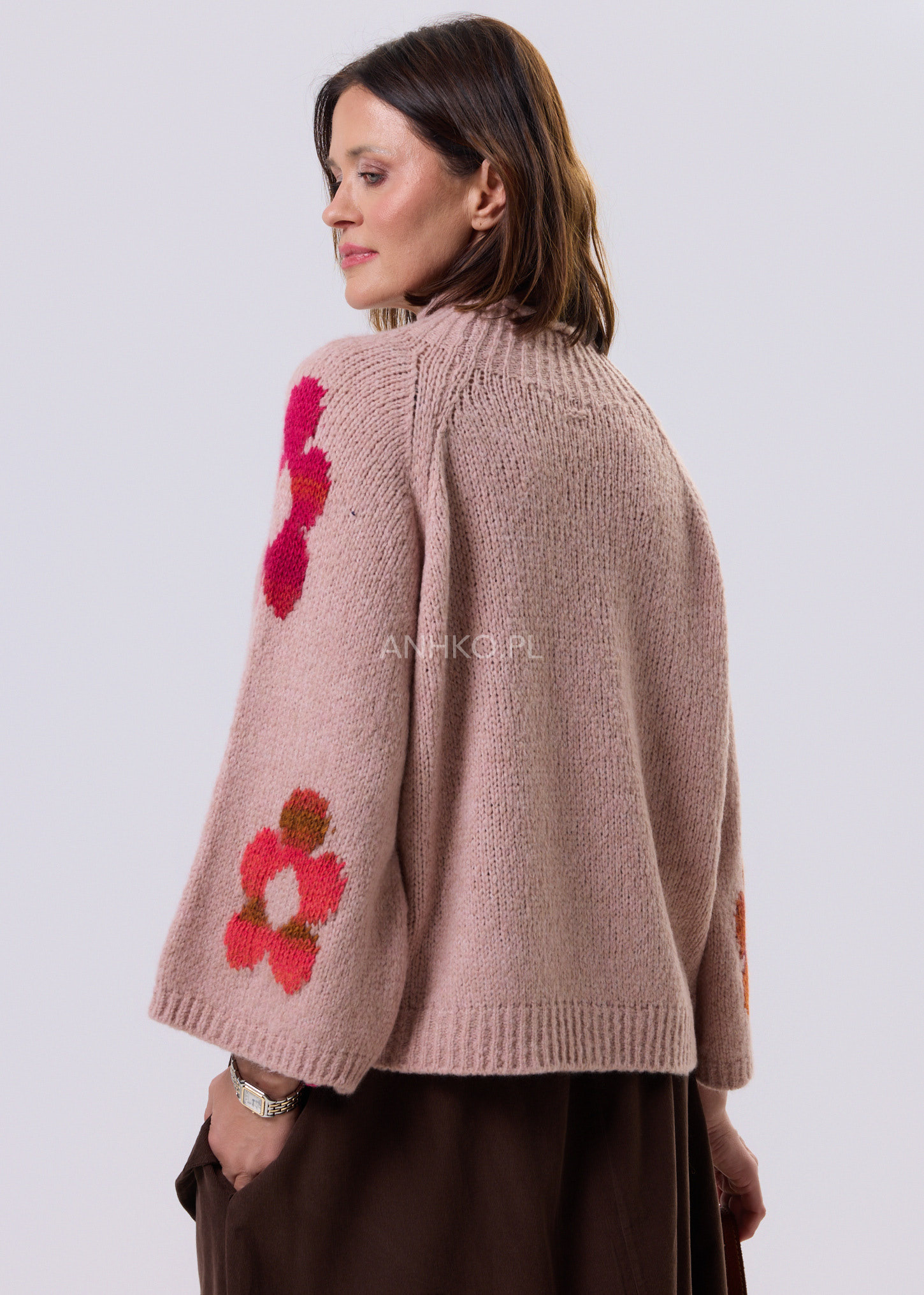 To połączenie klasycznego, jesienno-zimowego komfortu z uroczym retro designem. Głęboki różowy kolor podkreślają kwiatowe akcenty w ciepłych odcieniach, które nadają mu unikalnego stylu. Wykonany z wysokiej jakości włoskich materiałów, jest miękki, przyjemny w dotyku i doskonale ogrzewa w chłodne dni. Luźny fason świetnie wygląda zarówno z jeansami, jak i spódnicami, tworząc casualowe lub bardziej stylowe zestawy. Idealny na co dzień, spacery, spotkania z przyjaciółmi czy weekendowe wyjazdy. To sweter, który wyróżni Twoją garderobę.