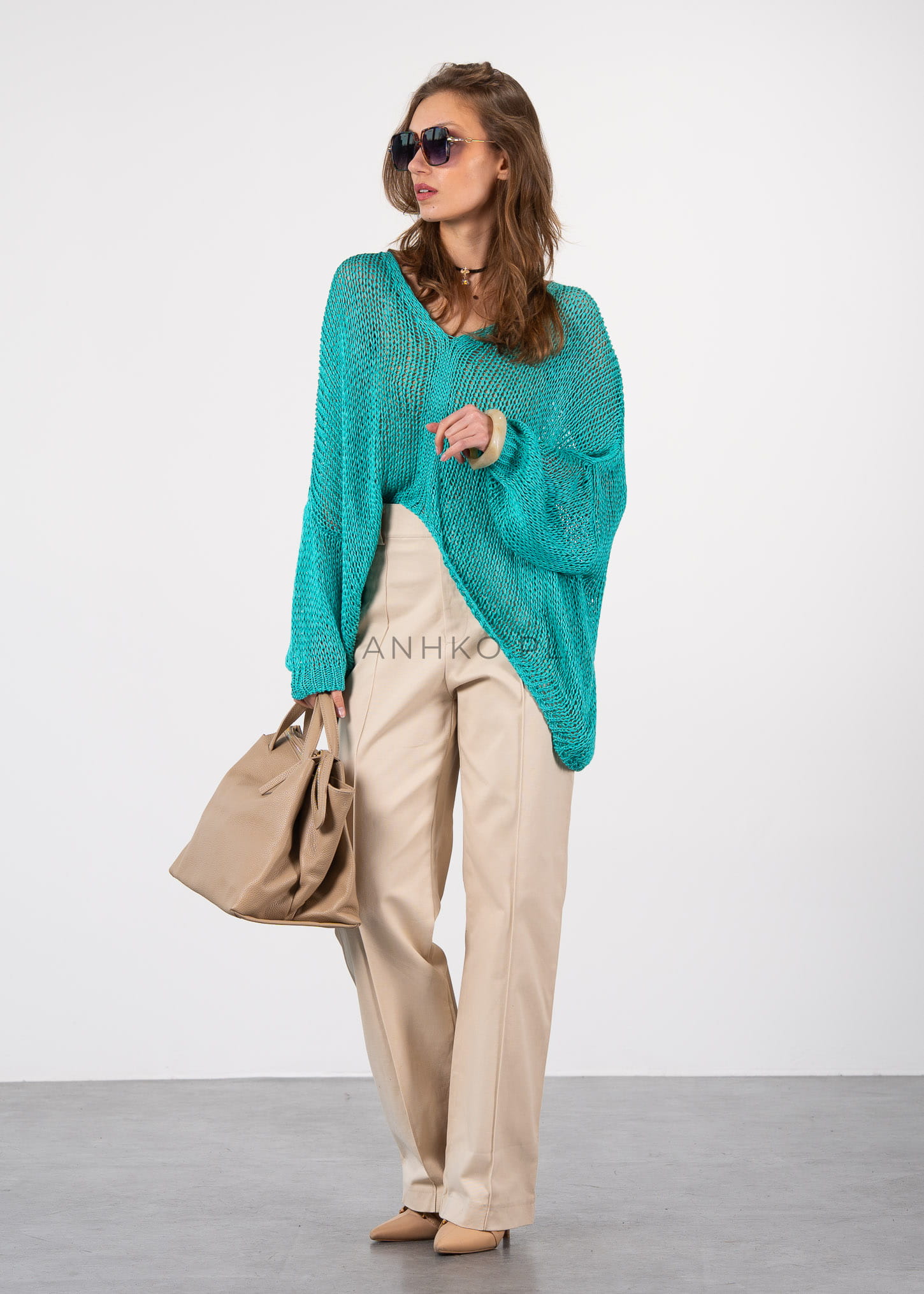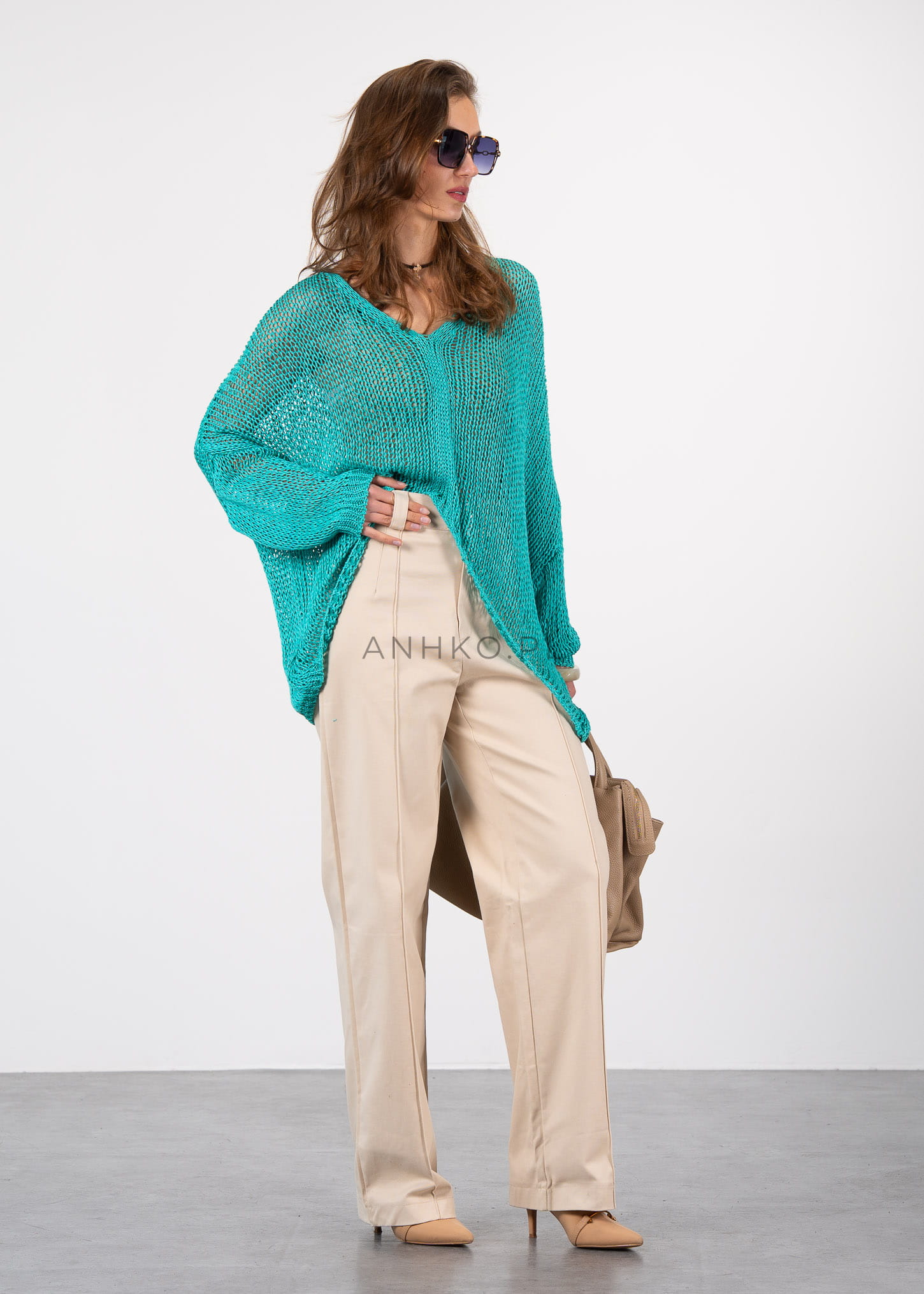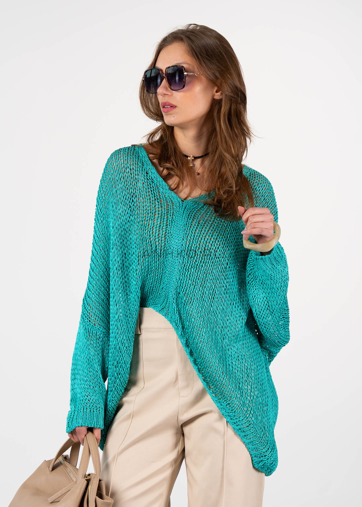 Sweter Sawa Turkusowy - Przewiewny, turkusowy sweter wykonany z wysokiej jakości akrylu, idealny na wiosenne i letnie dni. Jego luźny splot i nowoczesny design sprawiają, że jest nie tylko wygodny, ale także stylowy. Ten sweter doskonale komponuje się z casualowymi stylizacjami, dodając im lekkości i elegancji.