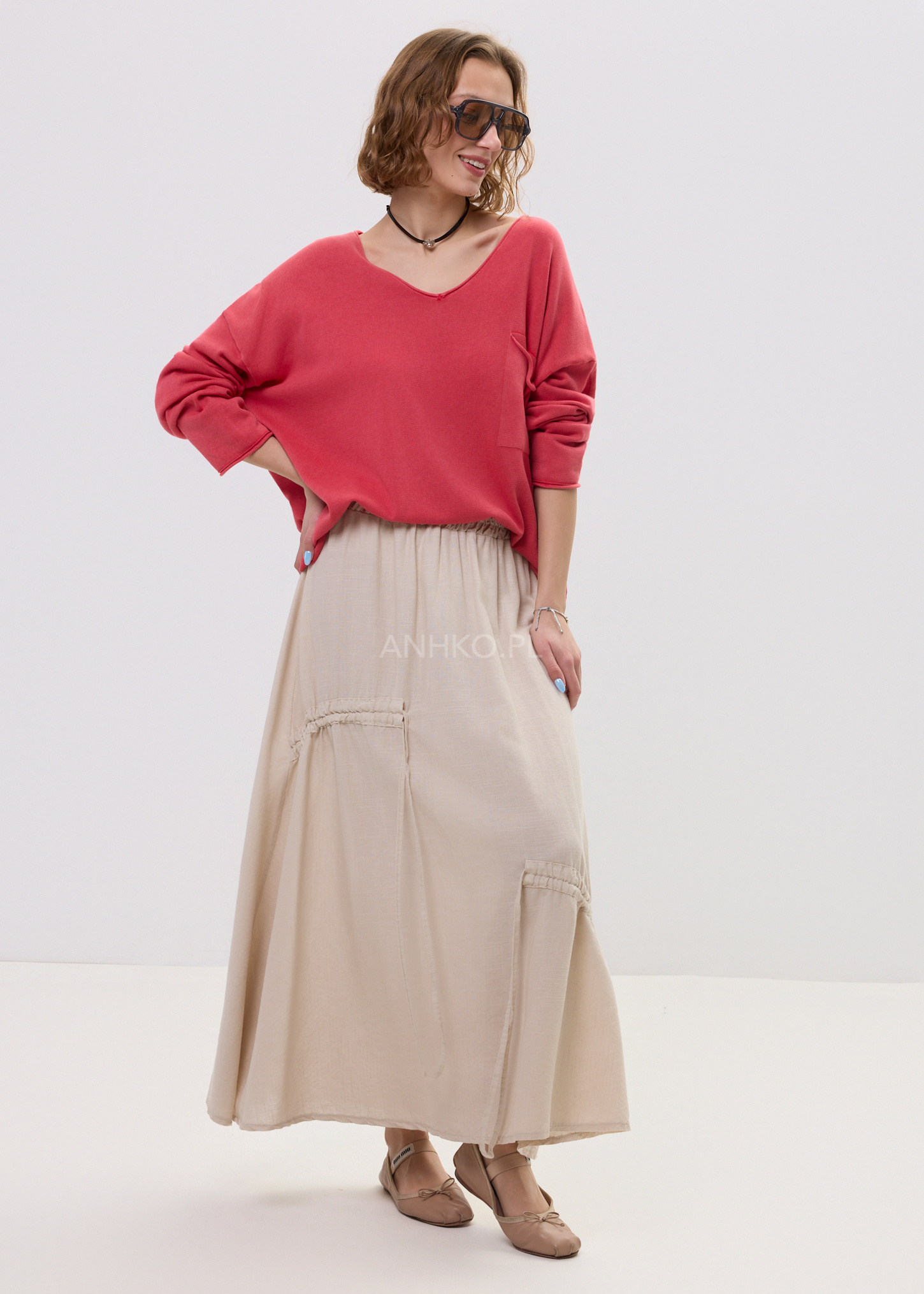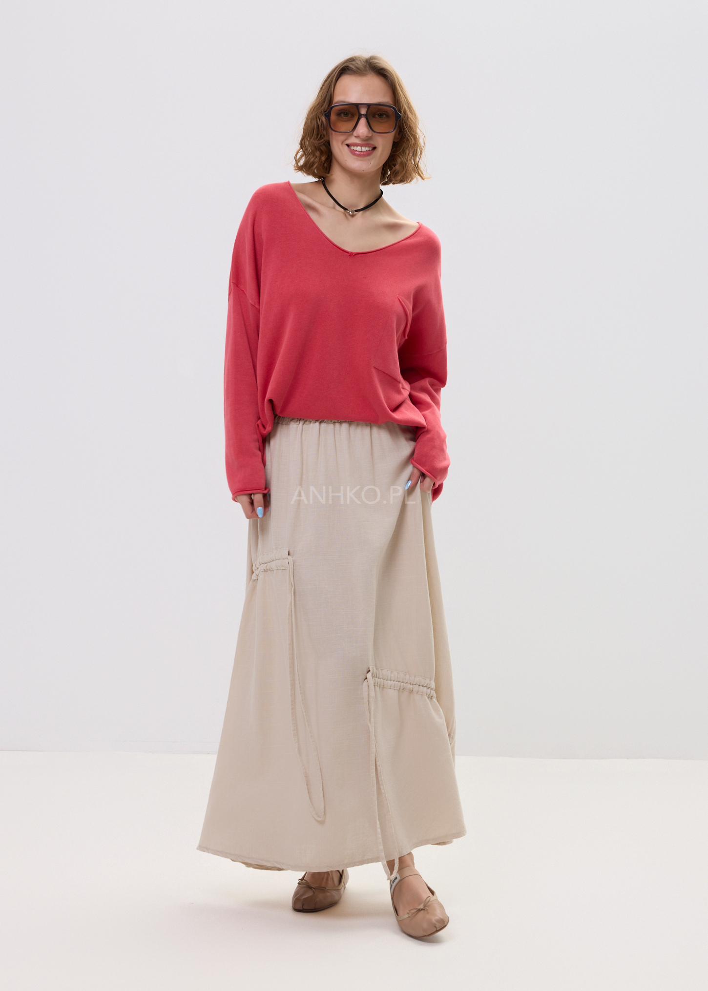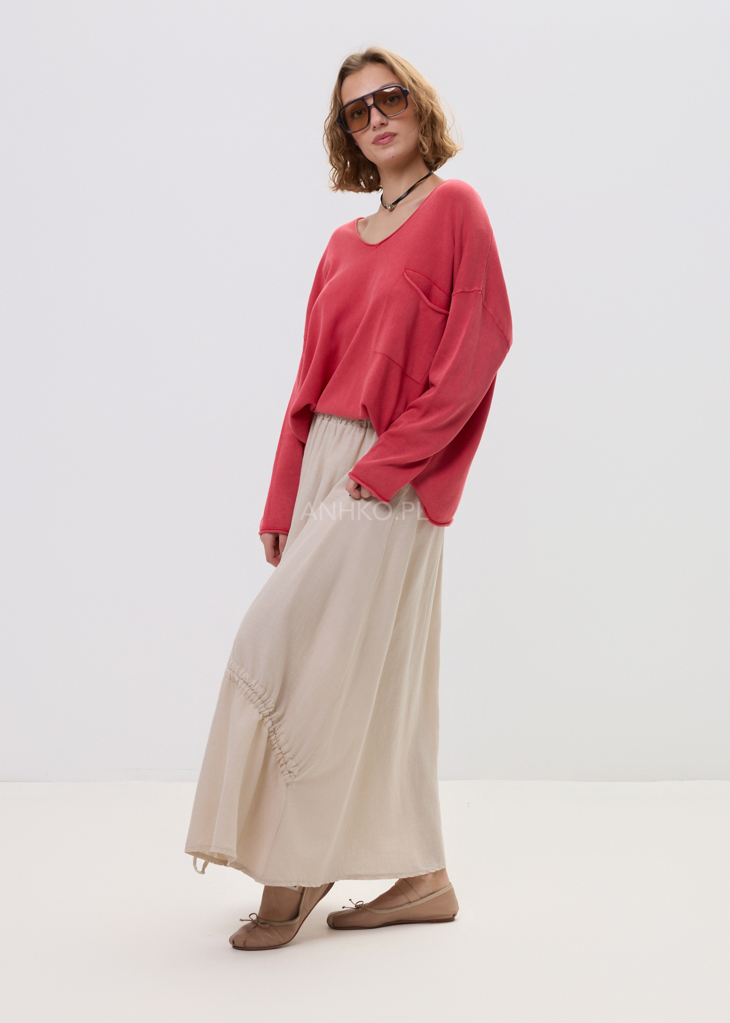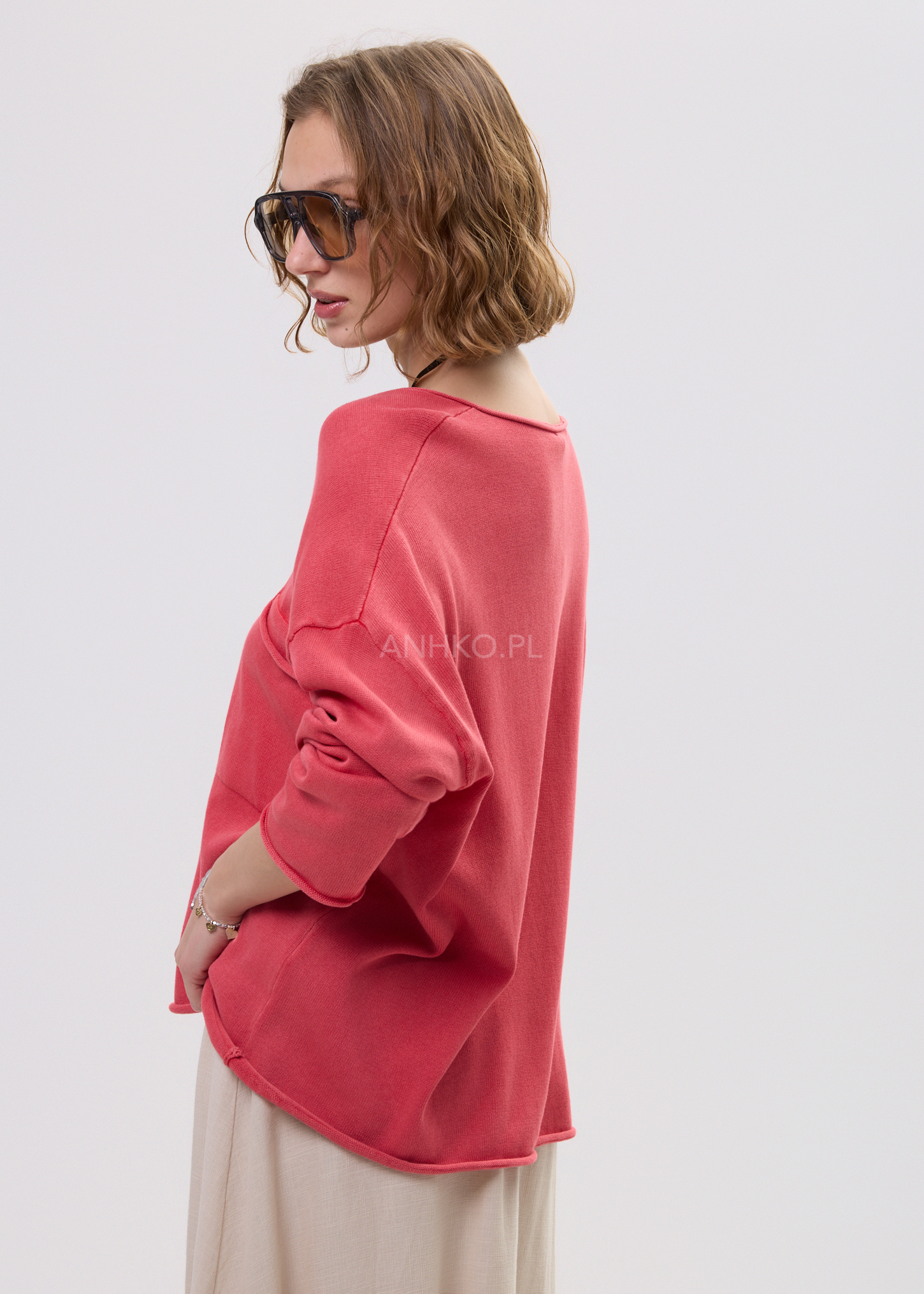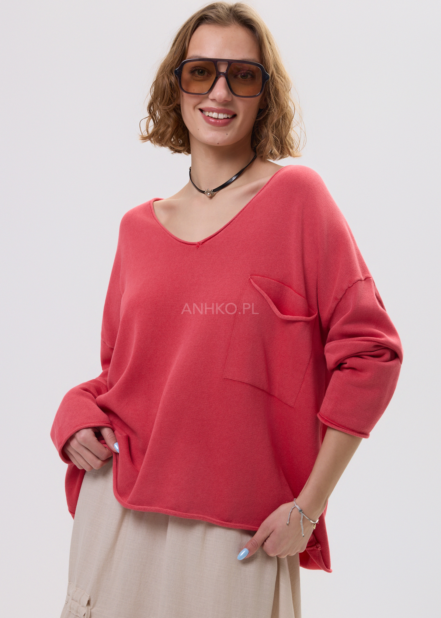 Ten sweter oversize w jasnym, uniwersalnym odcieniu doskonale układa się na sylwetce, tworząc swobodny i nowoczesny look. Miękka dzianina subtelnie otula ciało, a głęboki dekolt w kształcie litery V optycznie wysmukla górną część sylwetki i nadaje stylizacji lekkości. Luźna linia z delikatnie opadającymi ramionami sprawia, że model prezentuje się naturalnie i stylowo.