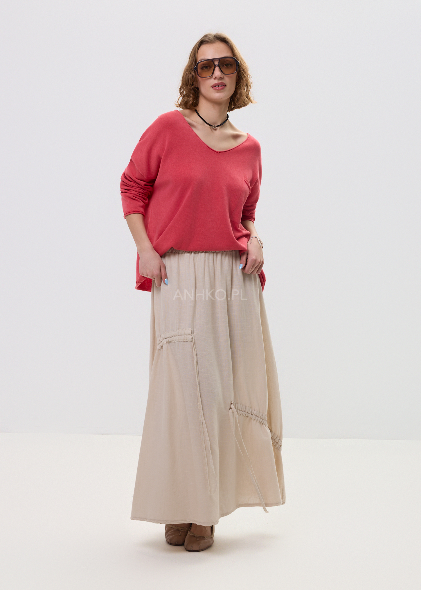 - Dekolt: Głęboki dekolt w kształcie litery V subtelnie wysmuklający sylwetkę.