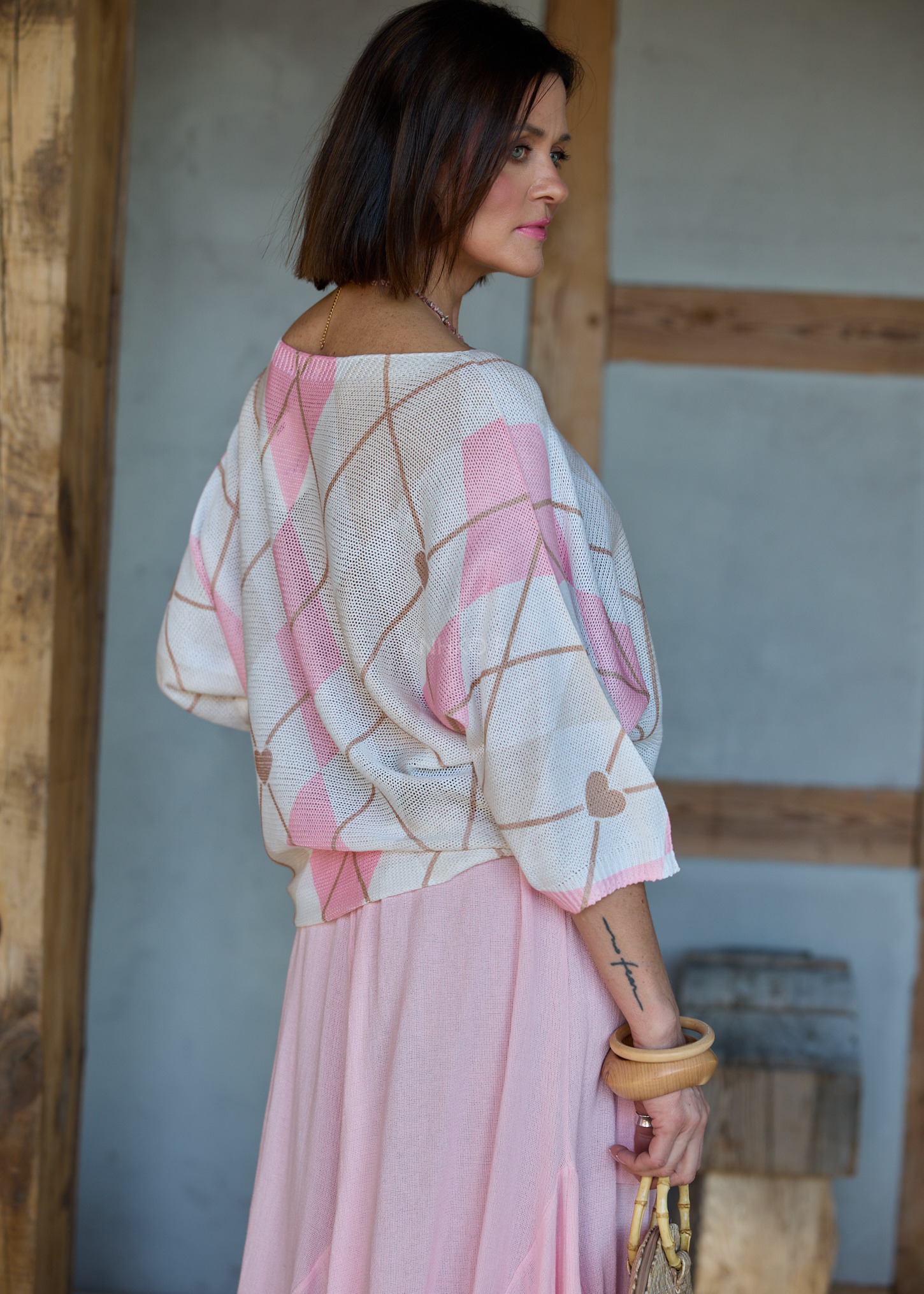 Uwagę przyciąga unikalny wzór w romby i serduszka, który nadaje całości dziewczęcego charakteru i wyróżnia stylizację bez wysiłku. Lekka, przyjemna w dotyku dzianina sprawia, że sweter świetnie sprawdza się jako element warstwowego looku – zarówno solo, jak i w połączeniu z ulubioną narzutką czy marynarką.