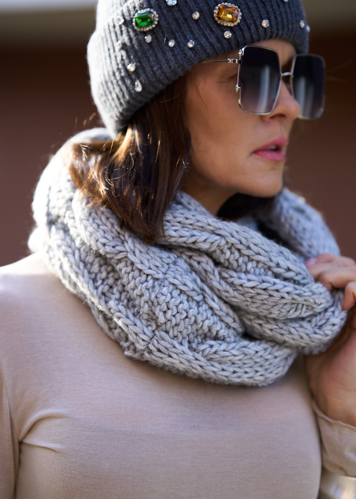 Komin Lizzy to doskonały dodatek na chłodne zimowe dni. Wykonany z dzierganego i plecionego materiału, w jasnoszarym kolorze, świetnie otula szyję, zapewniając maksymalne ciepło i wygodę. Idealnie pasuje do casualowych, codziennych stylizacji oraz na zimowe spacery. Możliwość dokupienia do zestawu pasującej czapki sprawia, że komplet staje się jeszcze bardziej uniwersalny i stylowy. To funkcjonalny i modny dodatek, który wpisuje się w trendy sezonu.