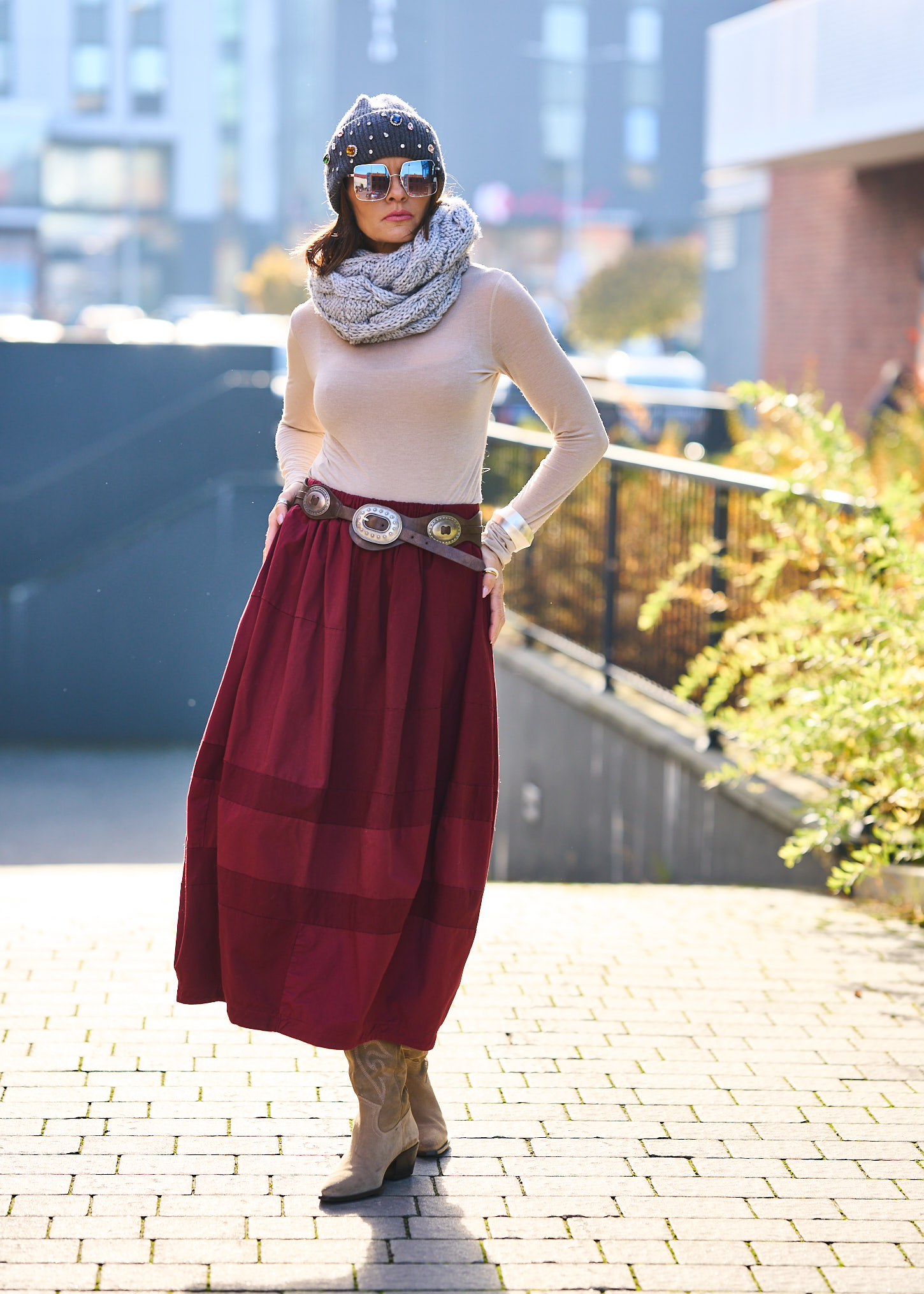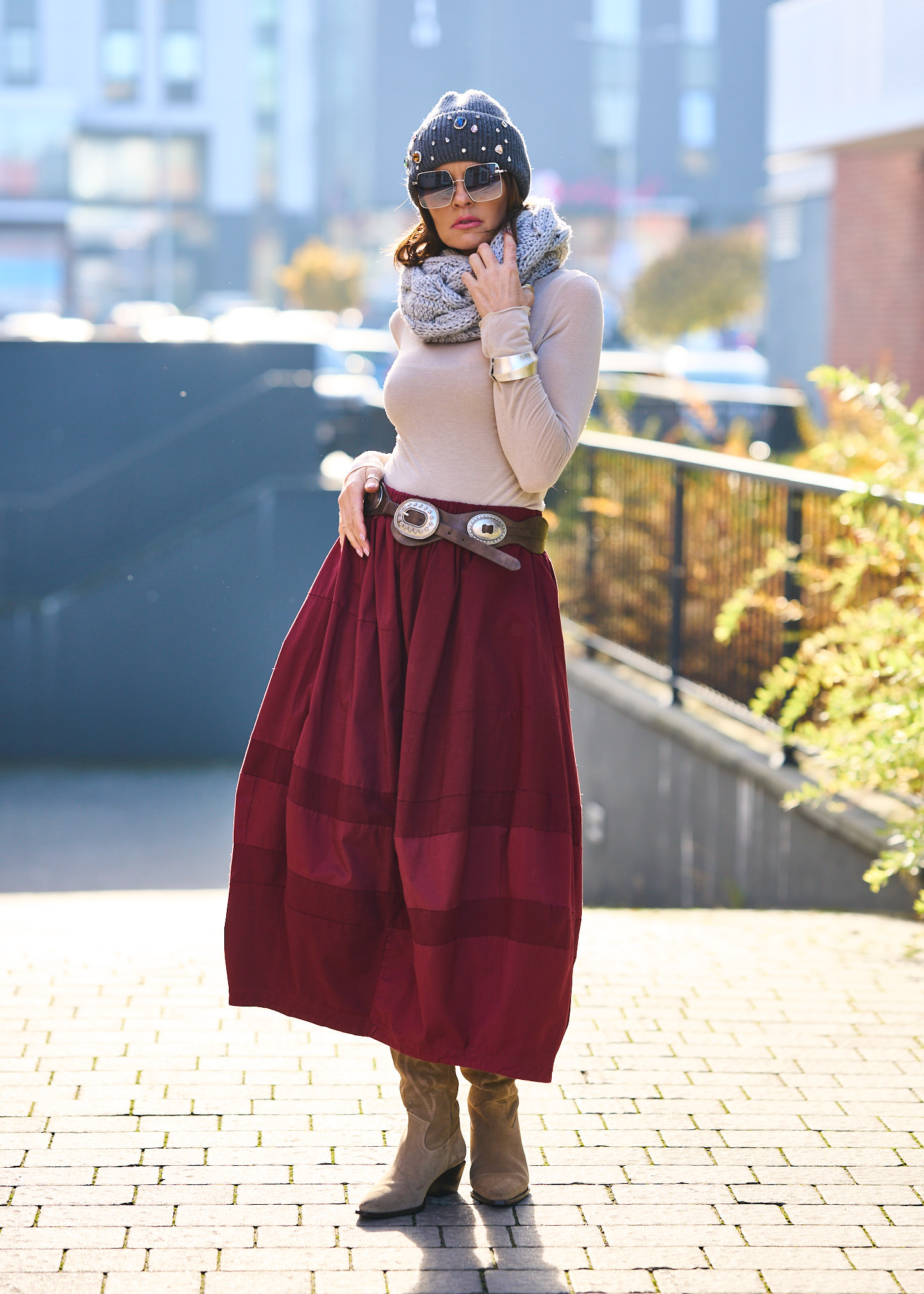 Spódnica Deliss Bordowa - Przepiękna spódnica o kroju bombki wykonana ze sztywniejszego materiału i wyposażona w gumkę w pasie.