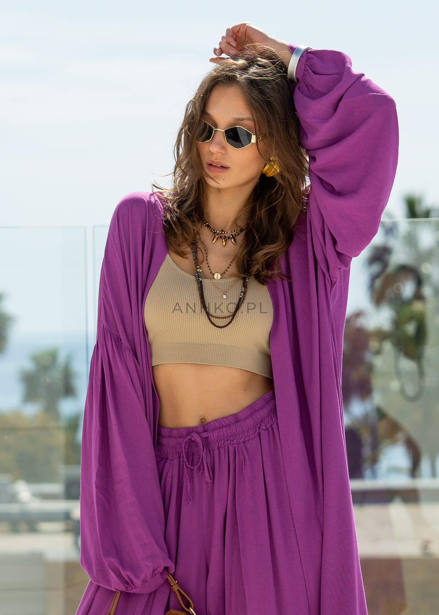 Lekkie i przewiewne spodnie Putardo w klasycznym fioletowym kolorze. Model oversize z gumką i sznurkiem w pasie zapewnia maksymalny komfort noszenia. Rozszerzana nogawka, subtelne zaszewki i praktyczne kieszenie sprawiają, że to idealny wybór na co dzień i wyjątkowe okazje.