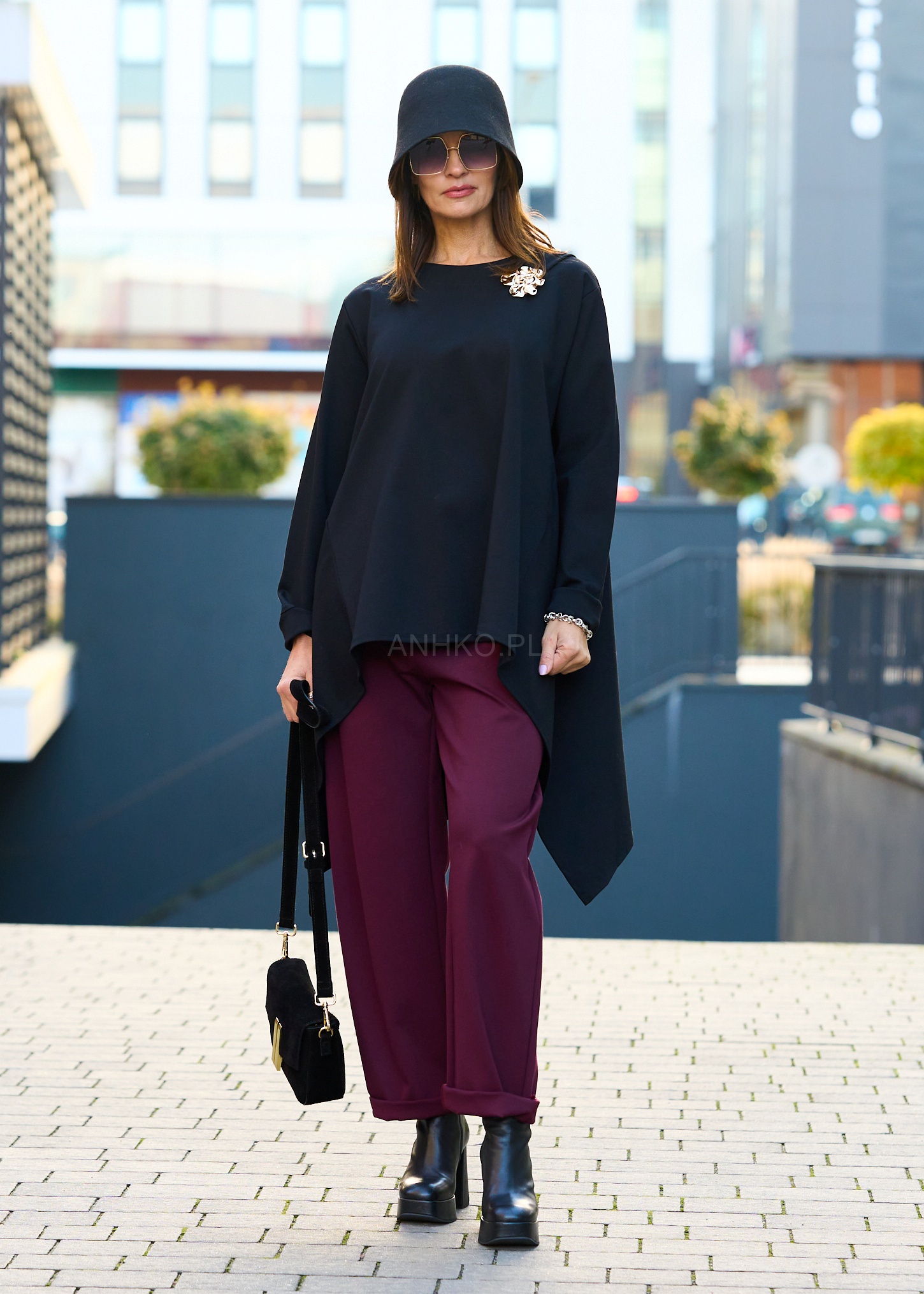 To połączenie elegancji i subtelnej nowoczesności. Wykonana z wysokogatunkowej, miękkiej tkaniny, doskonale układa się na sylwetce i zapewnia komfort noszenia. czarny kolor w zestawieniu ze złotą aplikacją w formie kwiatowej broszy nadaje bluzce luksusowego charakteru. Dłuższy, lekko asymetryczny tył i prosty krój sprawiają, że świetnie komponuje się zarówno ze spodniami, jak i spódnicą. Idealna do biura, na spotkania biznesowe lub eleganckie wyjścia. Dzięki ponadczasowej kolorystyce i detalowi ze złotym akcentem, stanowi bazę dla wielu stylizacji – od klasycznej po casual chic.
