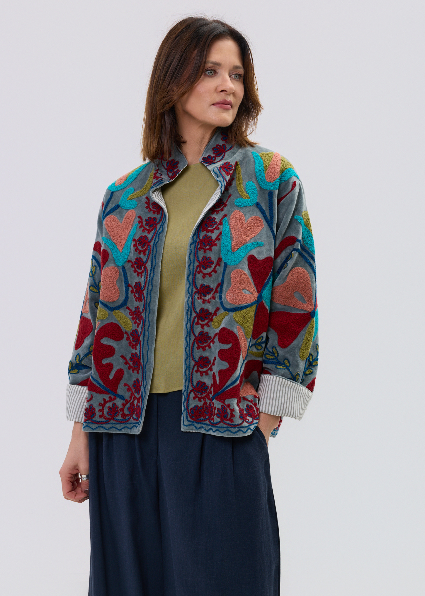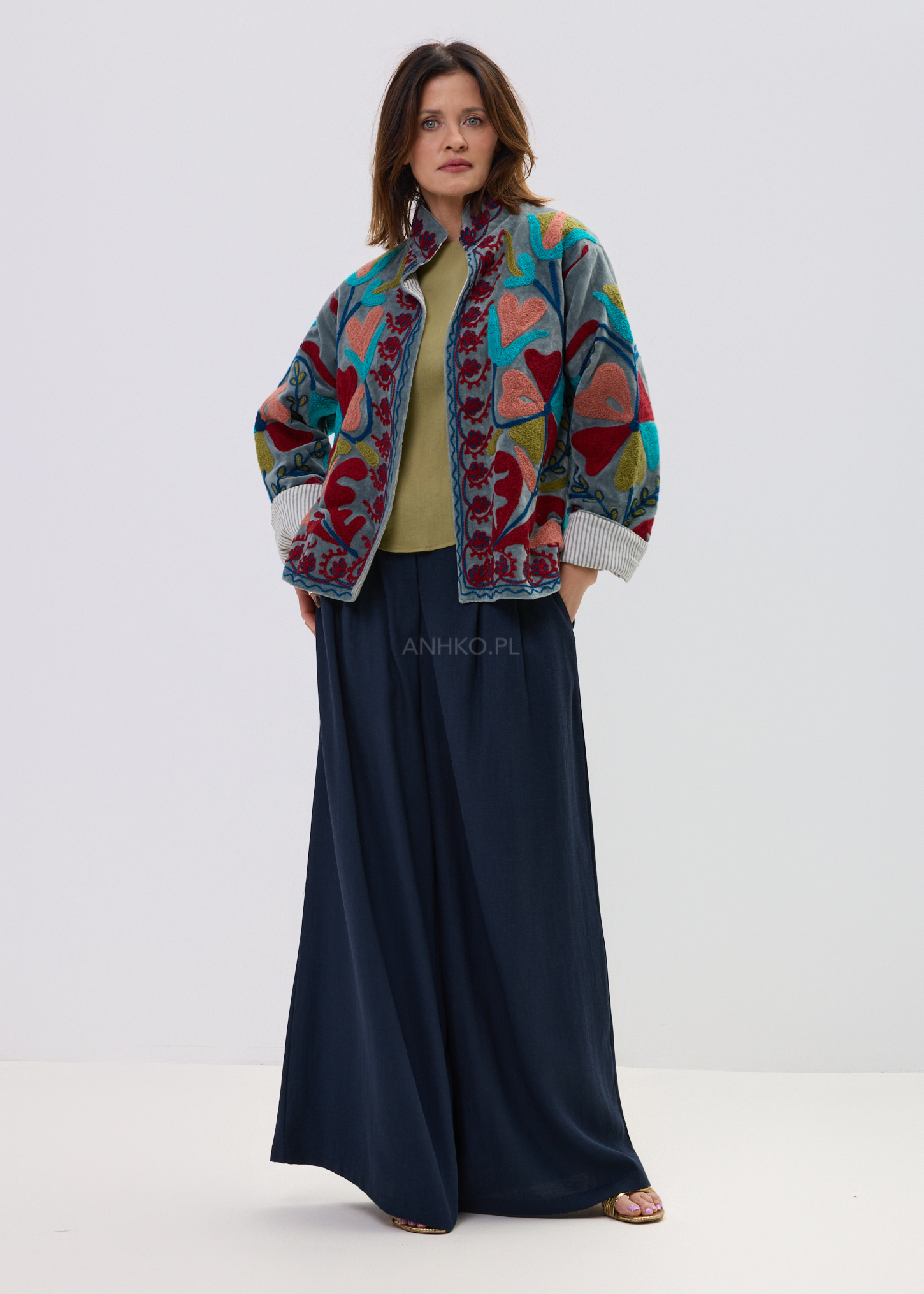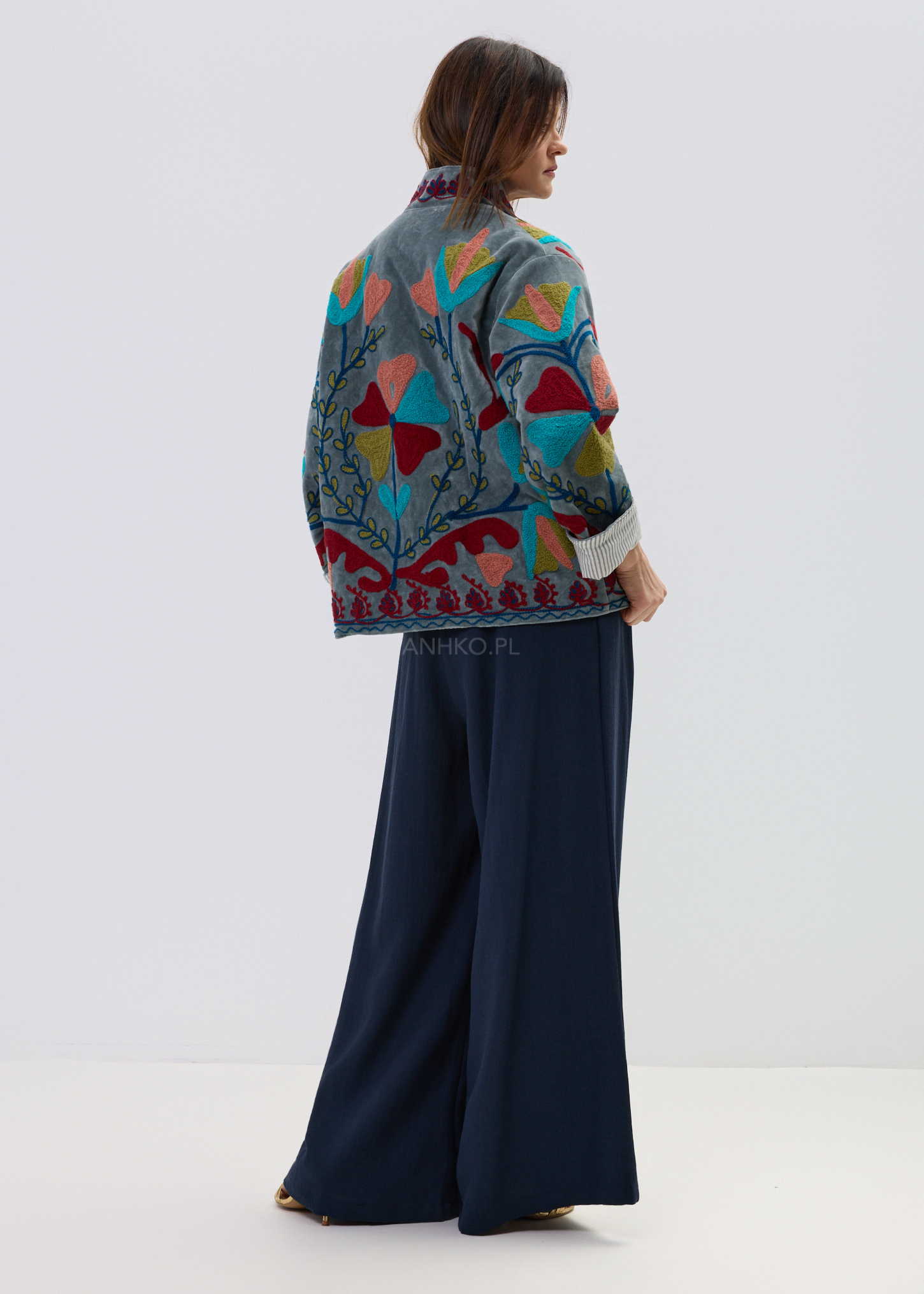 Ten żakiet damski o luźnym fasonie swobodnie układa się na sylwetce, tworząc efekt lekkiej, stylowej warstwy. Brak zapięcia nadaje mu niewymuszonego charakteru, a bogaty, kolorowy haft inspirowany naturą przyciąga spojrzenia i dodaje całości wyrazistości. To model, który łączy wygodę z artystycznym wykończeniem.
