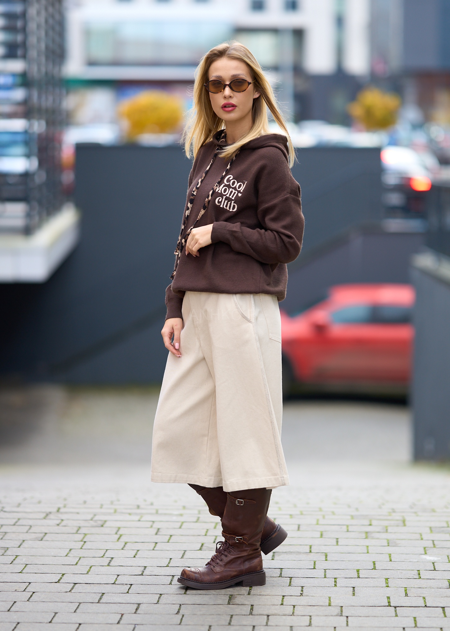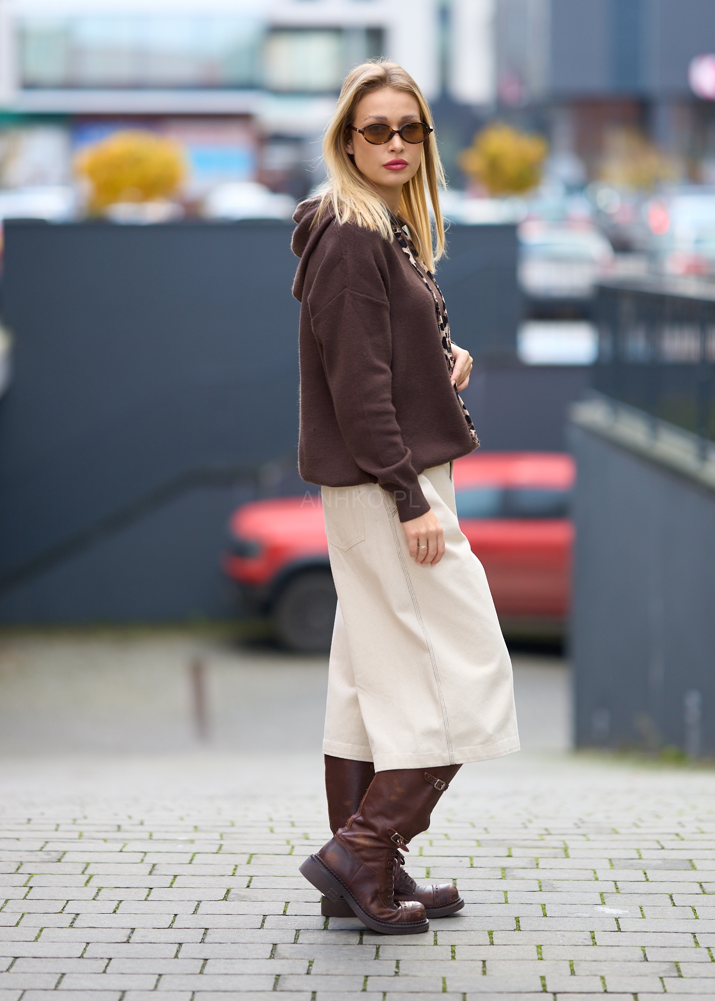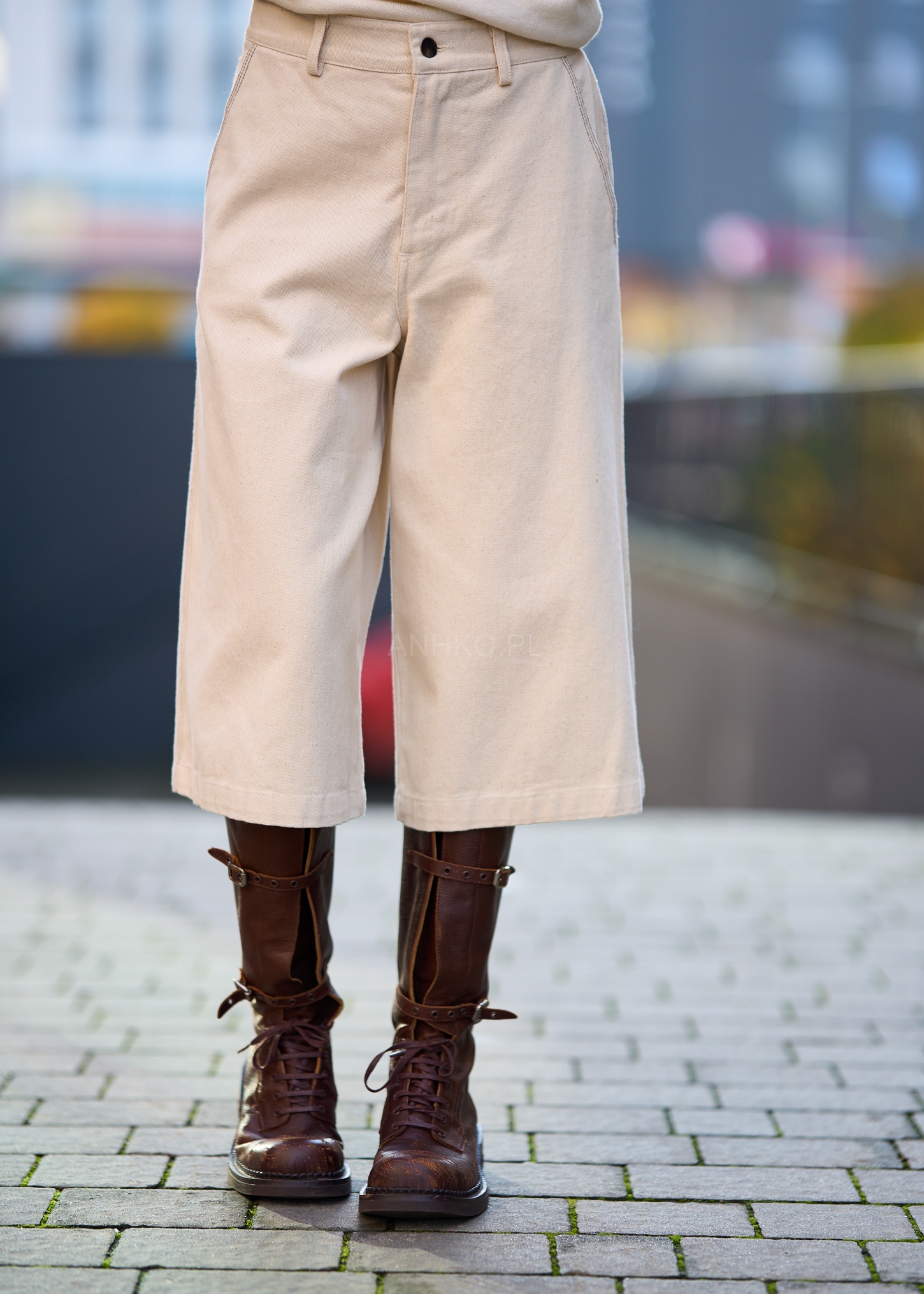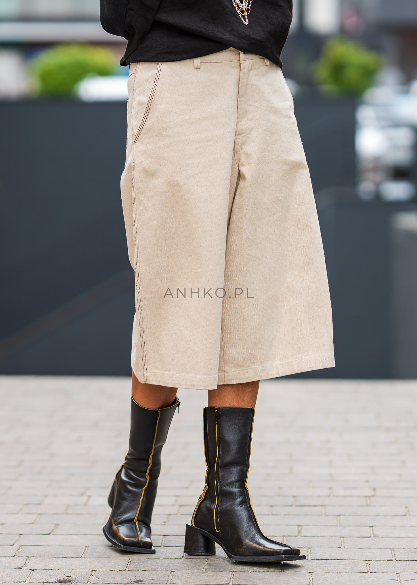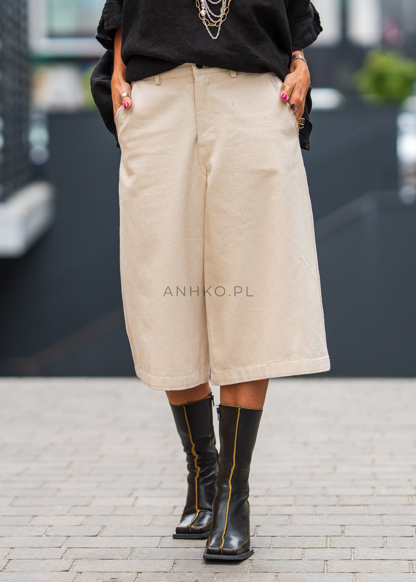Nowoczesne spodnie (bermudy) o ponadczasowym kroju, które łączą luz, wygodę i elegancki minimalizm. Szeroka nogawka oraz długość za kolano nadają im charakterystyczną, modową linię, świetnie podkreślając sylwetkę bez nadmiernego przylegania. Neutralny, beżowy kolor sprawia, że stanowią idealną bazę do wielu stylizacji – od miejskich, po bardziej wyrafinowane. Doskonale pasują do koszul, topów, oversize’owych bluzek oraz krótkich kurtek. Świetnie sprawdzą się na spotkania, spacery po mieście, do pracy czy weekendowe wyjścia. To model, który podnosi komfort, jednocześnie nie rezygnując ze stylu.