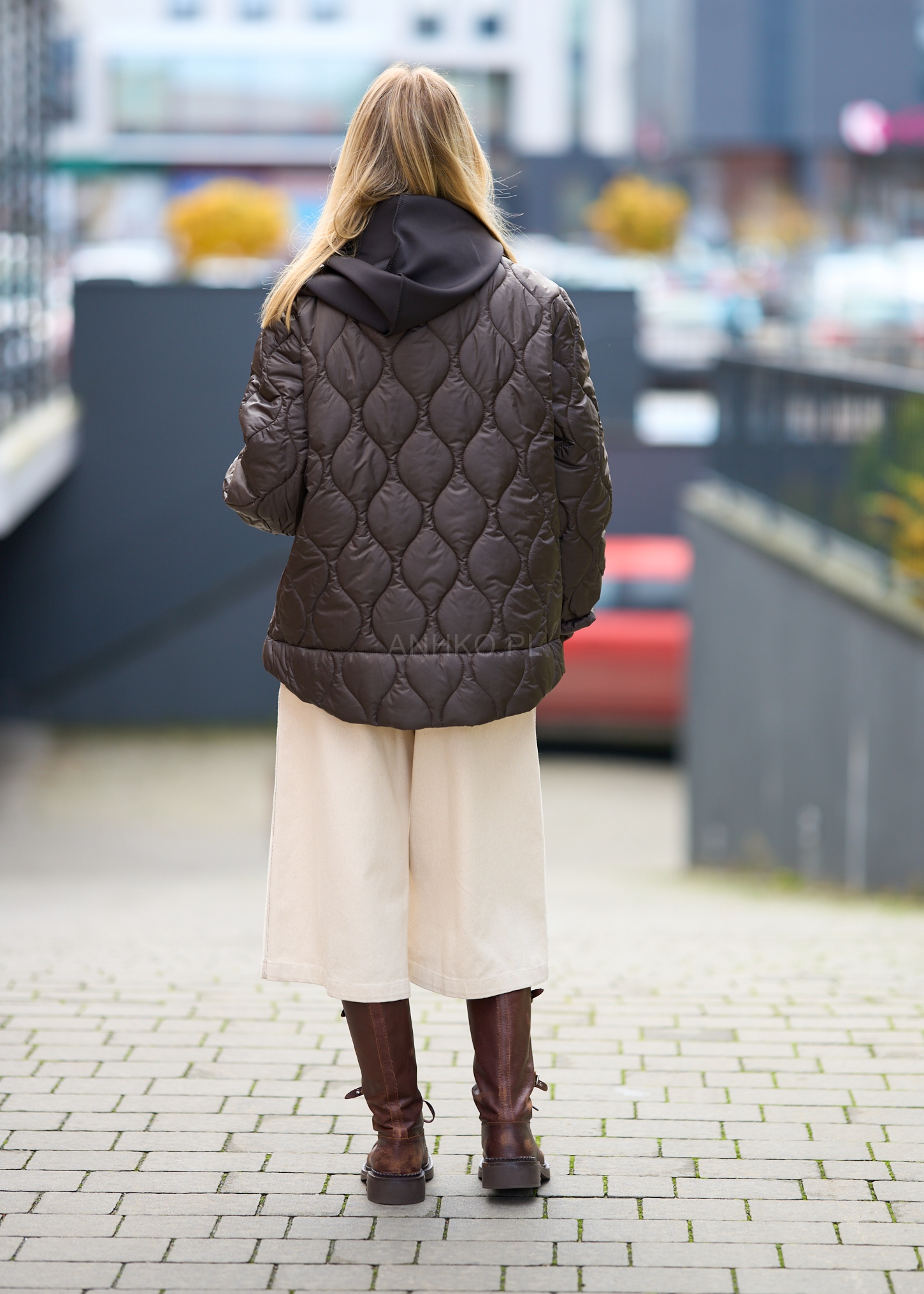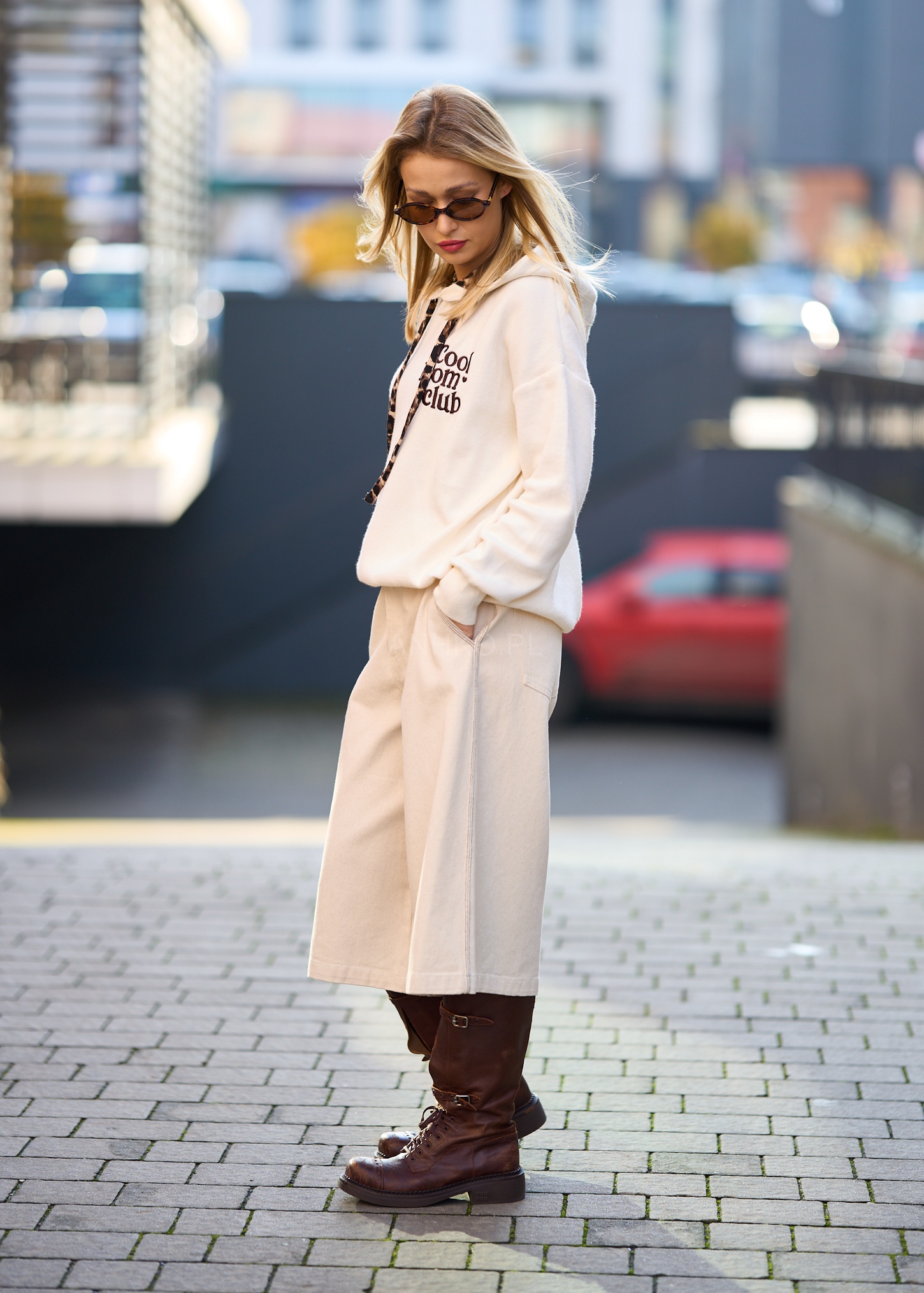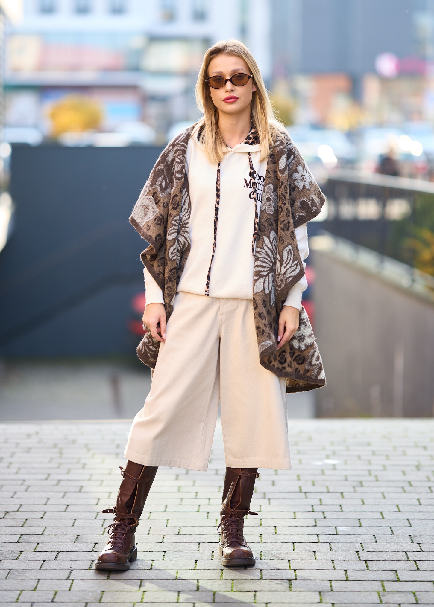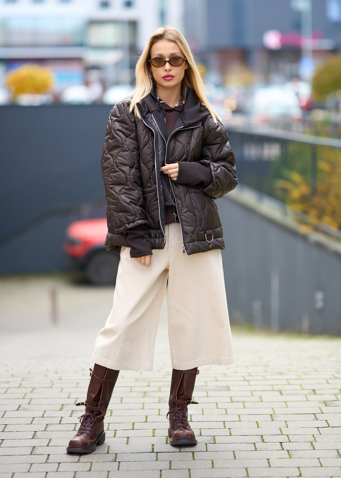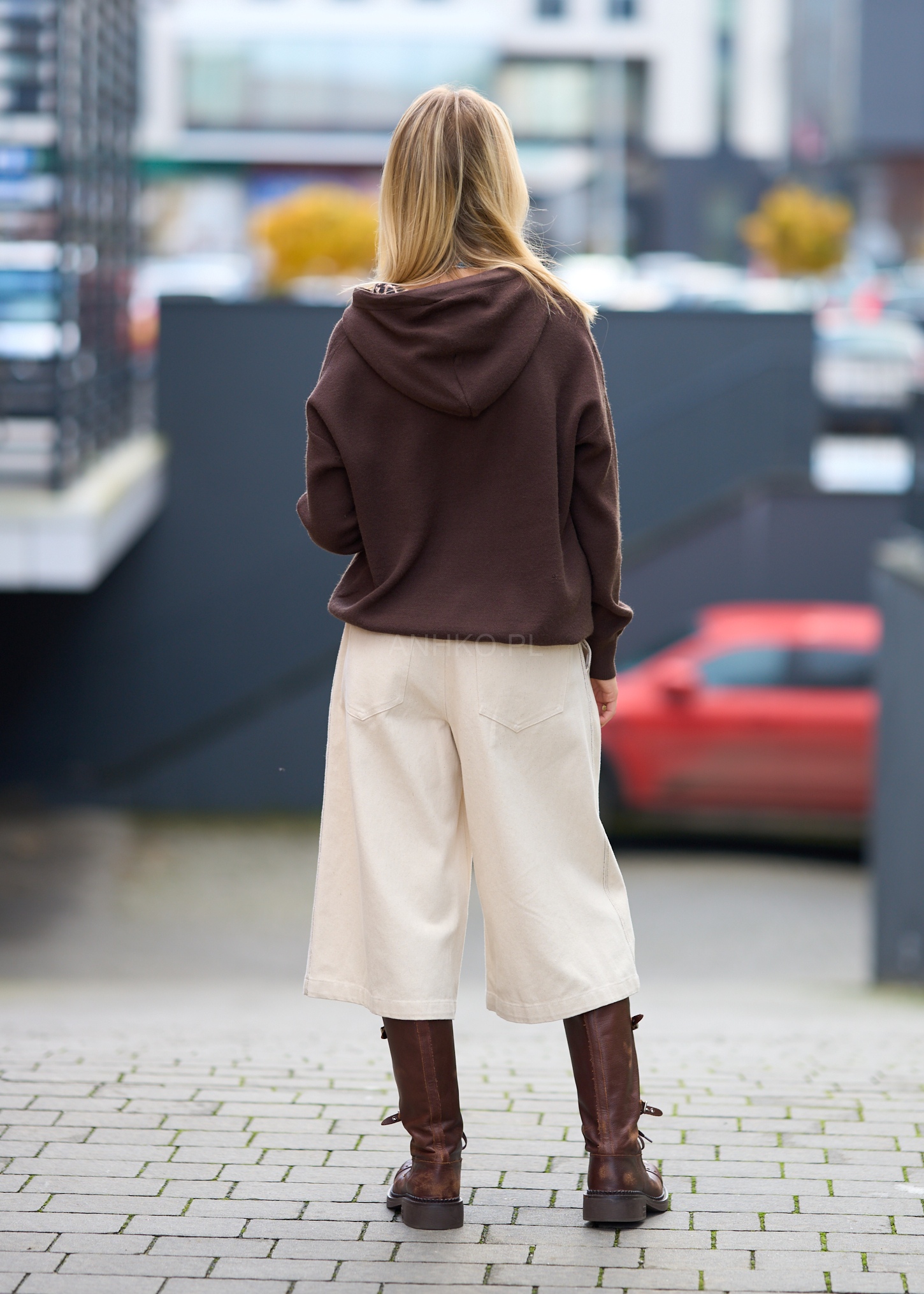 Nowoczesne spodnie (bermudy) o ponadczasowym kroju, które łączą luz, wygodę i elegancki minimalizm. Szeroka nogawka oraz długość za kolano nadają im charakterystyczną, modową linię, świetnie podkreślając sylwetkę bez nadmiernego przylegania. Neutralny, beżowy kolor sprawia, że stanowią idealną bazę do wielu stylizacji – od miejskich, po bardziej wyrafinowane. Doskonale pasują do koszul, topów, oversize’owych bluzek oraz krótkich kurtek. Świetnie sprawdzą się na spotkania, spacery po mieście, do pracy czy weekendowe wyjścia. To model, który podnosi komfort, jednocześnie nie rezygnując ze stylu.