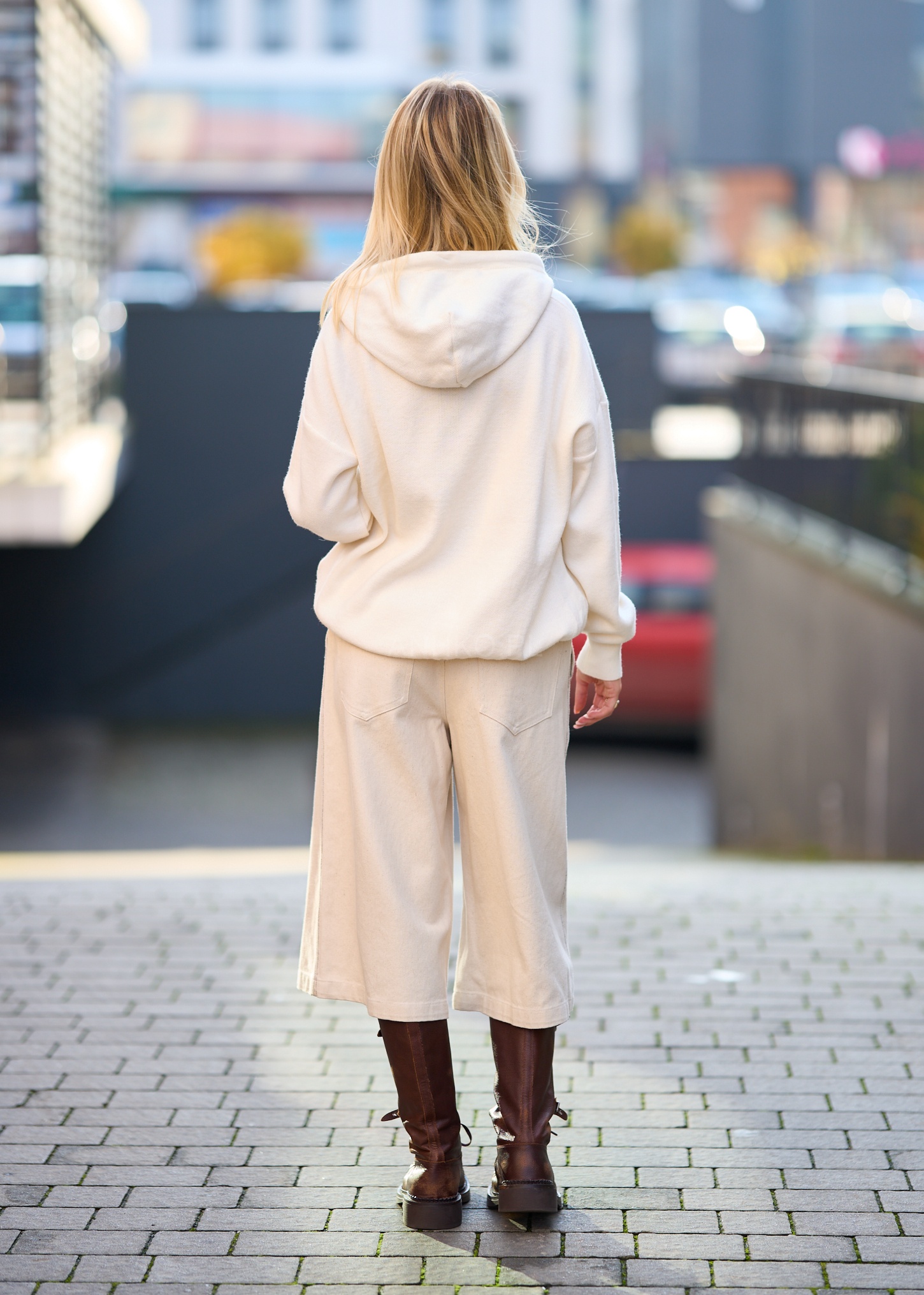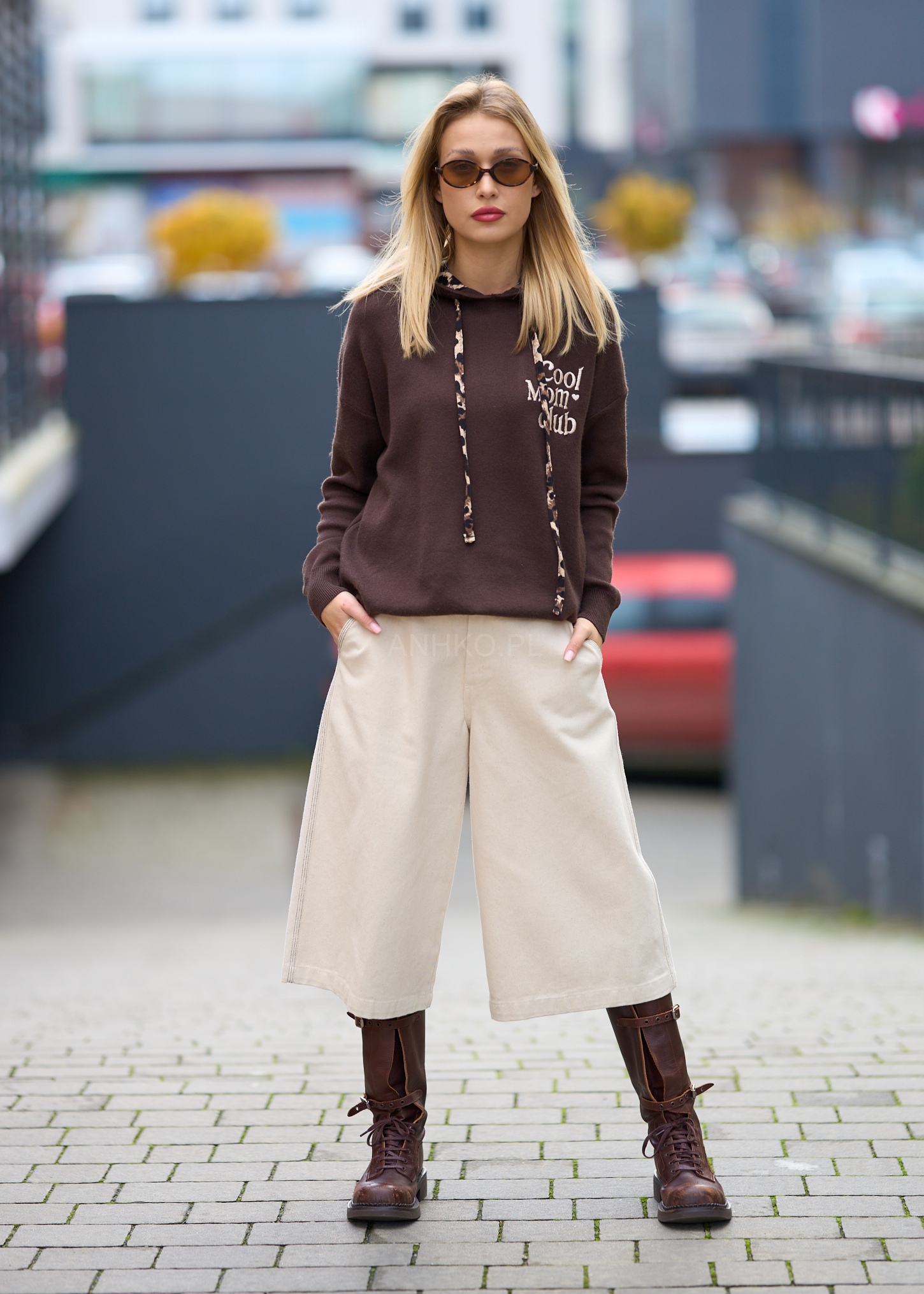 Bluza Cool Mom Kremowa - Stylowa bluza z kapturem w kolorze kremowym z haftem Cool Mom Club. Wyróżnia się wnętrzem kaptura i troczkami w panterkowy wzór. Miękka, elastyczna i wygodna – idealna na co dzień, do jeansów lub casualowych stylizacji.