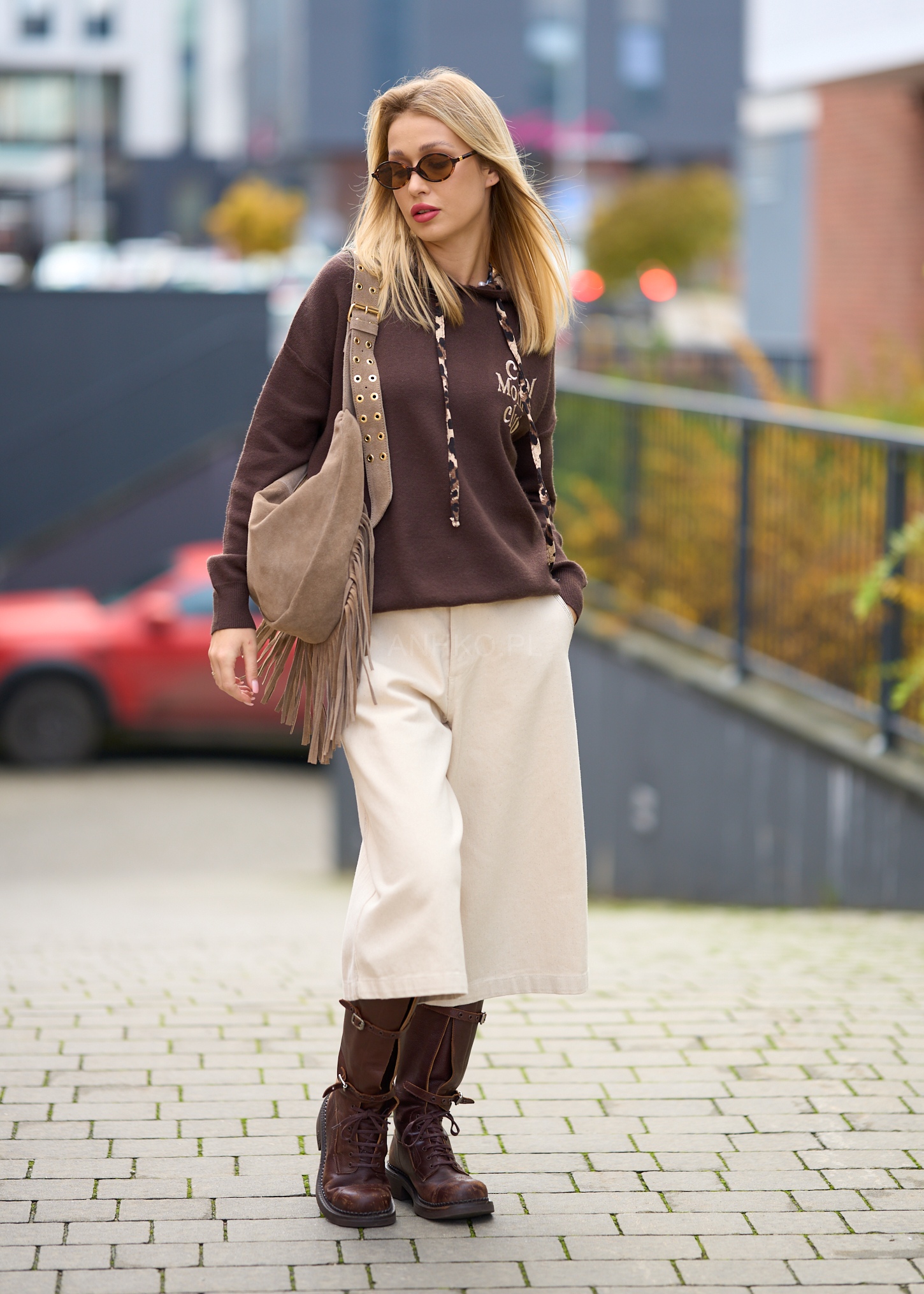 Bluza Cool Mom Brązowa - Stylowa bluza z kapturem w kolorze czekoladowym z haftem Cool Mom Club. Wyróżnia się wnętrzem kaptura i troczkami w panterkowy wzór. Miękka, elastyczna i wygodna – idealna na co dzień, do jeansów lub casualowych stylizacji.