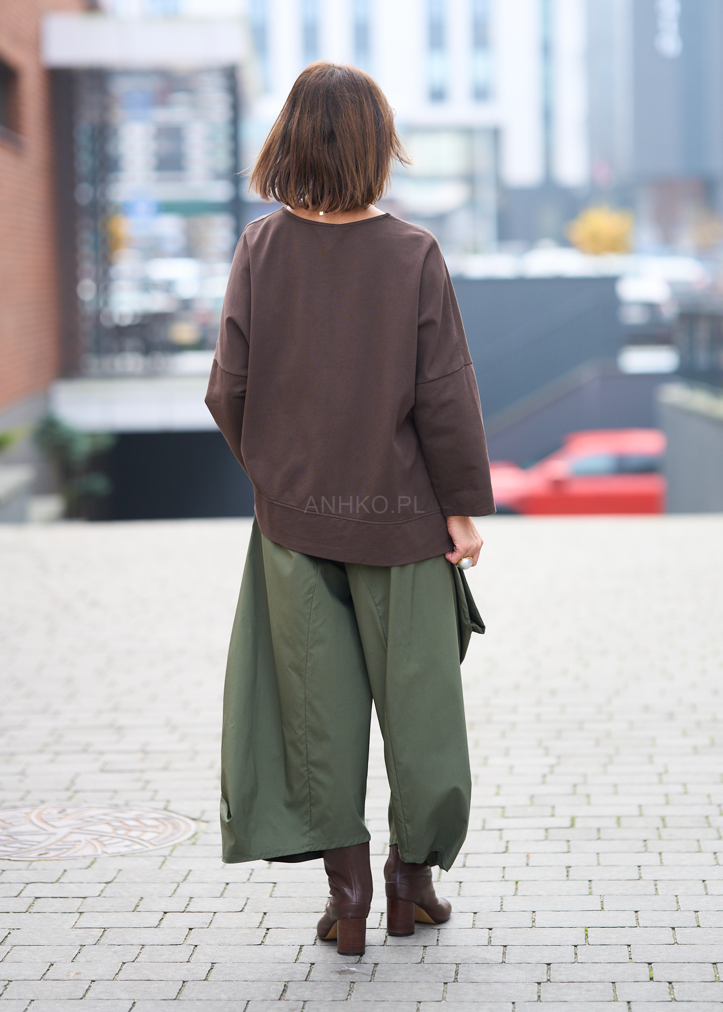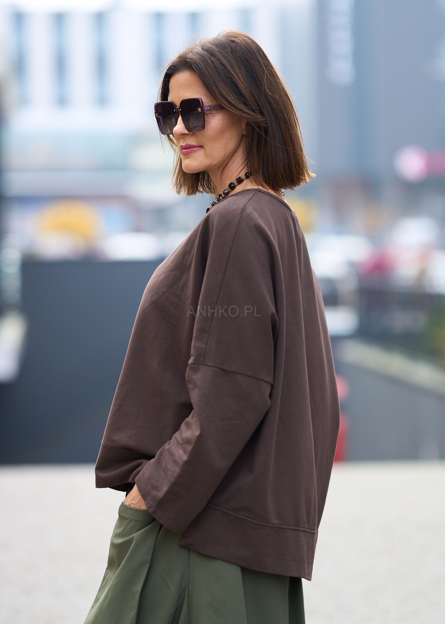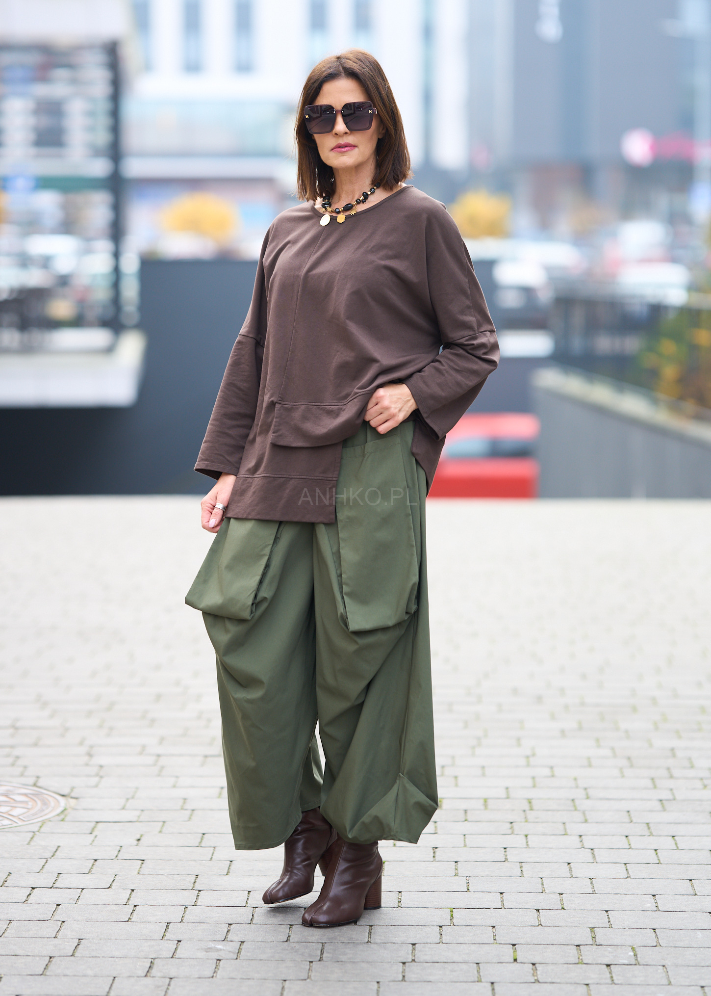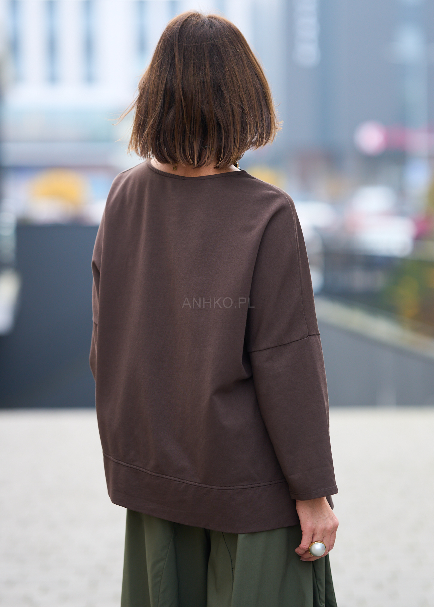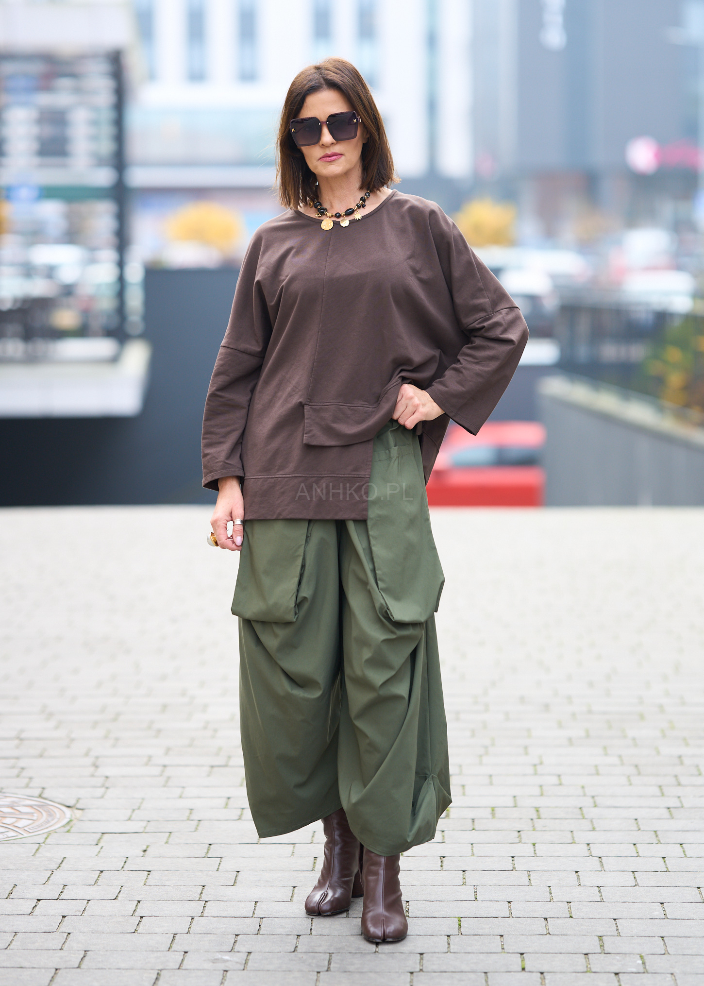 Bluza z przeszyciami i asymetrycznym dołem to doskonały wybór dla tych, którzy szukają lekkiego, ale stylowego elementu garderoby. Przeszycia dodają jej teksturalnego zainteresowania, a asymetryczny dół nadaje jej oryginalnego wyglądu. Dłuższy krój sprawia, że jest idealna do noszenia z np. legginsami, dodając swobody i luzu całej stylizacji. To świetna opcja na codzienne noszenie, gdy chcesz wyglądać modnie, ale również czuć się wygodnie.
