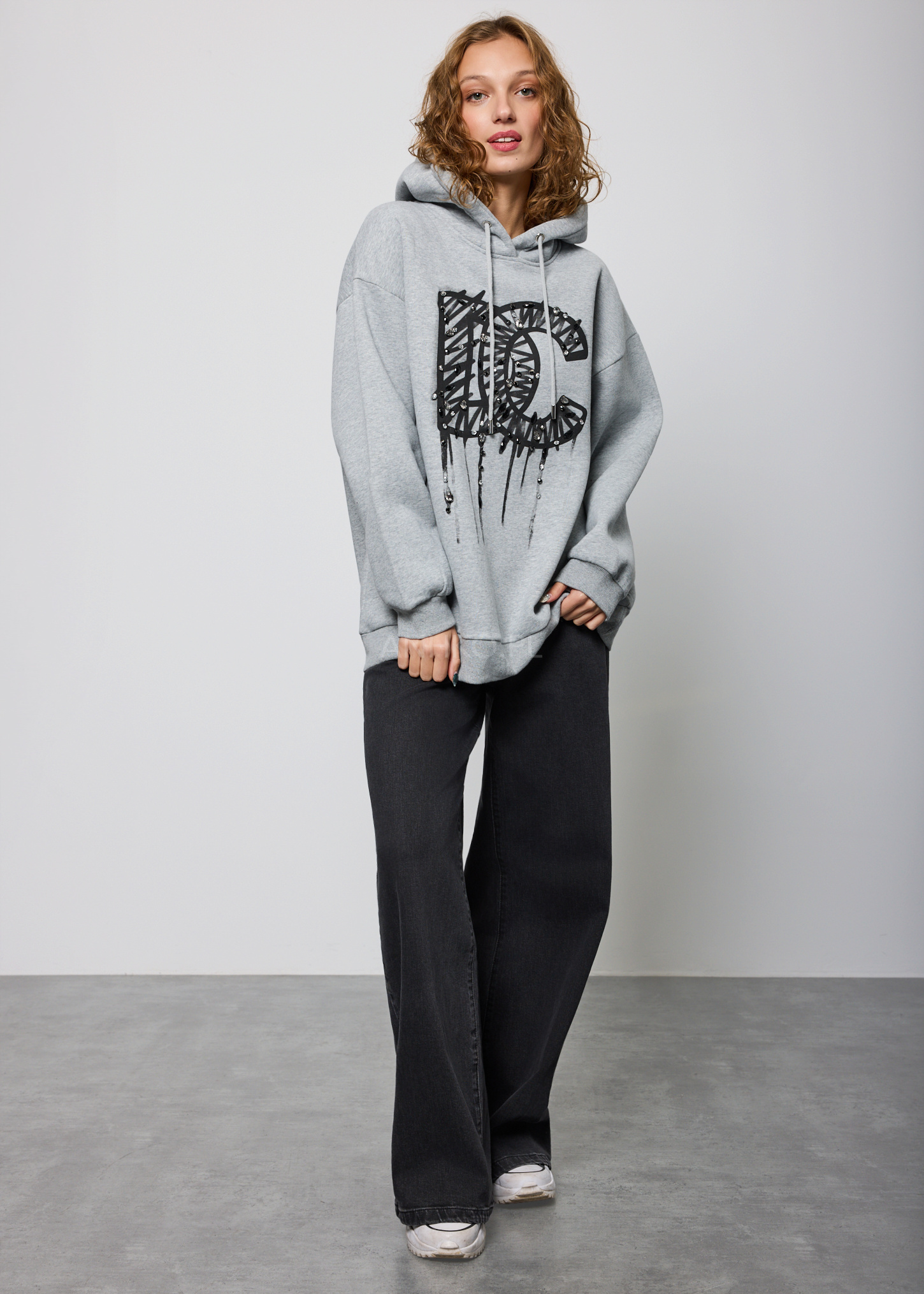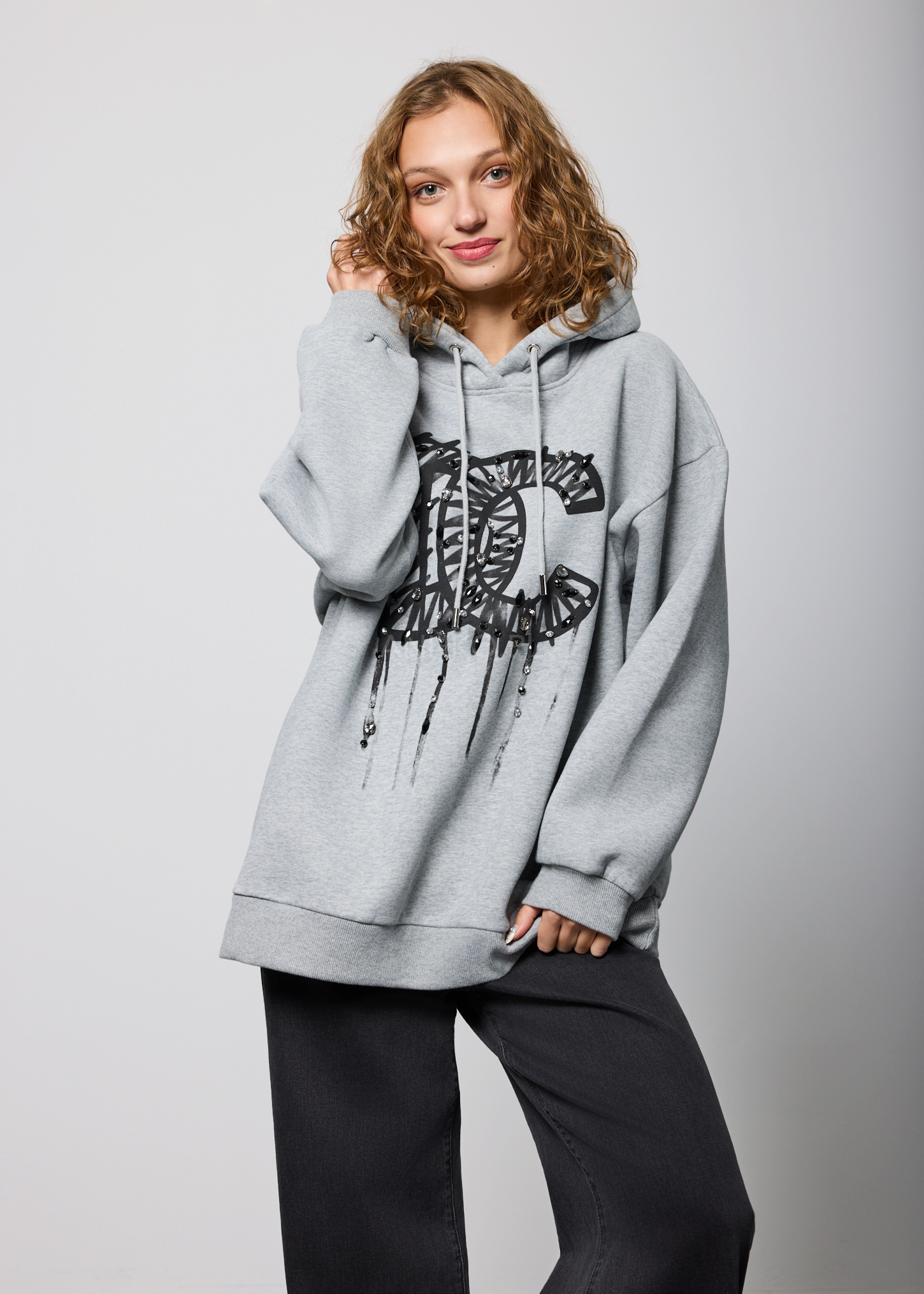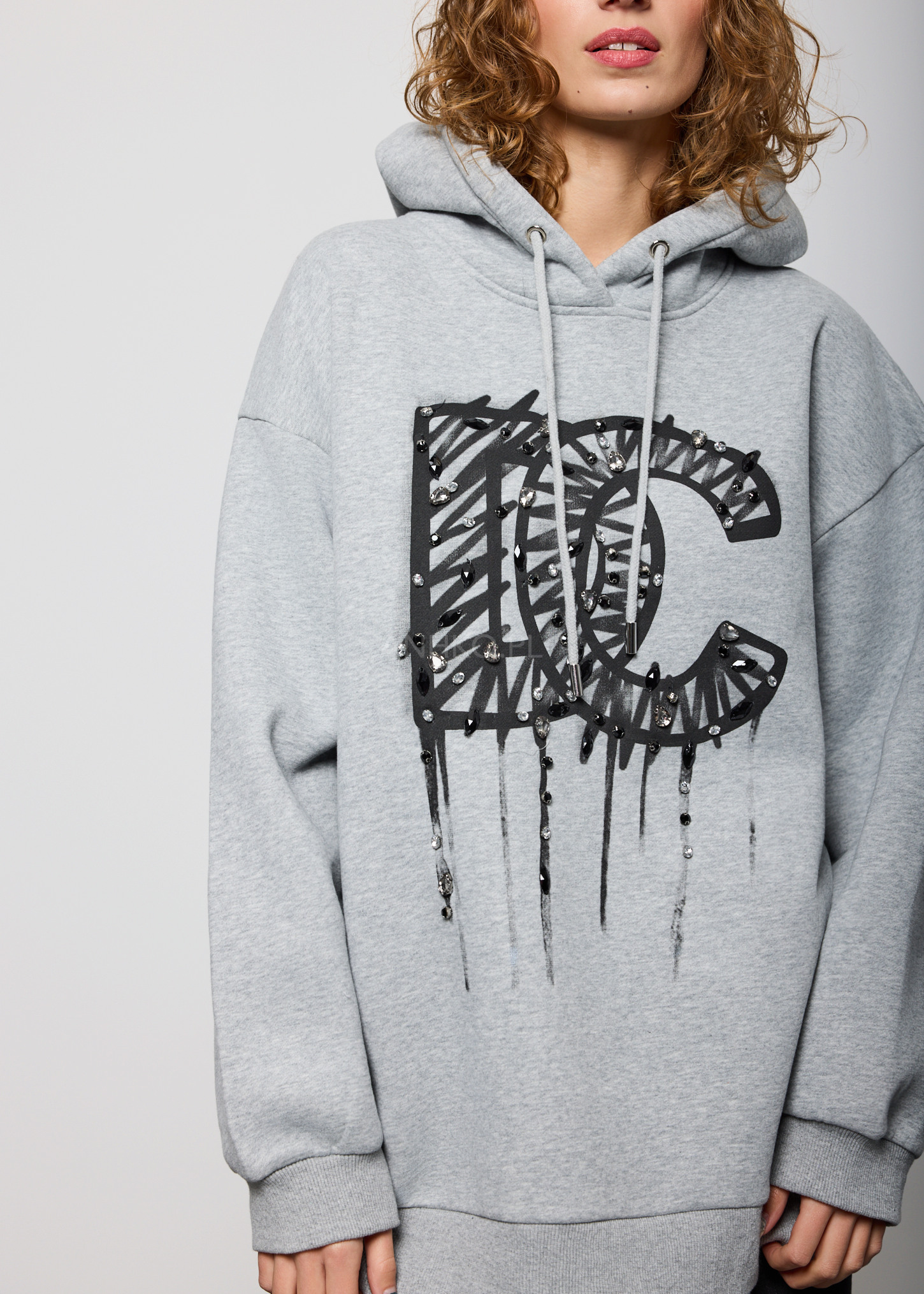 Bluza oversize z kapturem to swobodny i stylowy element garderoby. Jej luźny fason zapewnia wygodę noszenia, a duży kaptur dodaje jej nowoczesności. Na froncie bluzy widoczne są duże litery "DC" oraz charakterystyczne cyrkonie, co nadaje jej dynamicznego i miejskiego charakteru. Ta bluza to idealny wybór dla osób ceniących streetwearowy styl i chcących wyrazić swój entuzjazm wobec kultury miejskiej. To nie tylko wygodna opcja na co dzień, ale także sposób na wyrazistą i pełną charakteru stylizację.