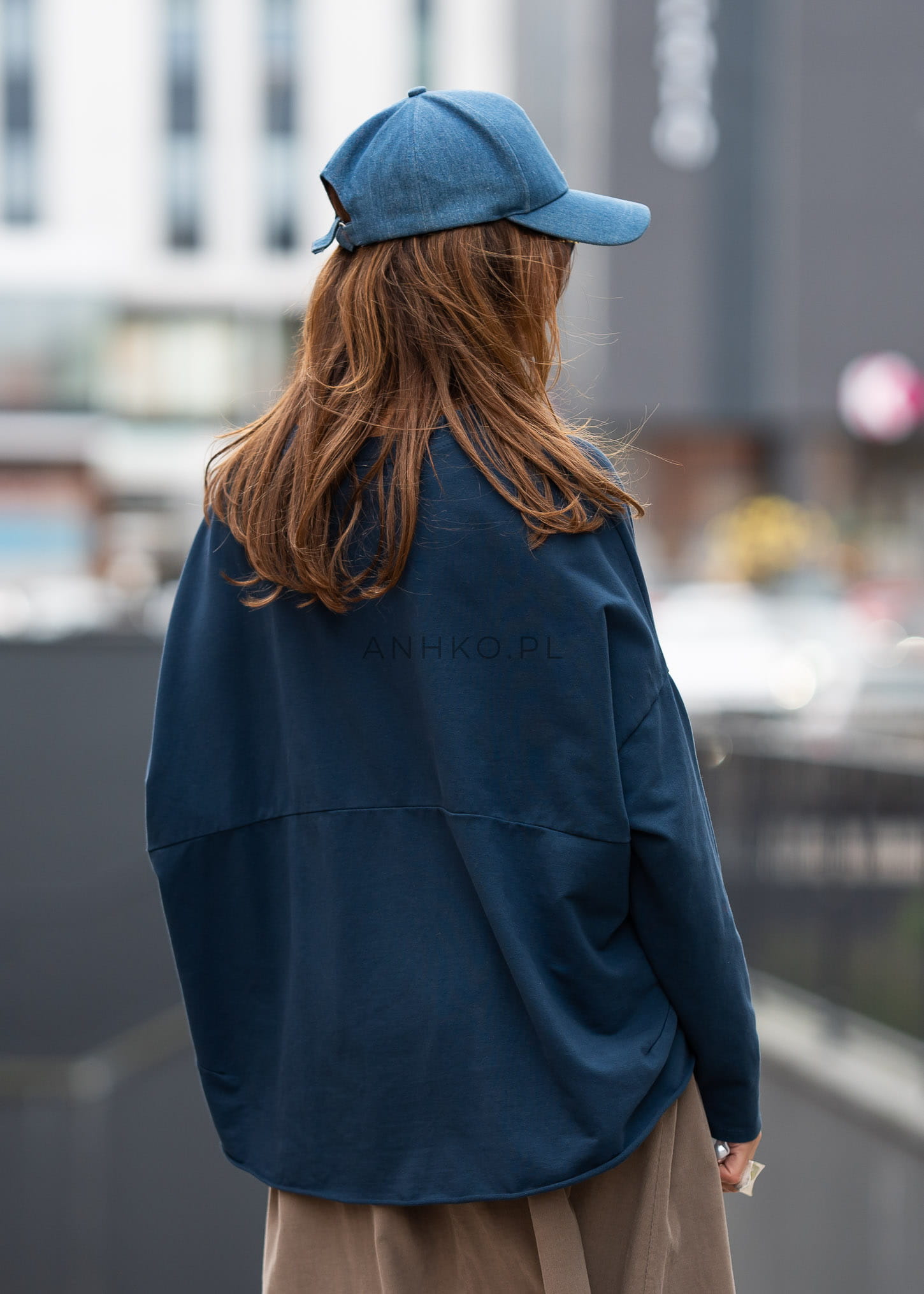 Ta bluza oversize w odcieniu ciemnego niebieskiego tworzy wyrazistą, a jednocześnie ponadczasową bazę stylizacji. Luźny fason miękko układa się na sylwetce, zapewniając komfort i swobodę ruchów, a obniżona linia ramion nadaje całości modowego, miejskiego charakteru. To model, który świetnie odnajduje się zarówno w codziennych, jak i bardziej dopracowanych zestawach.