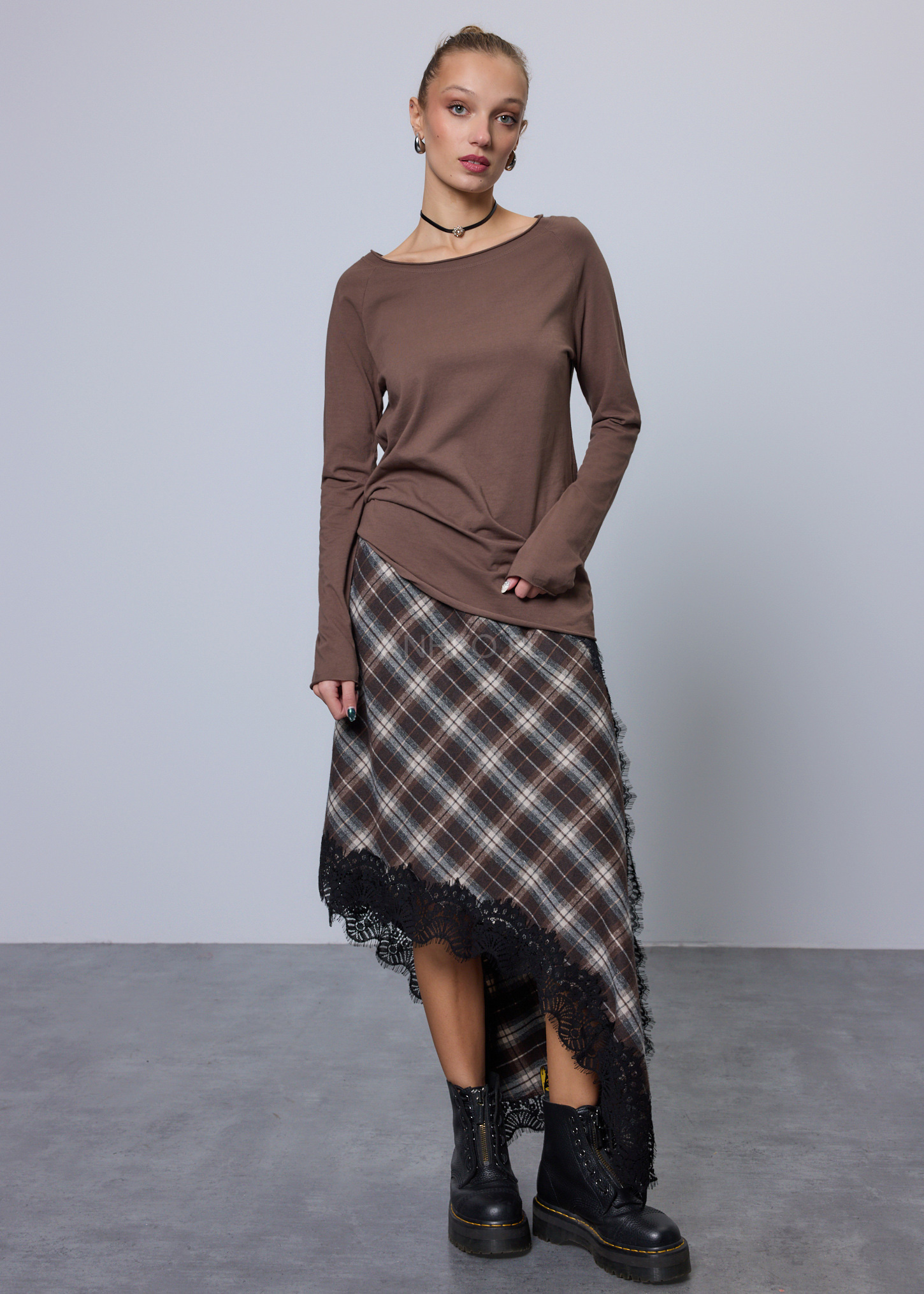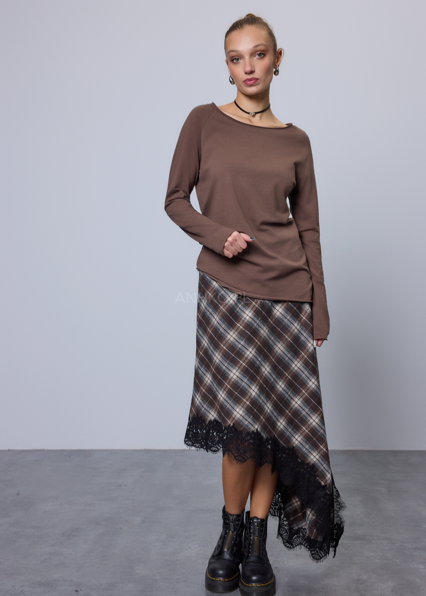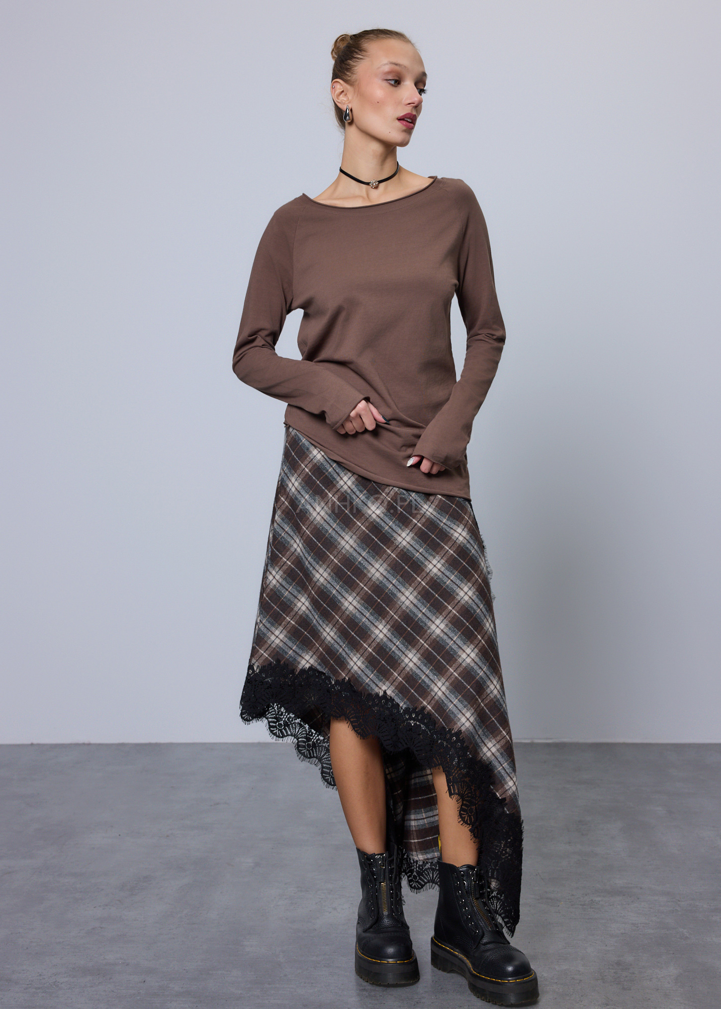 Spódnica Marsetta Brązowo-Szara - Stylowa spódnica w kratę z koronkowym wykończeniem o delikatnie asymetrycznym kroju. Łączy klasyczną estetykę z kobiecym akcentem, idealna na co dzień i na elegantsze wyjścia. Lekka, wygodna i świetnie układająca się na sylwetce.