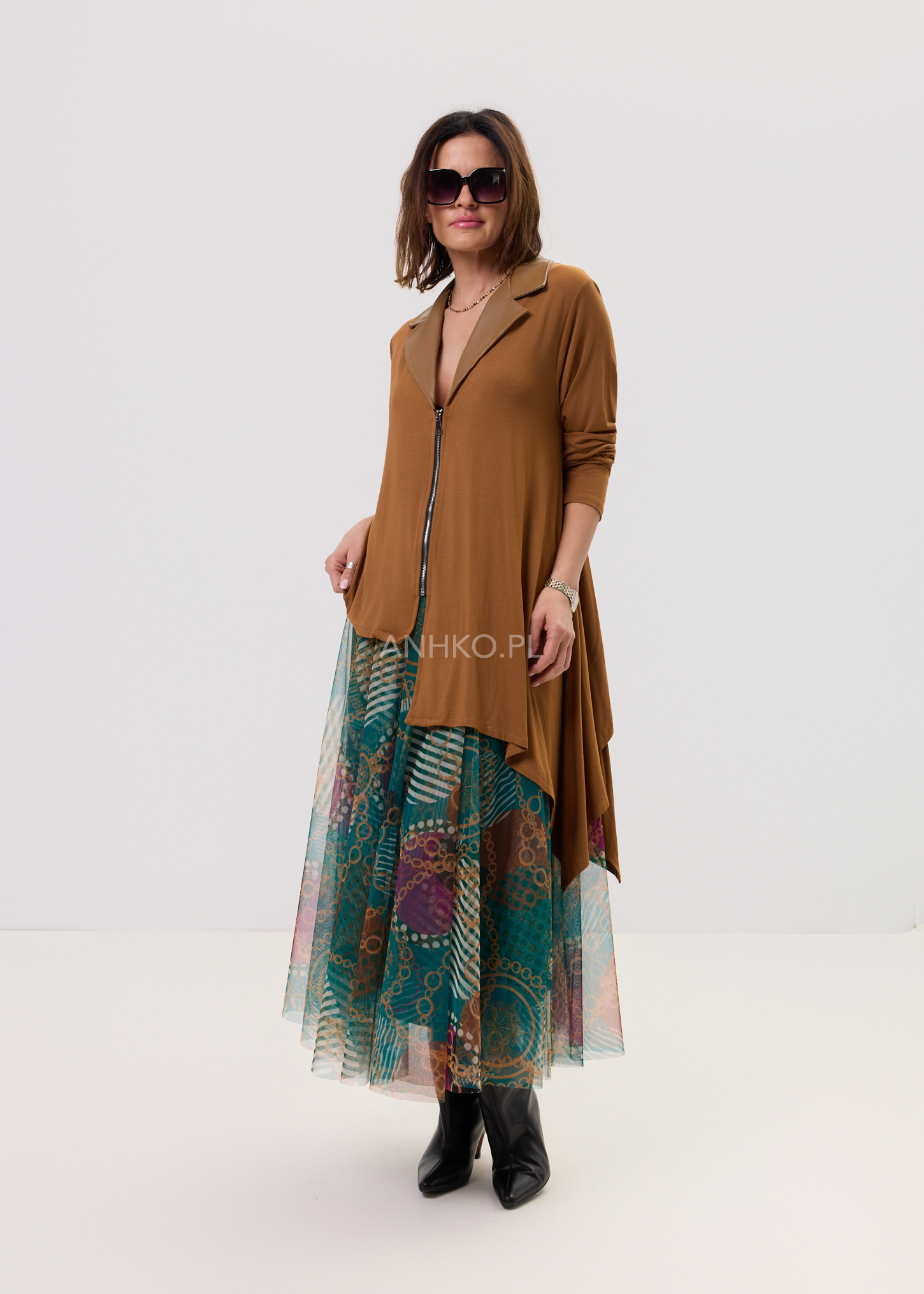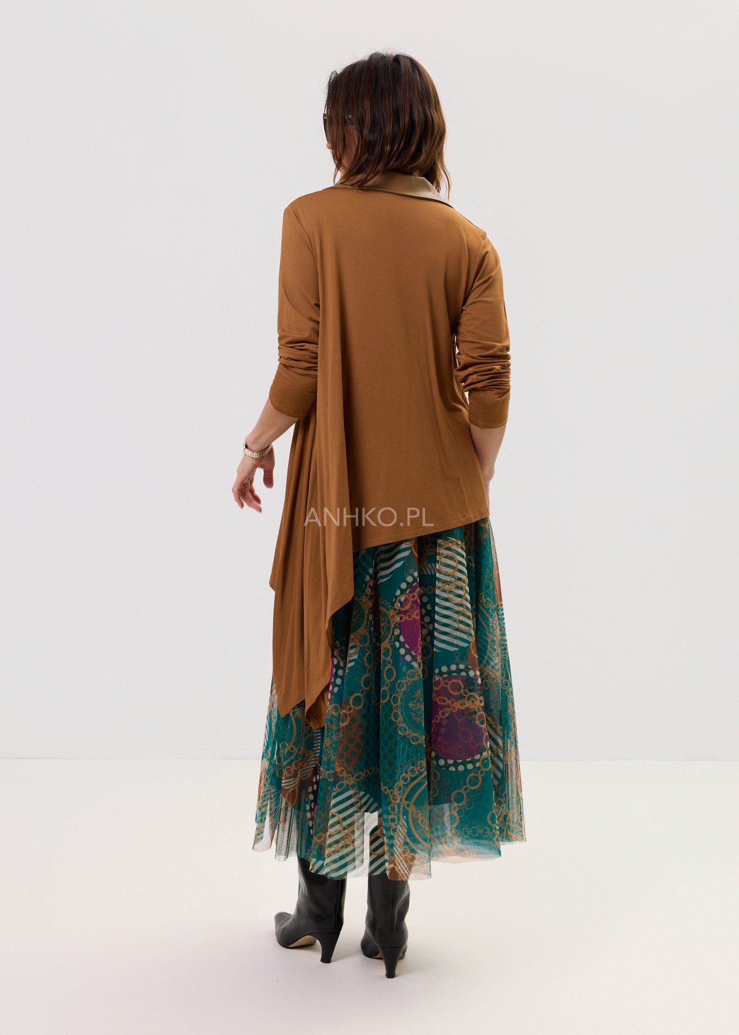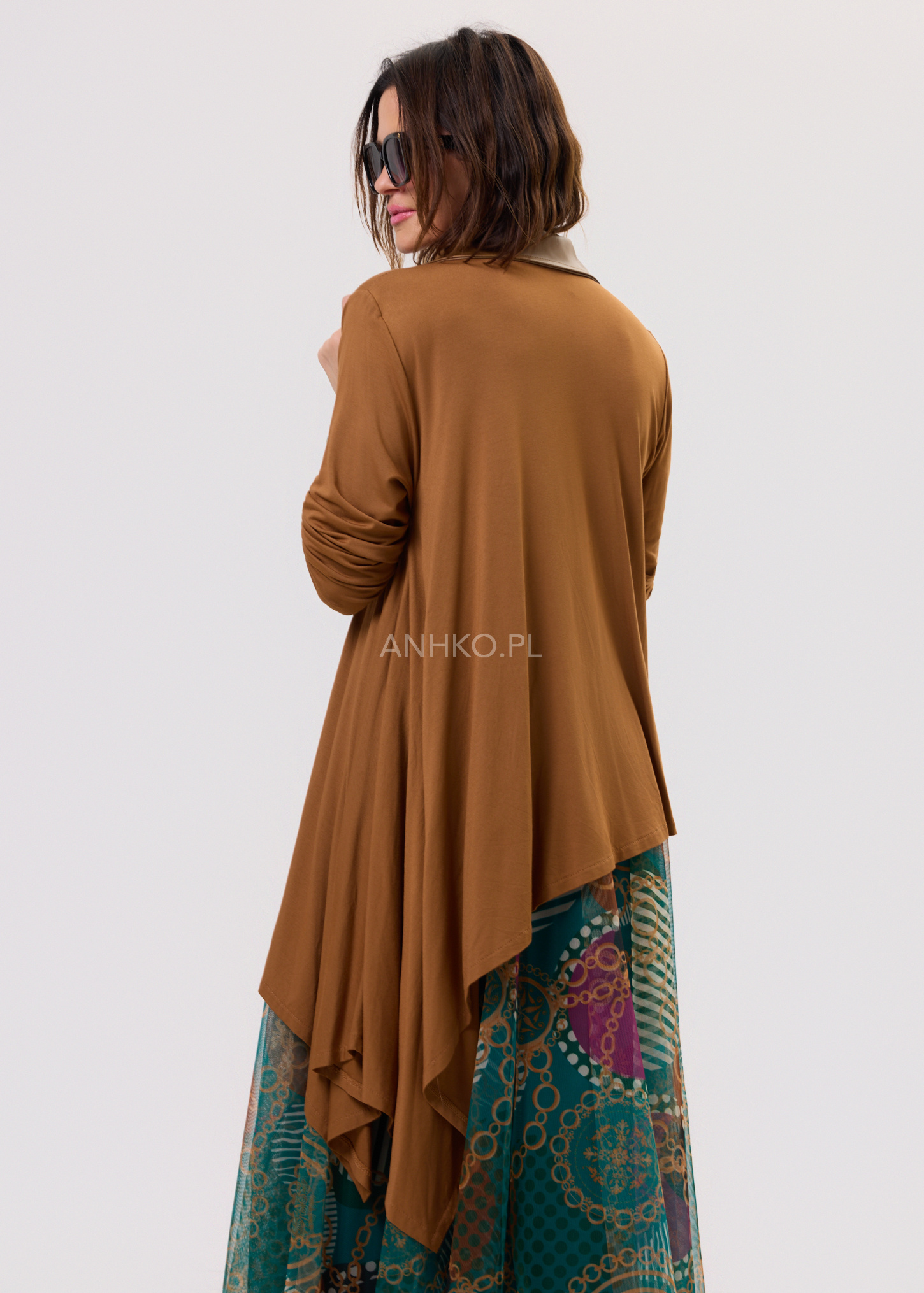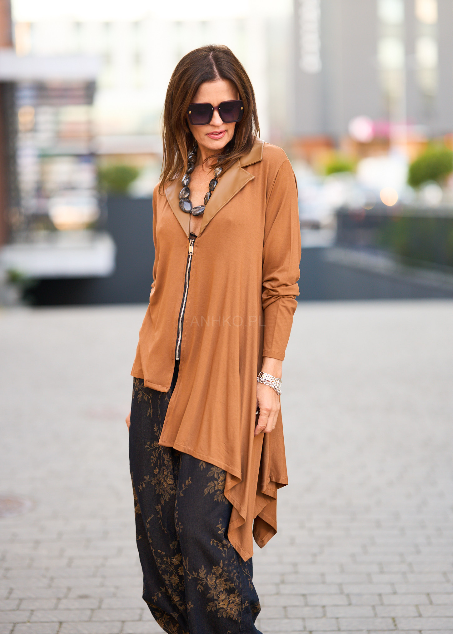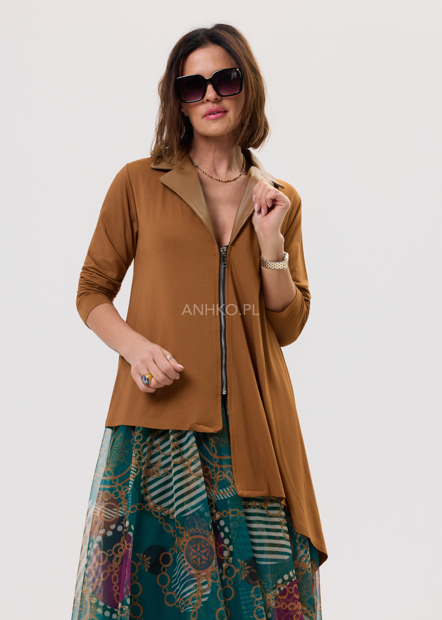 Bluzka Faux Leather Collar Camel - Podkreśl swój wyjątkowy styl dzięki tej nowoczesnej, asymetrycznej bluzce z eleganckim ekoskórzanym kołnierzem. Jej nietuzinkowy design sprawia, że z łatwością wyróżnisz się w tłumie. Asymetryczny zamek z przodu nadaje jej charakteru, a miękka wiskoza zapewnia komfort noszenia i pięknie układa się na sylwetce. Ta bluzka to idealny wybór na różne okazje – od codziennych wyjść po bardziej formalne spotkania. Doskonała do stylizacji z jeansami, sukienkami czy spódnicami.