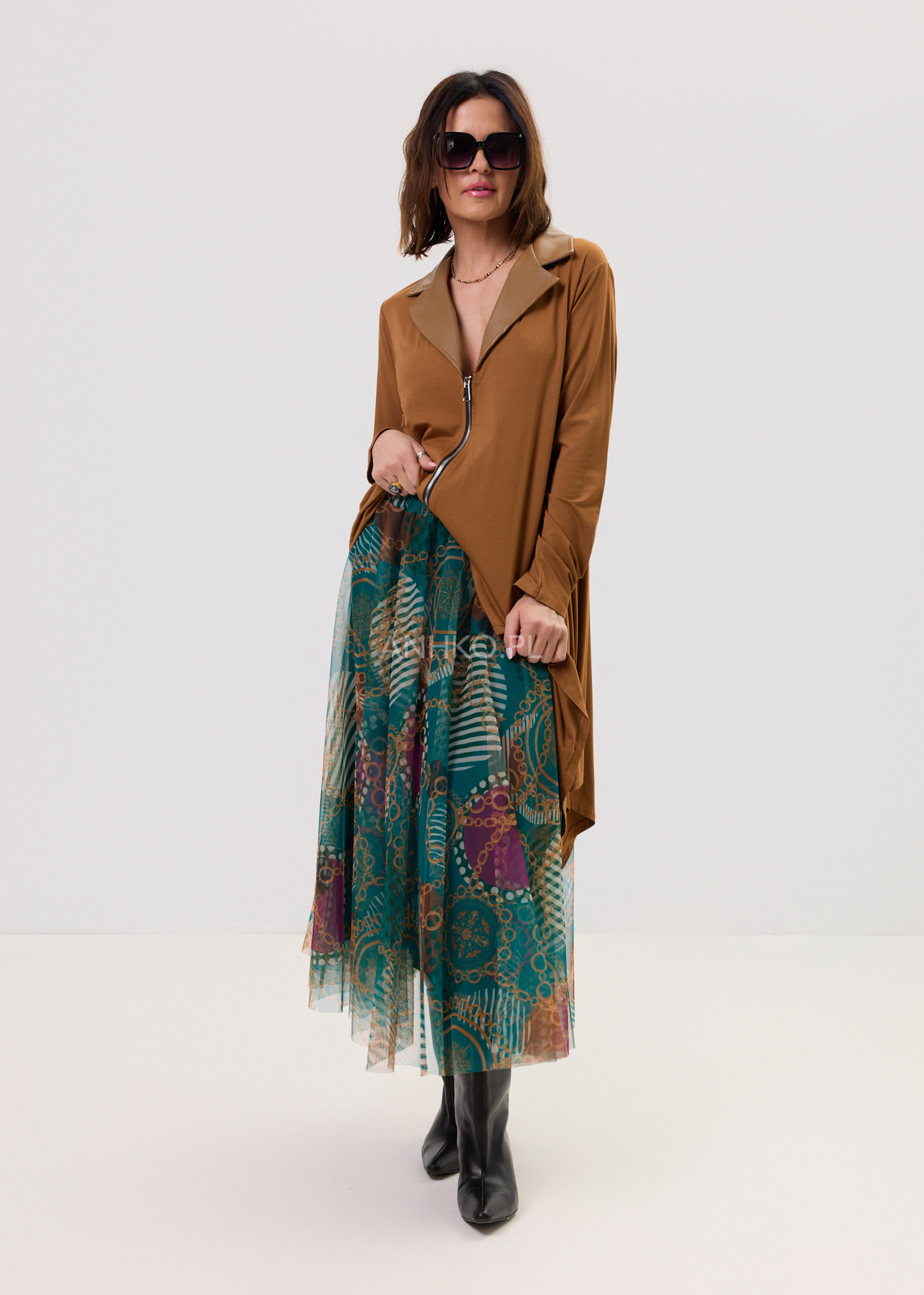 Spódnica Lunareth Chain Drain Zielona - Efektowna spódnica midi z transparentną warstwą tiulu i miękką podszewką. Ciemna zieleń w połączeniu ze złotym printem tworzy mocny, stylowy akcent. Idealna do stylizacji casual chic – na co dzień i na wyjście.