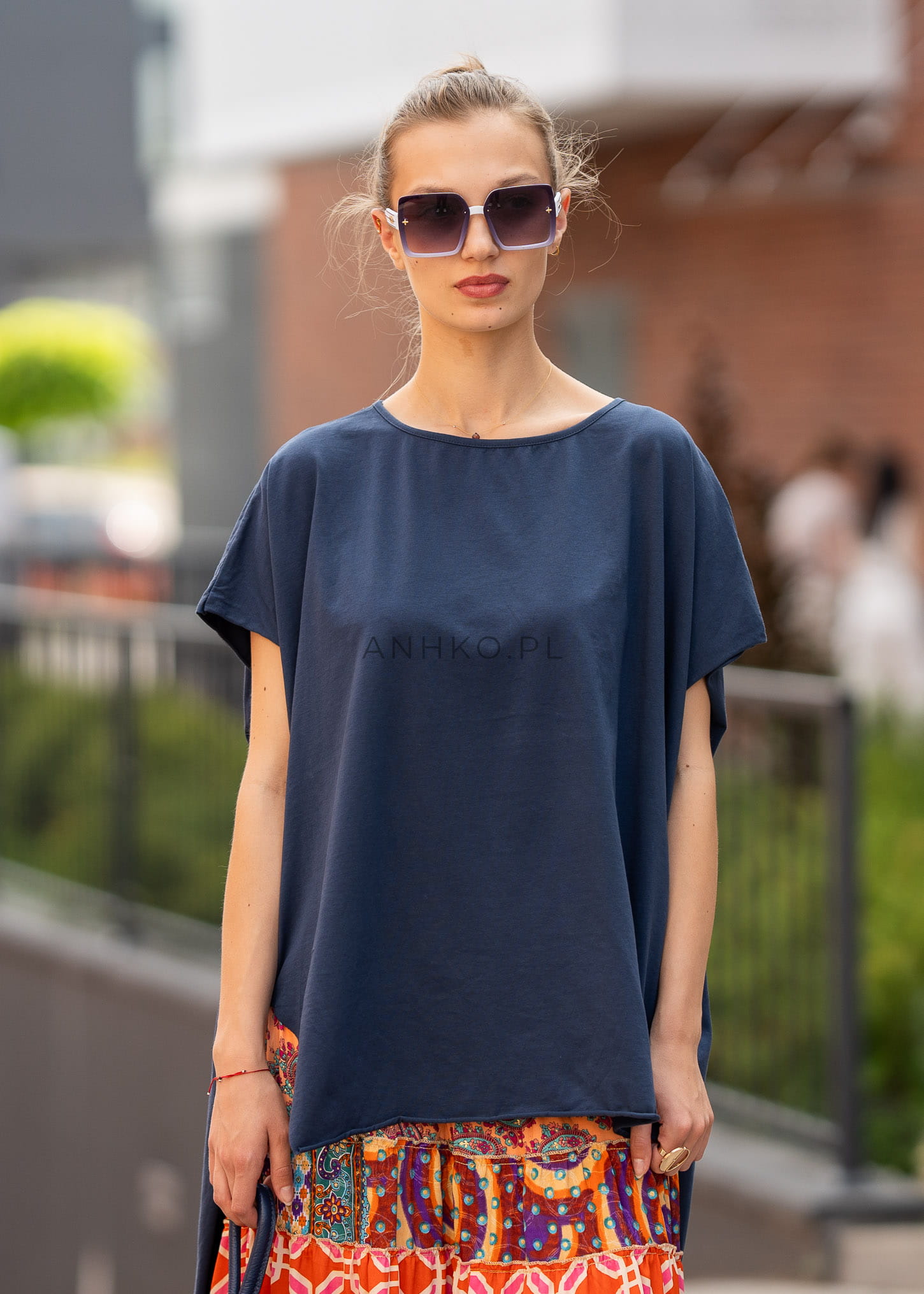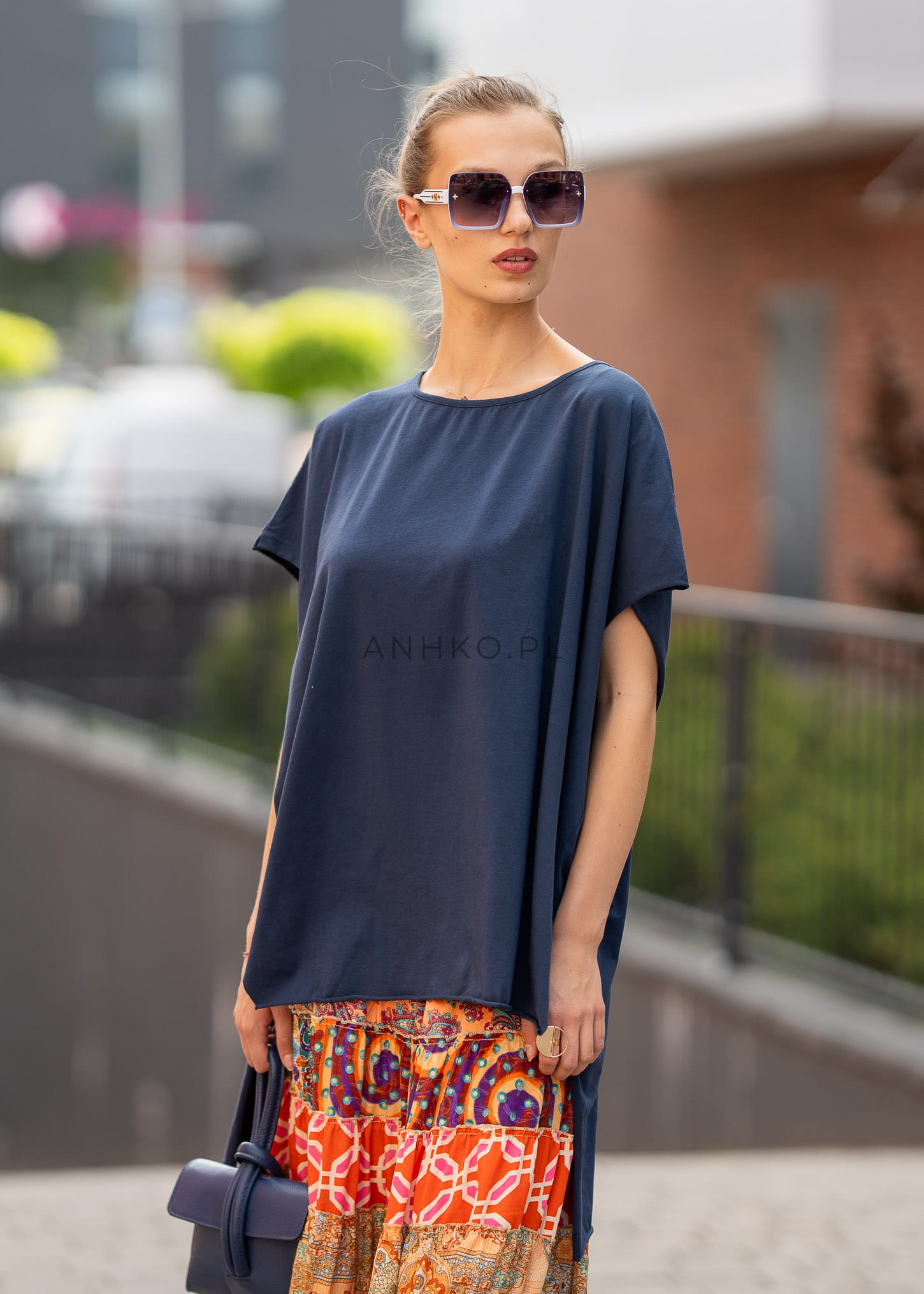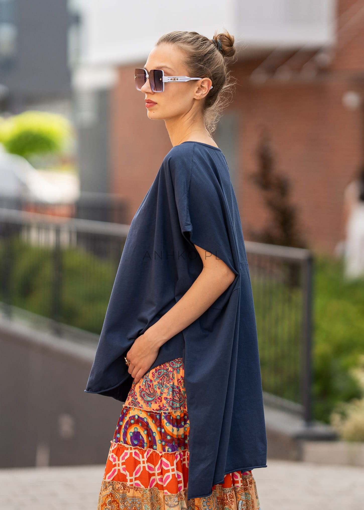 Granatowy kolor dodaje stylizacji elegancji i głębi, pozostając jednocześnie uniwersalnym wyborem na różne okazje. Rozcięcia po bokach oraz prosty krój sprawiają, że model doskonale współgra zarówno z casualowymi, jak i bardziej dopracowanymi zestawami.